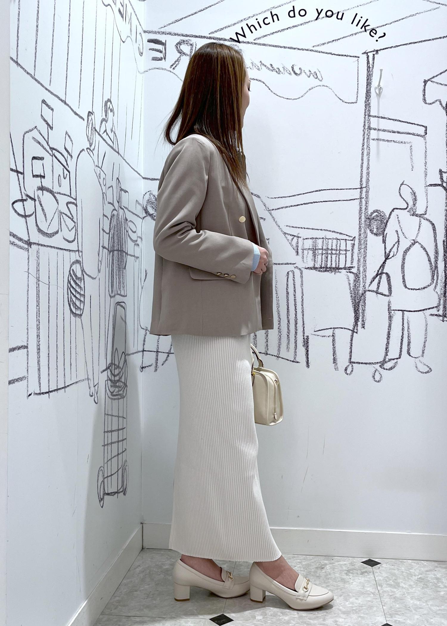 一枚でレイヤードスタイルが出来るポロニットとIラインのスカートを合わせたシンプルだけどオシャレに見えるコーデです。春のお出かけにぴったり。まだ肌寒い時には、金釦のジャケットを羽織ると素敵です。