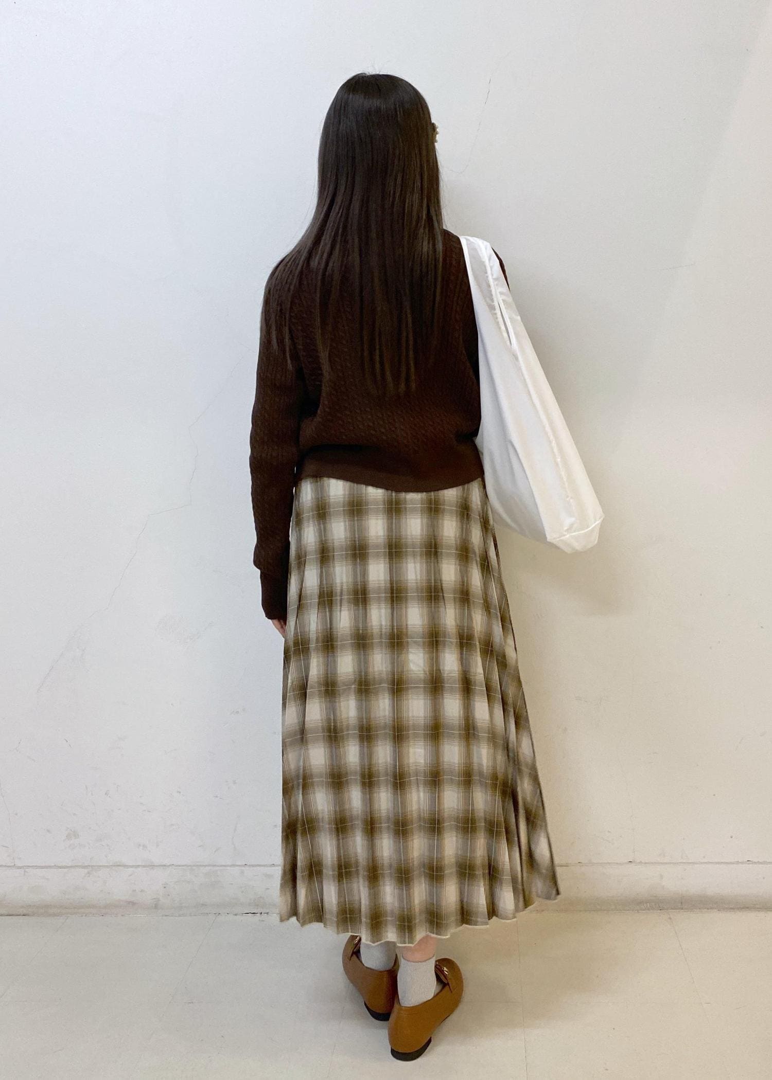 カーディガンの丈がすっきりしているので、ロング丈のスカートでバランスを取っています。