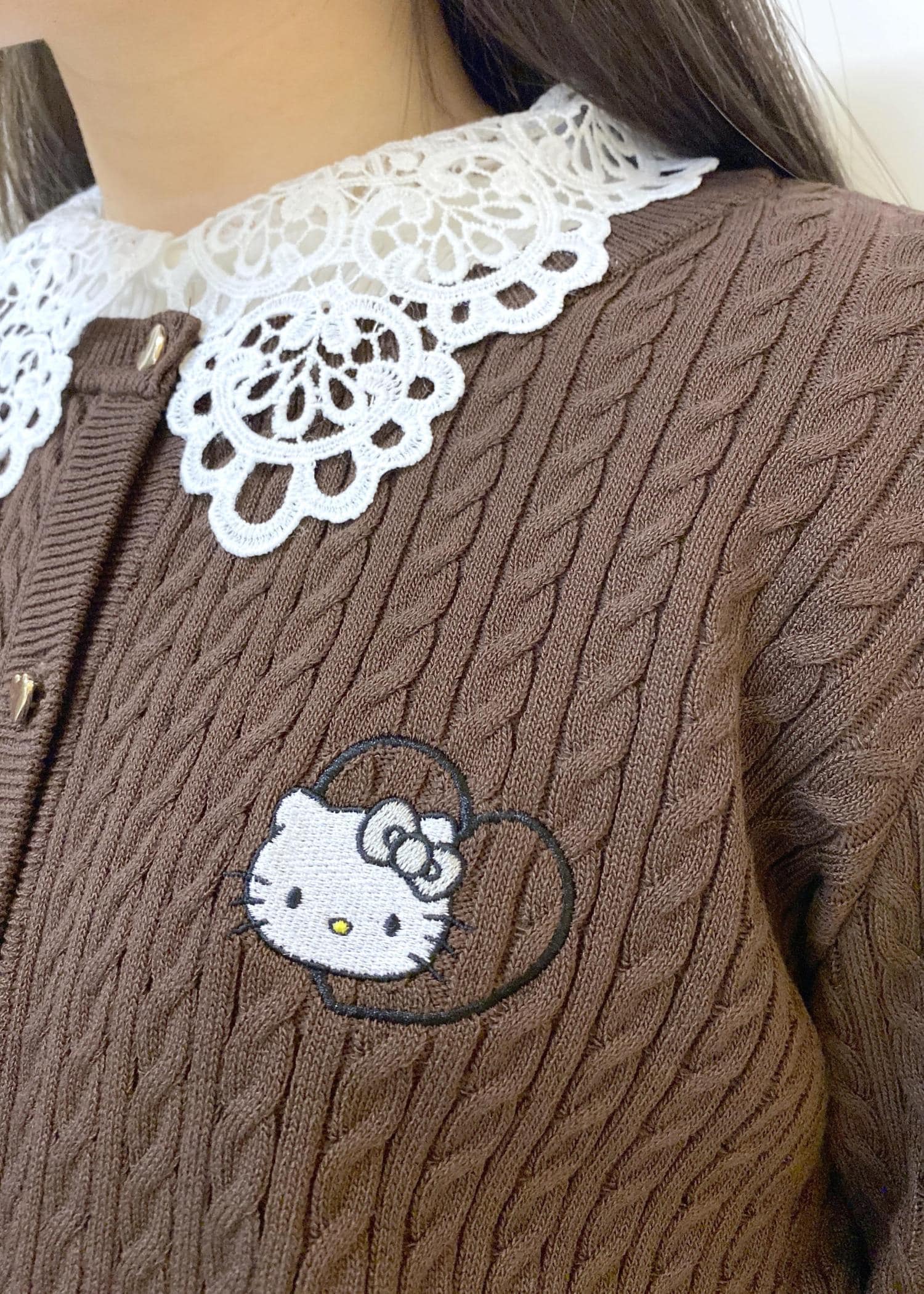 ハローキティのコラボカーディガンにレースカラーニットをレイヤードして上品にまとめました。