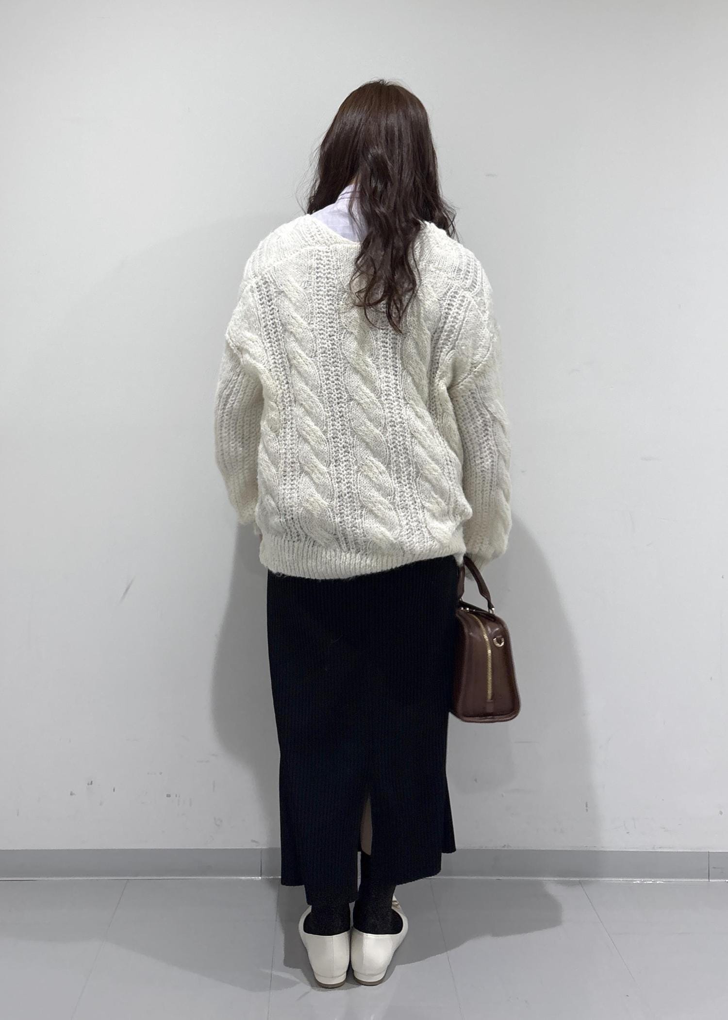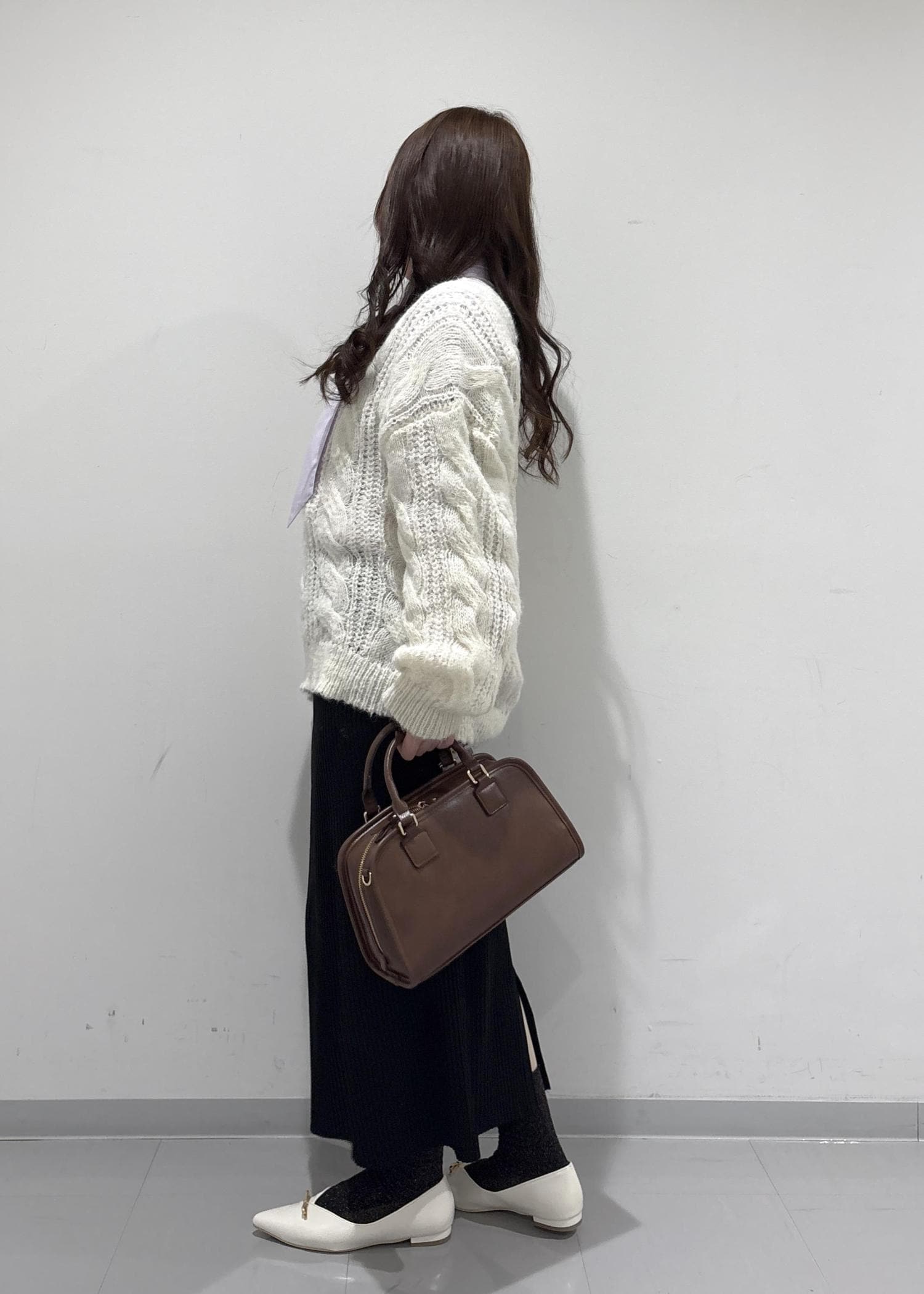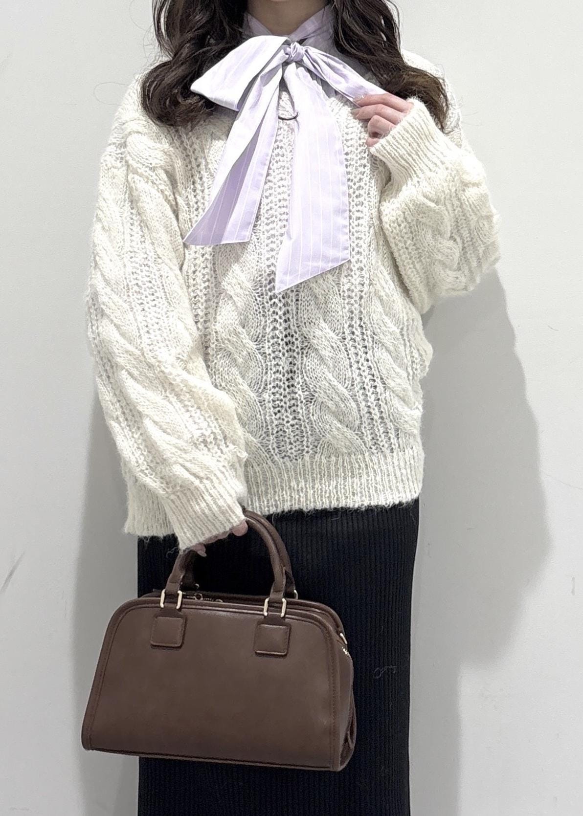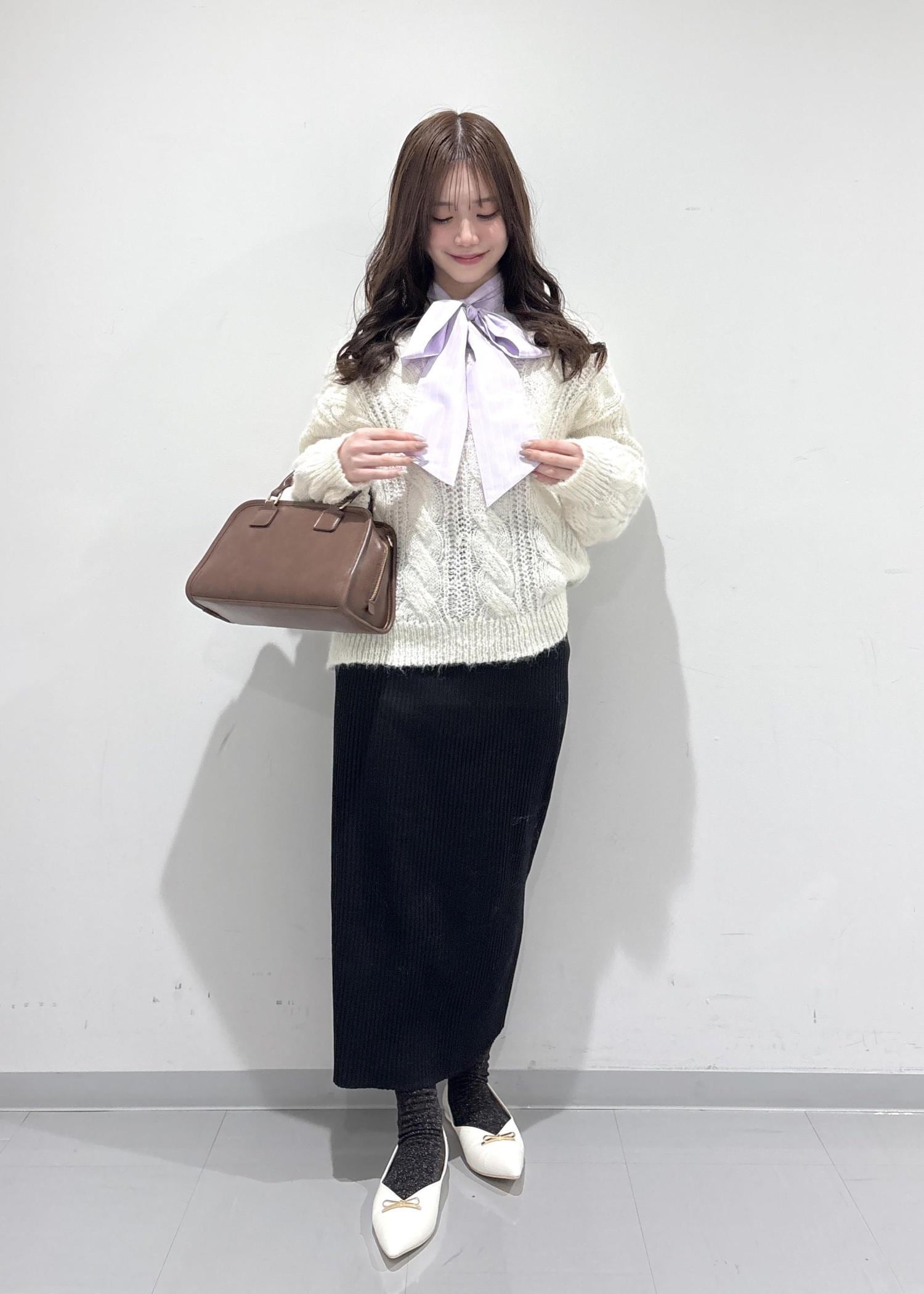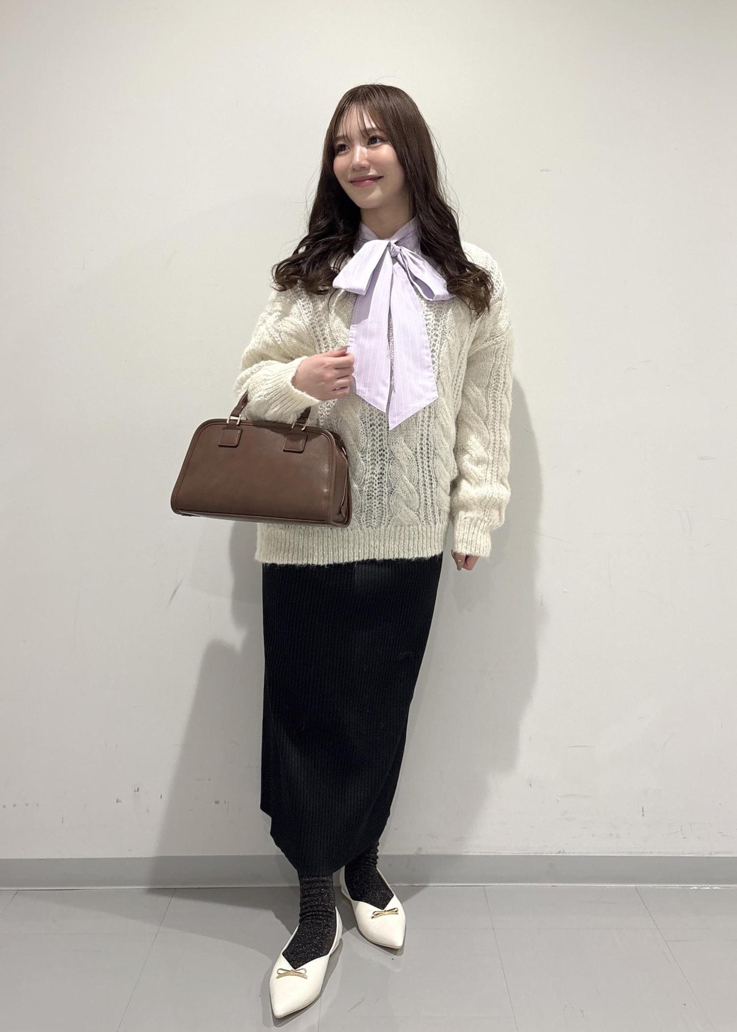 こちらのコーデのポイントは、大きなボウタイのリボンです!シャツだけで着てしまうとキレイめ感が満載になので、上からゆったりとしたケーブルニットと合わせて甘さもありつつ、カジュアルな印象を出してみました!パンプスもリボンが付いており、女性らしい甘さを少し抑えたコーデを意識してみました!