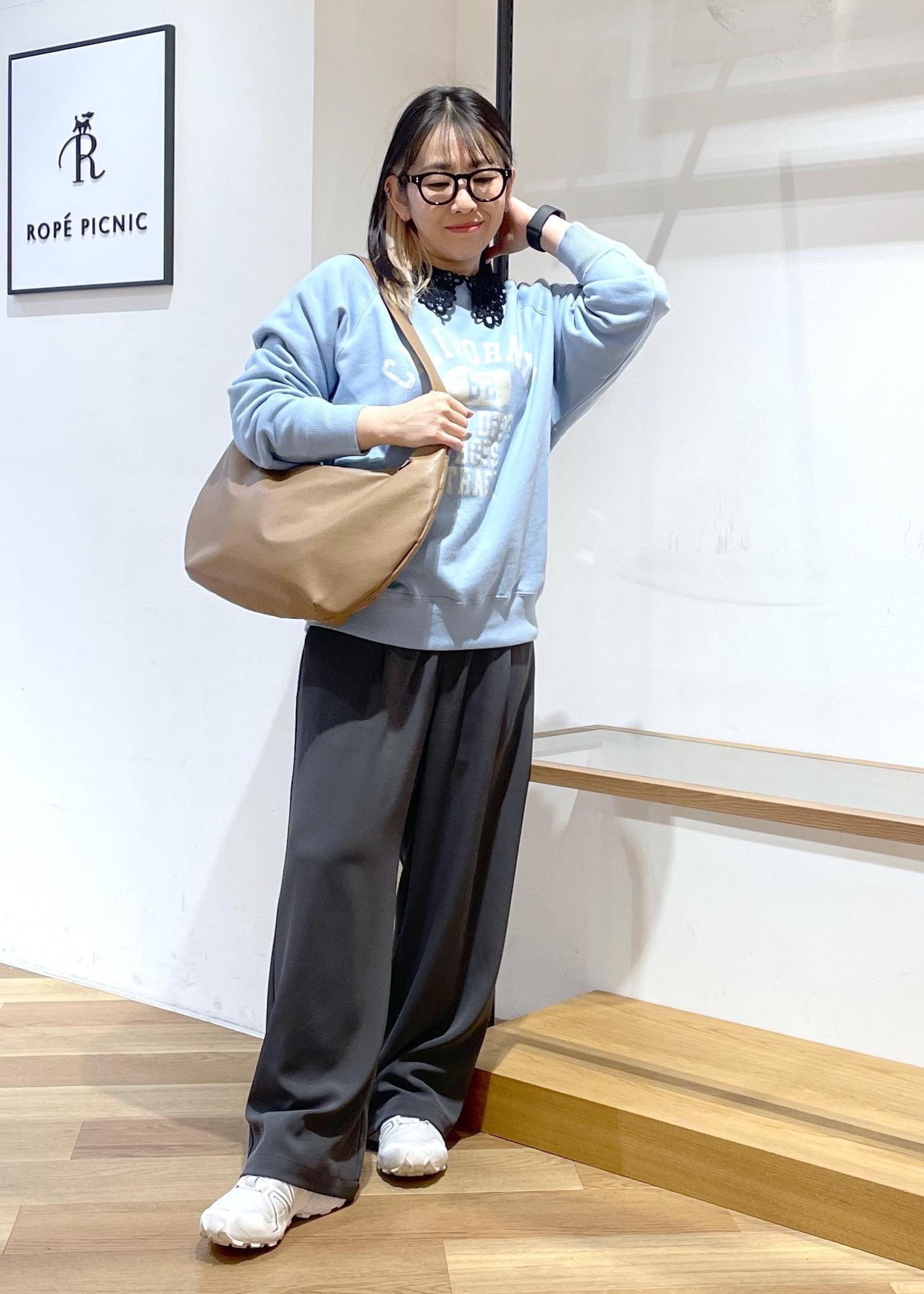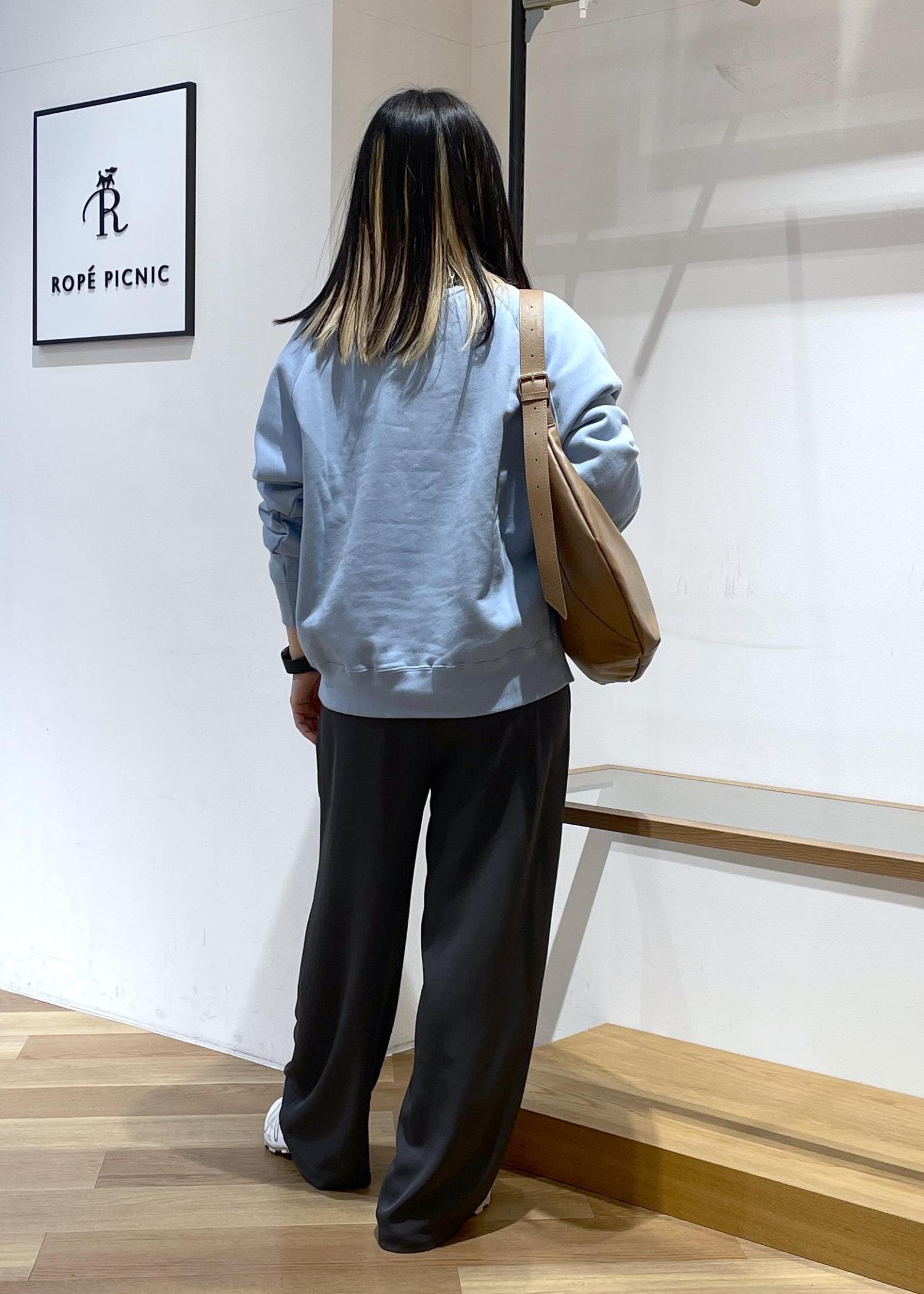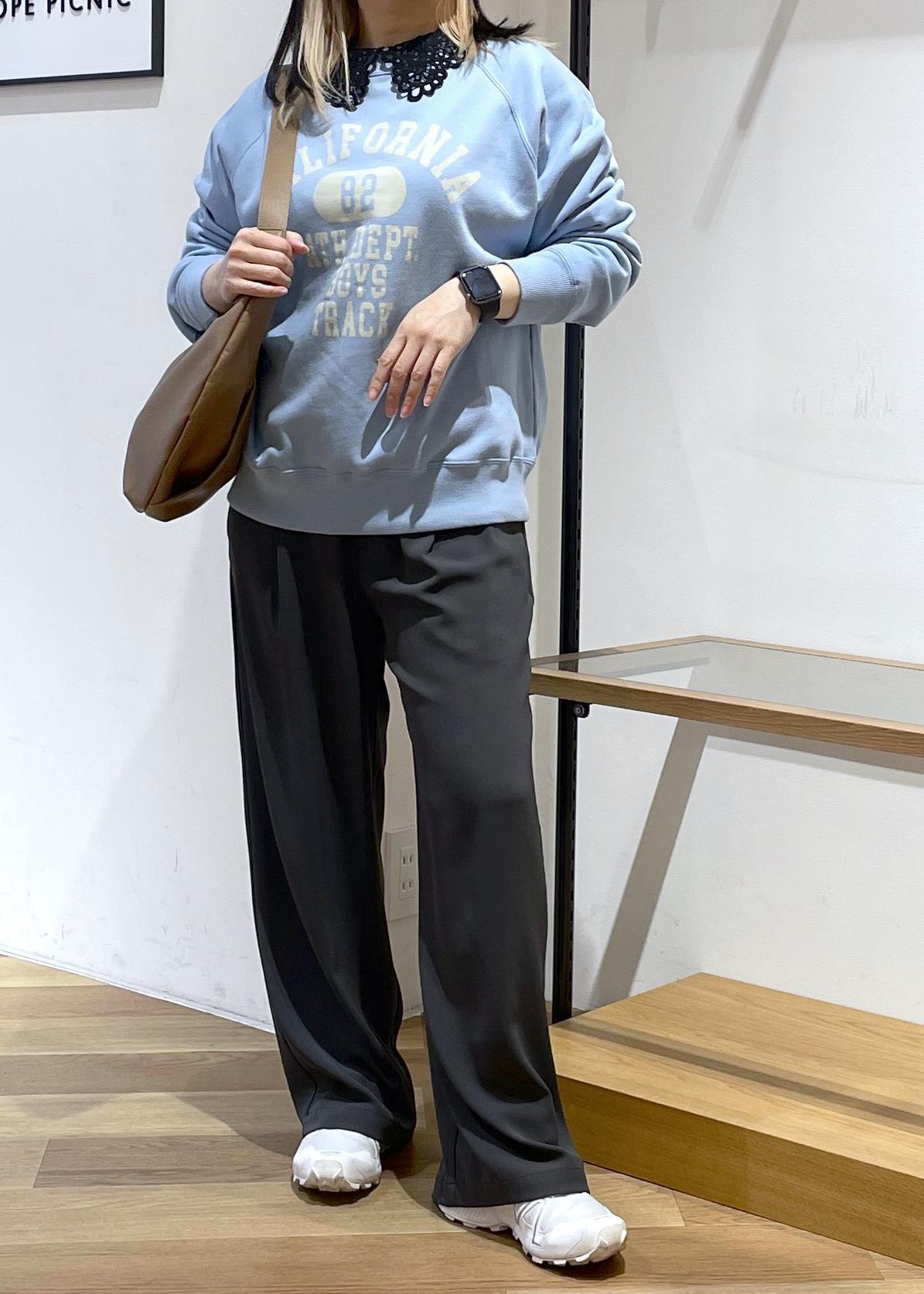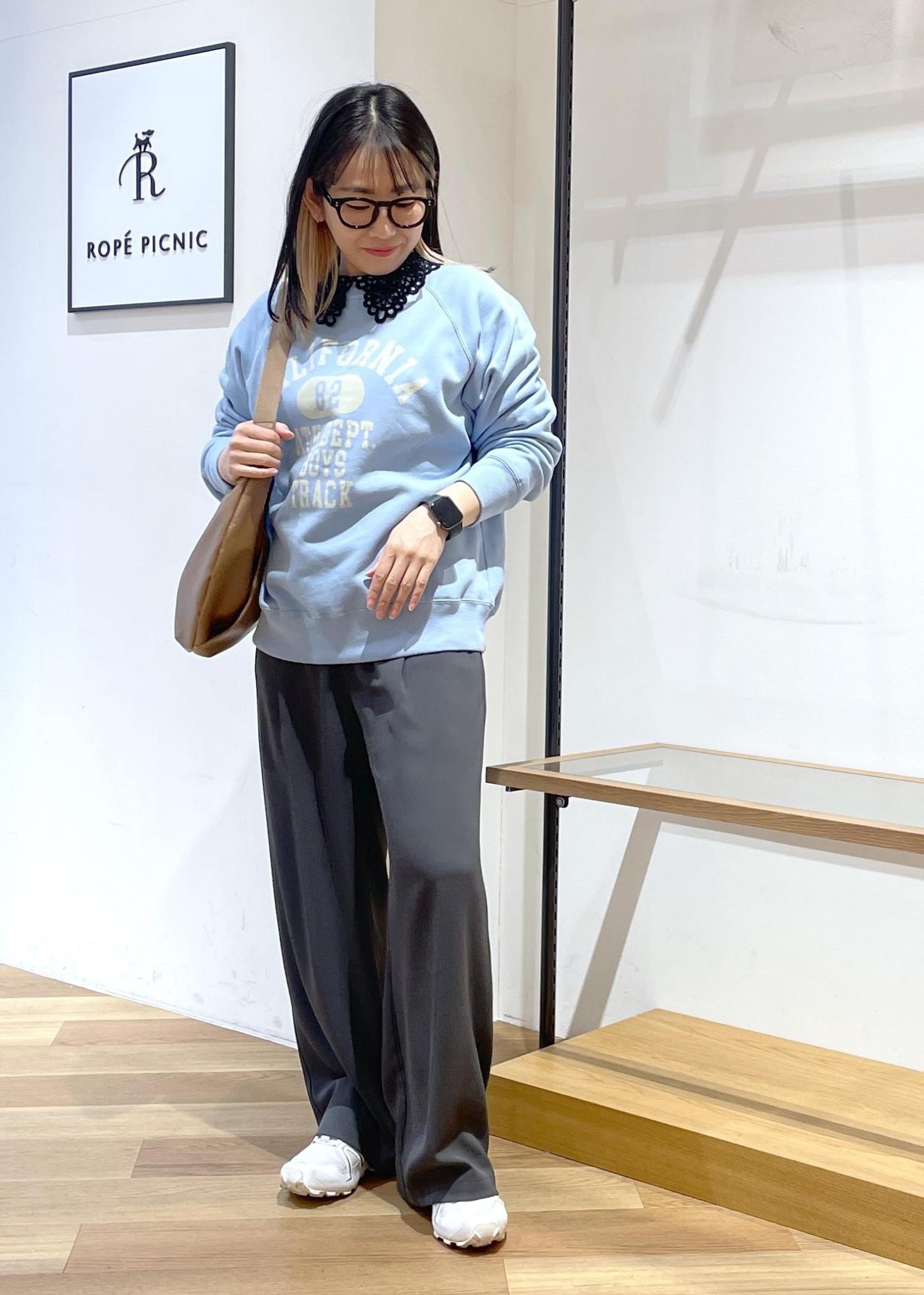 春色の爽やかブルーのスウェットです。キレイなパステルカラーなのでコーディネートが華やかになります。襟のレースを出してキレイめスタイルにしてみました。