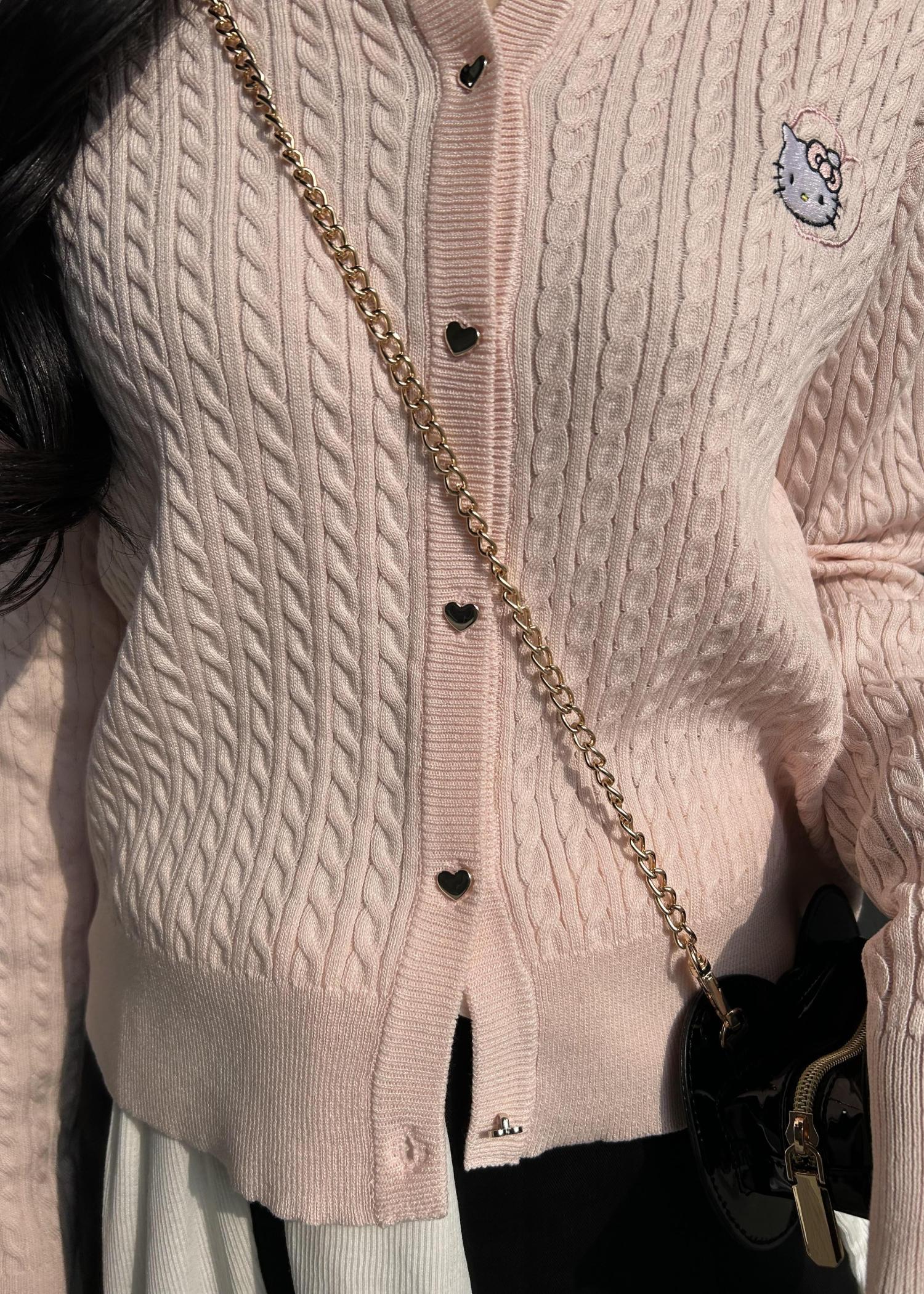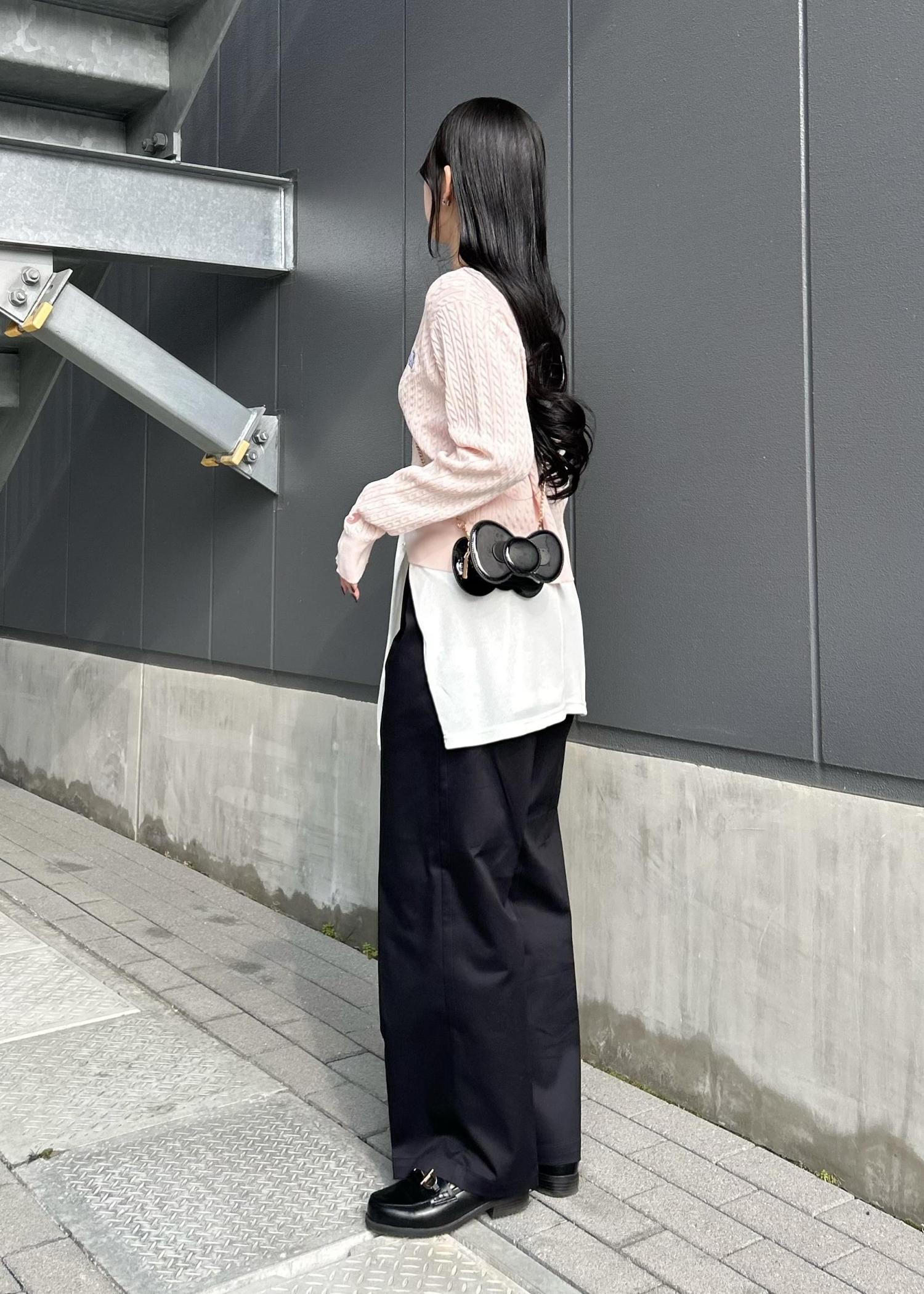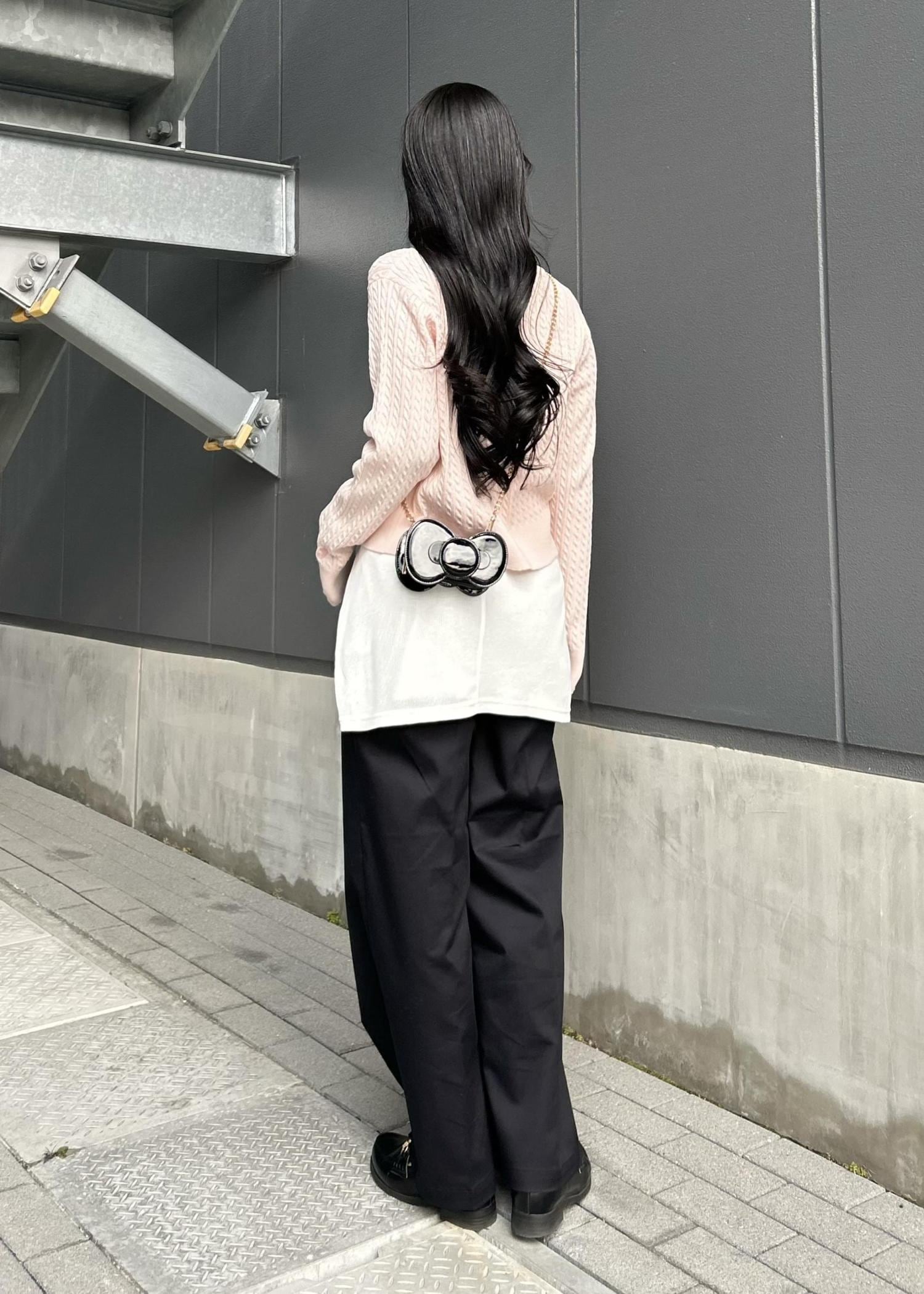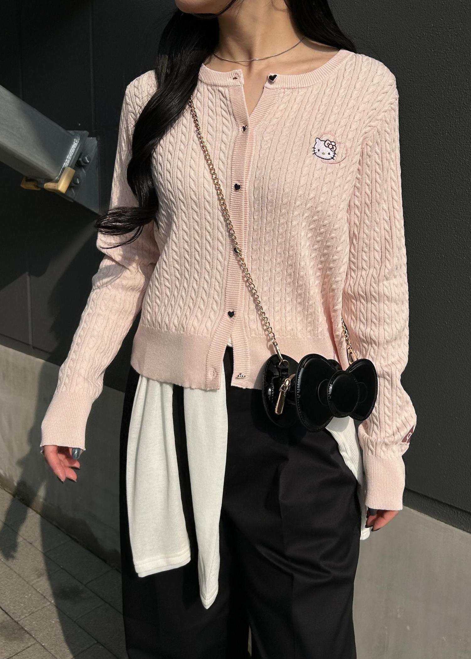 HELLO KITTYのワンポイントが可愛いケーブル編みのカーディガンを主役に、ボトムは落ち感のあるネイビーのチノパンを合わせました。