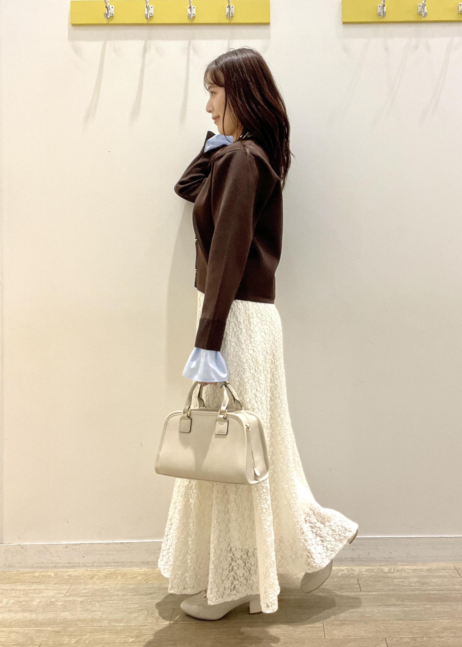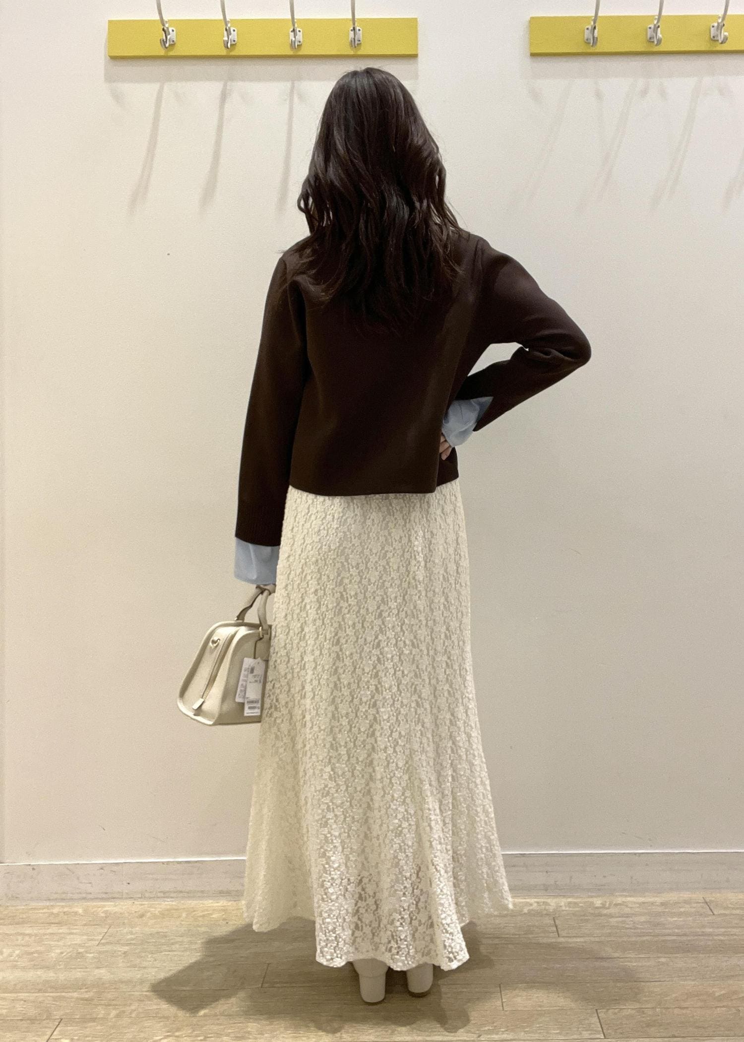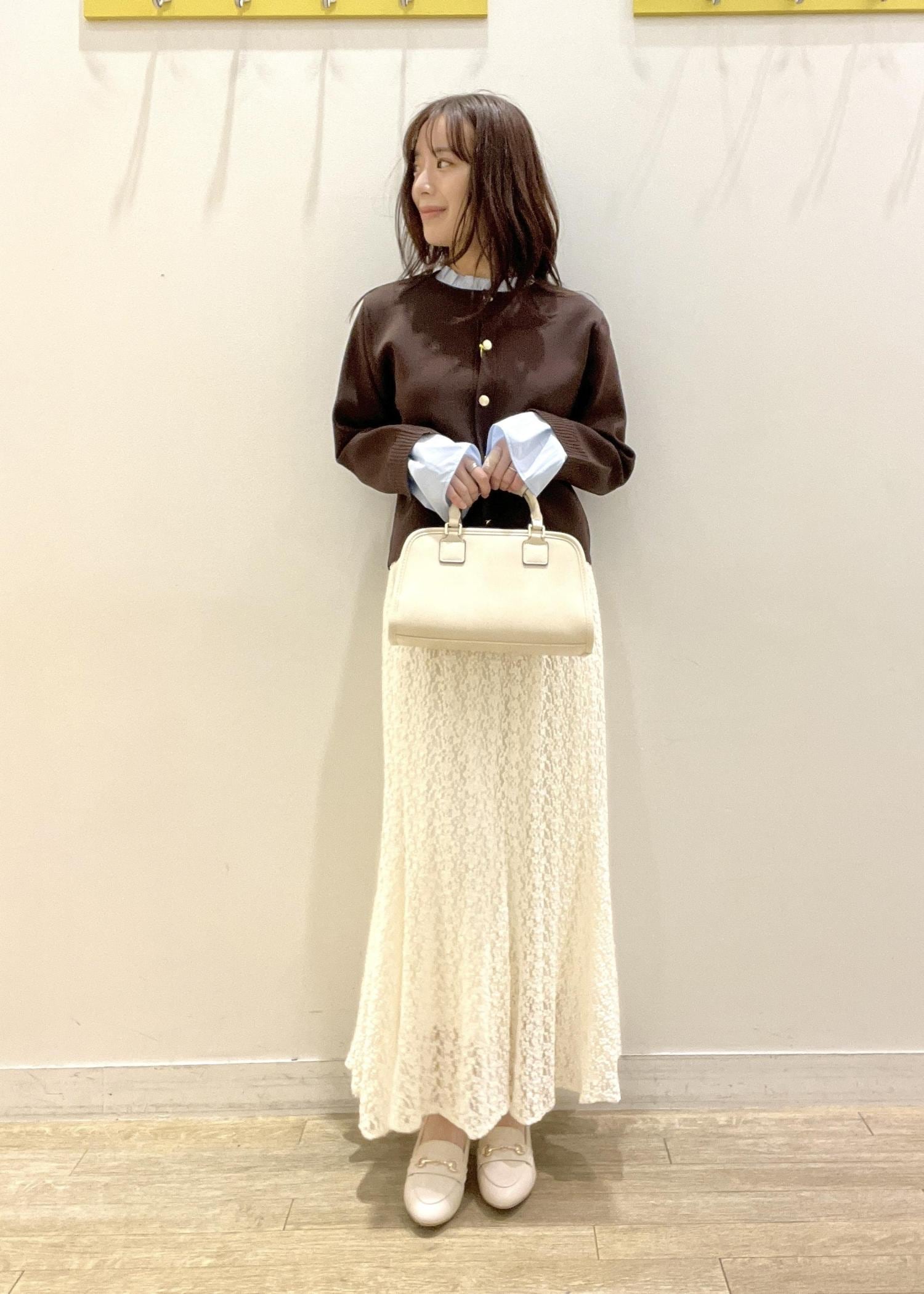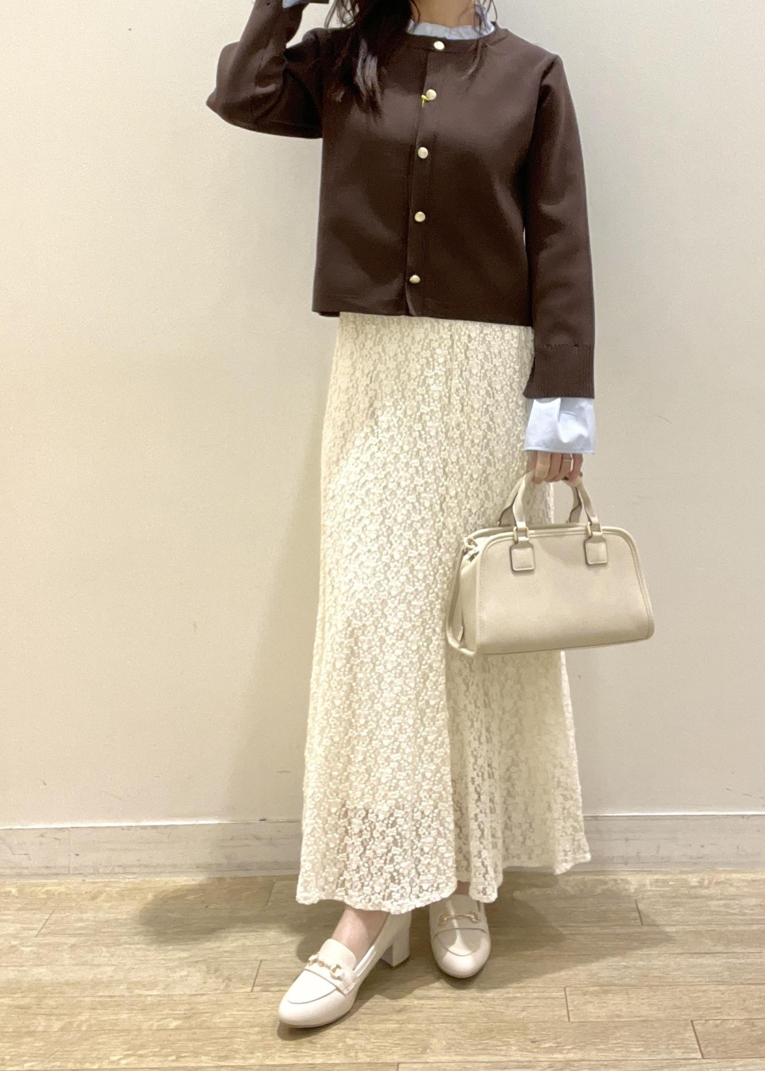 フリルがついたカーディガンに白のマーメイドスカートを合わせて大人きれいめコーデを組んでみました。