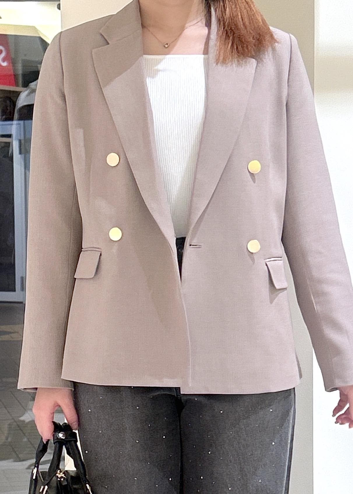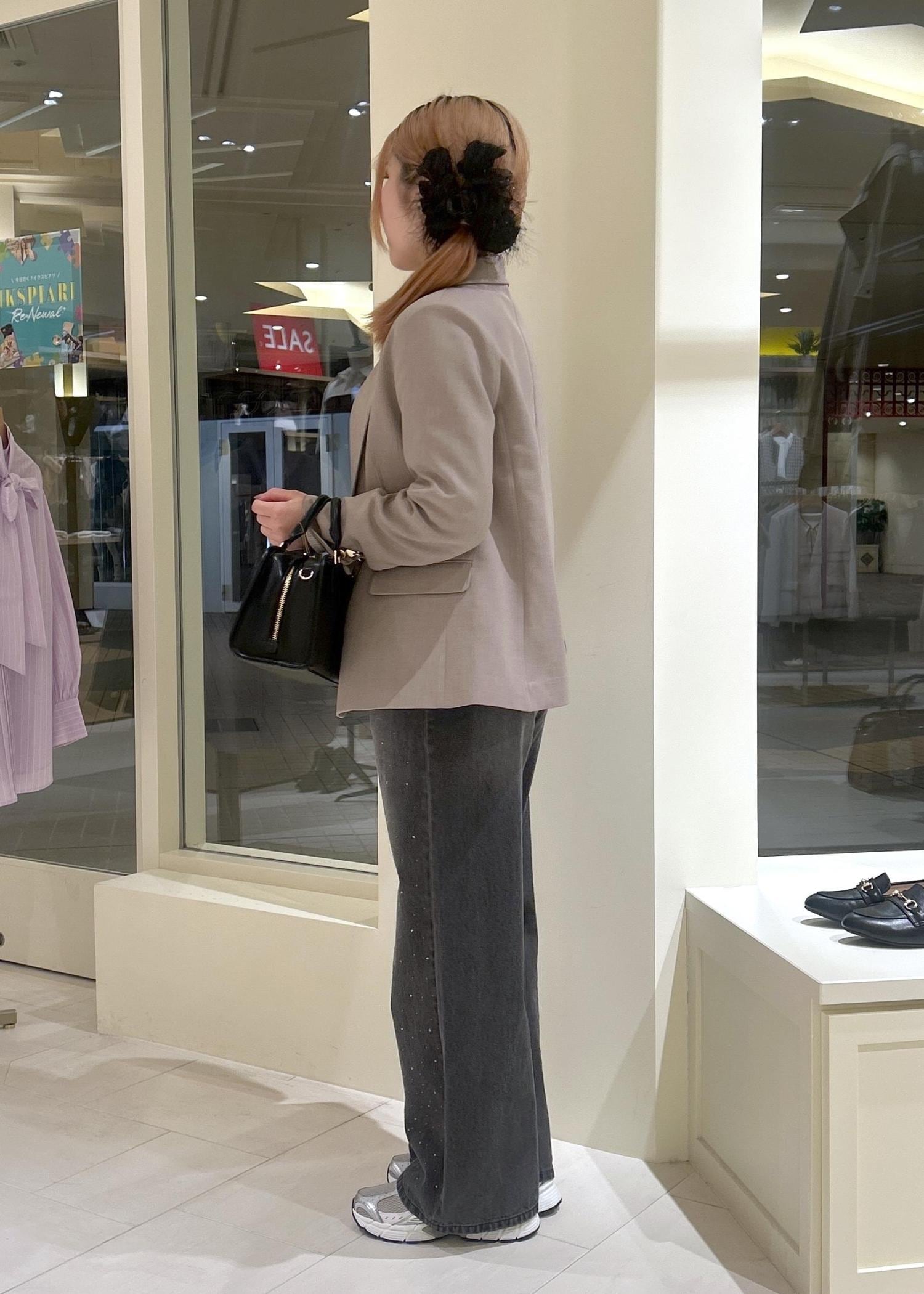 お仕事で使えるジャケットとビジューデニムを合わせることでカジュアルな印象になります。