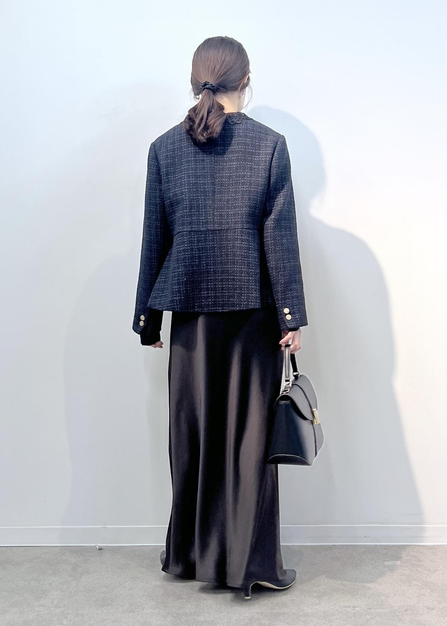 ツイードジャケットにレース襟のトップスをレイヤードして甘さをプラス。