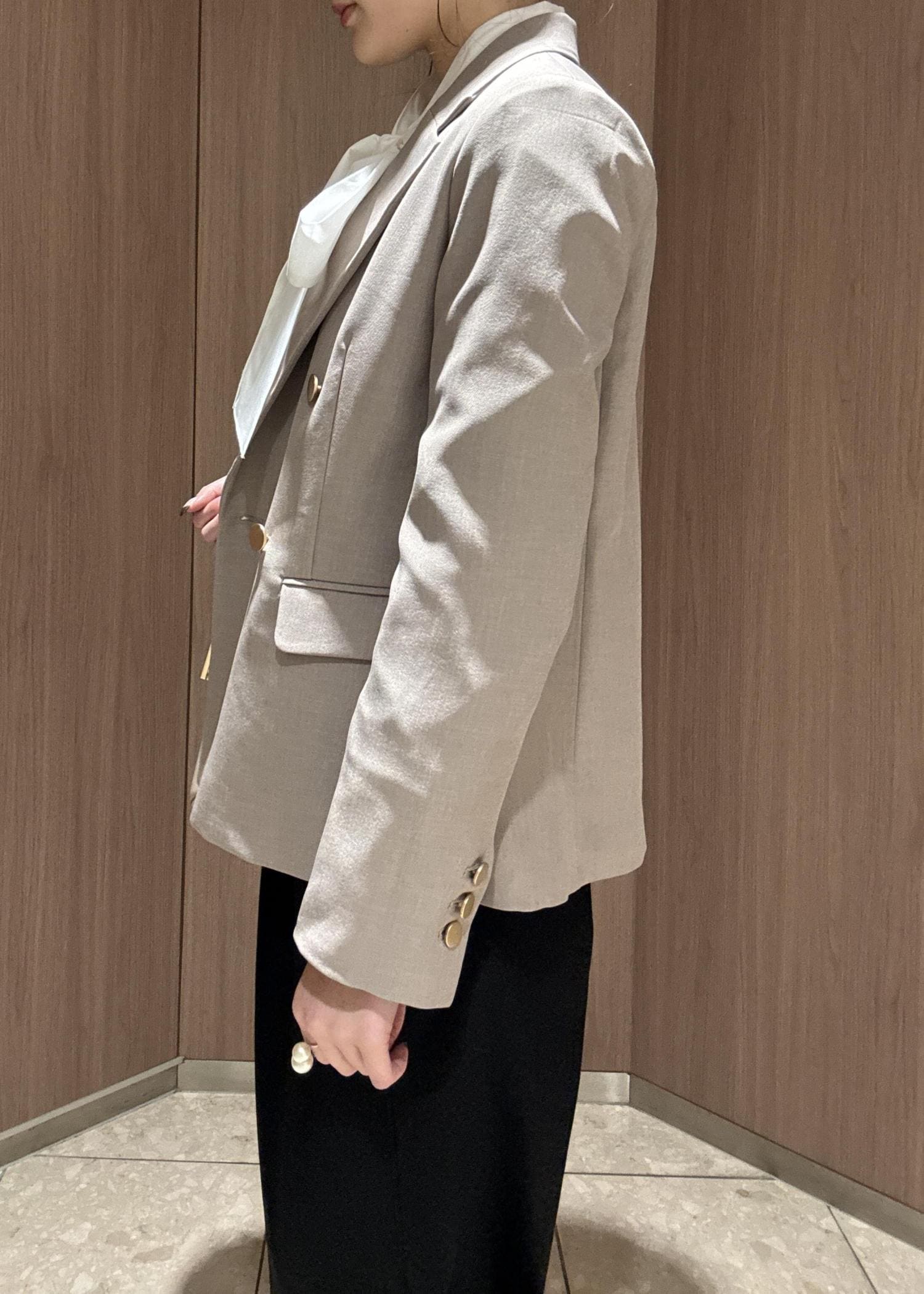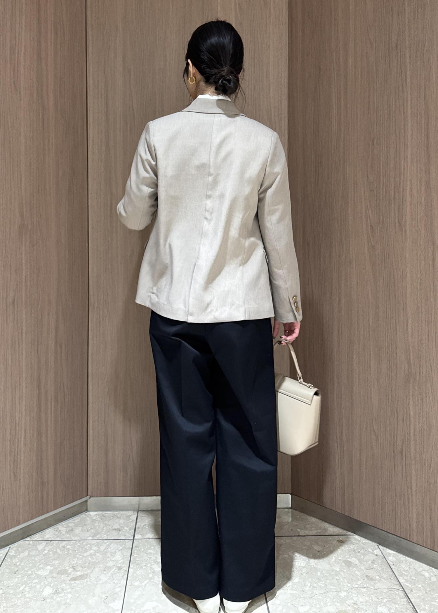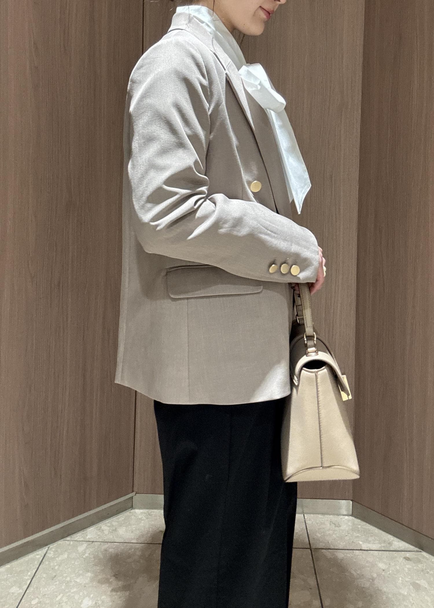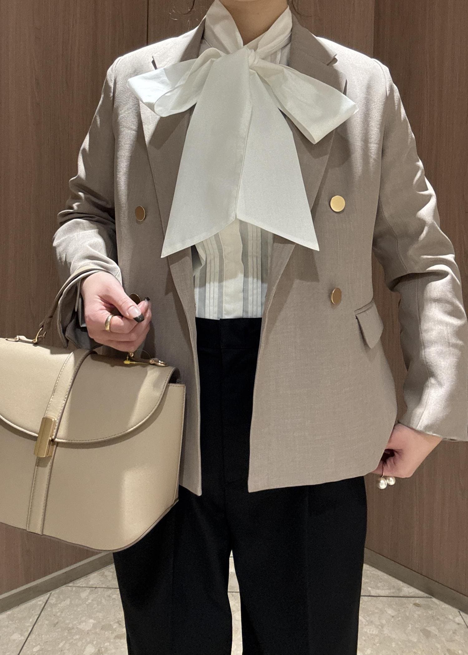 ベージュのジャケットにトップスをブラウスにするだけで、