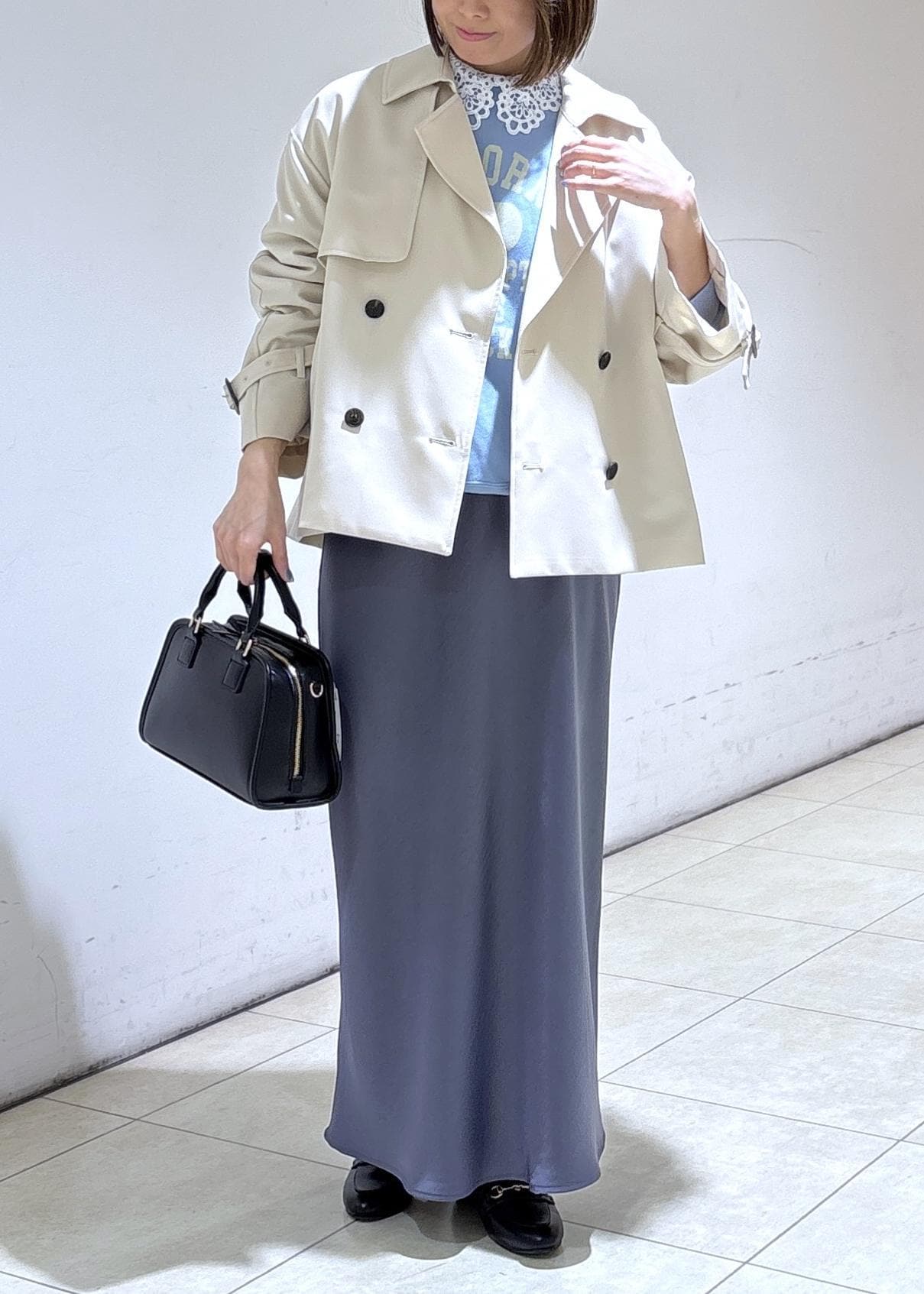 サテンスカートを合わせた大人カジュアルコーデ。