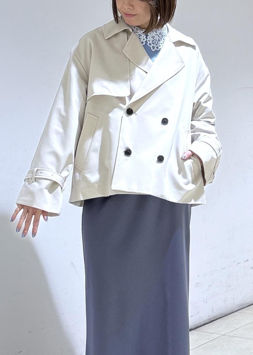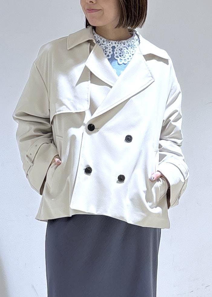ROPÉ PICNICショート丈トレンチコート/撥水・花粉ガードベージュ / F¥13,200レビューゆとりのあるシルエットでインナーに重ね着しても楽に着られるサイズ感でした。着丈はヒップにかかるほどの長さです。柔らかな肌触りでシワになりにくい素材です。袖口はベルトで絞れるので袖丈の調整がしやすかったです!