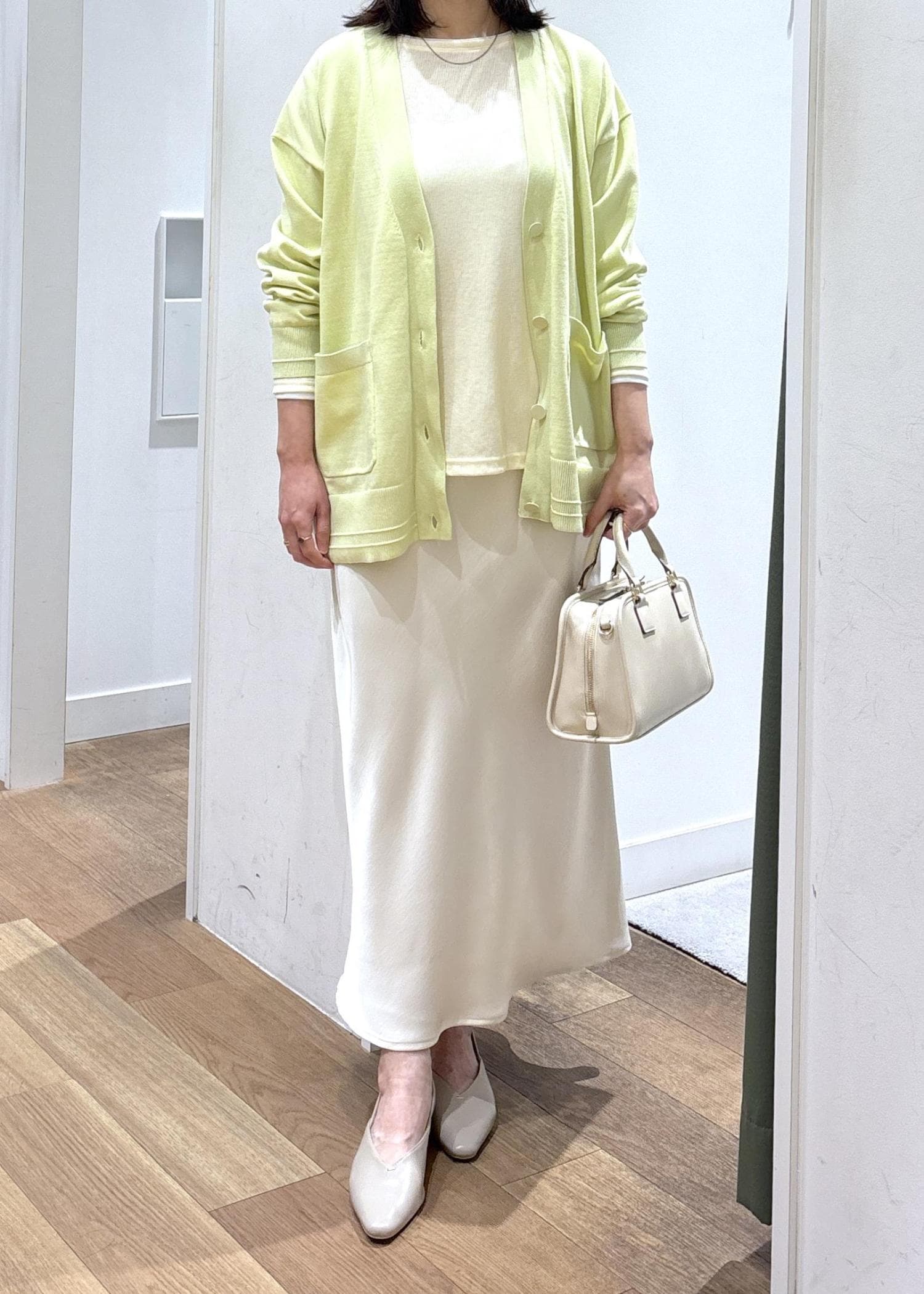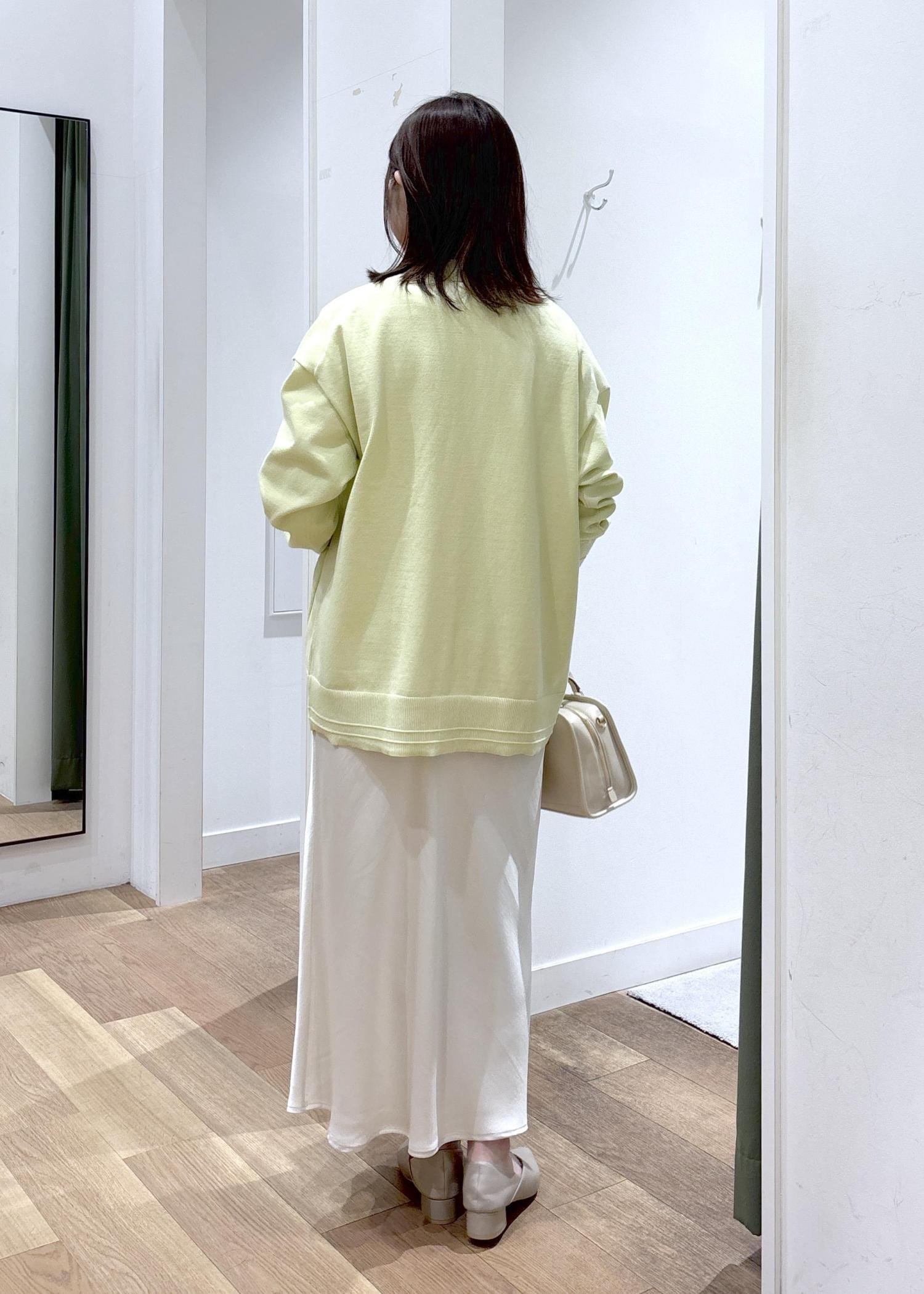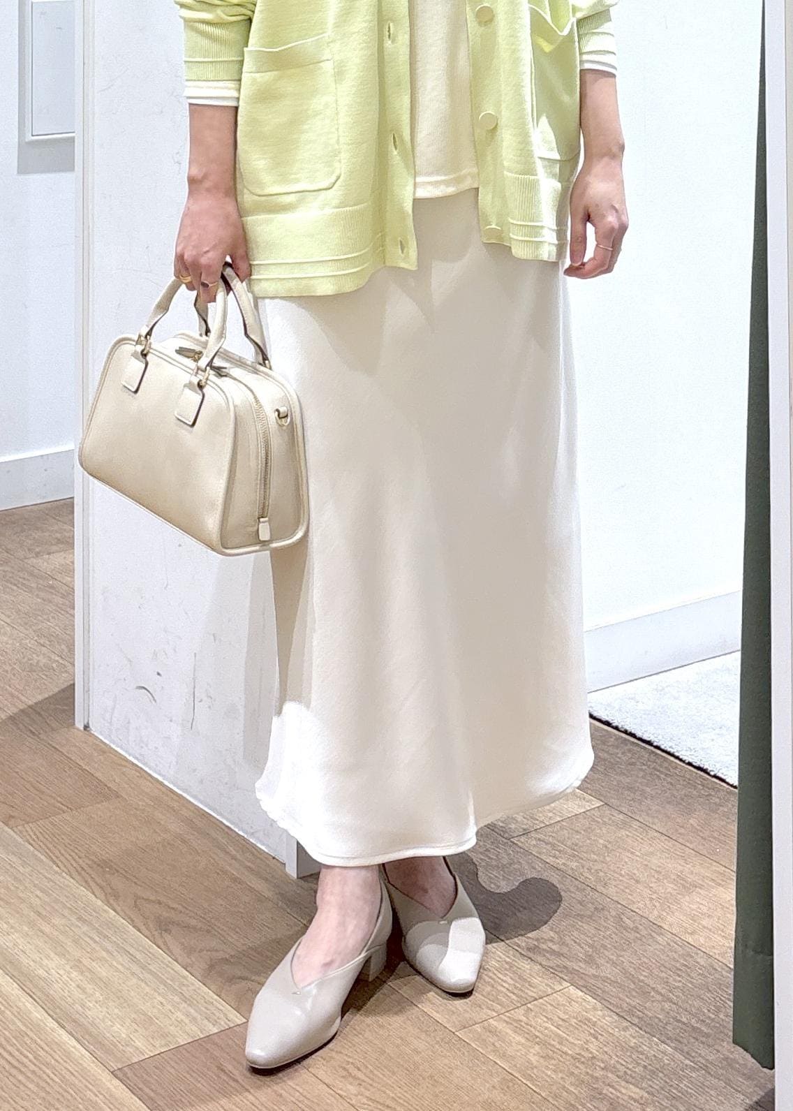 ROPÉ PICNIC細見えバイアスサテンスカート/イージーケアオフホワイト / F¥6,490レビュータイトすぎないアイラインとウエストゴムで、履き心地が楽で足さばきも◎です。腰が張っている為腰回りはフィット感がありました。162㎝で足首くらいの長さでした。