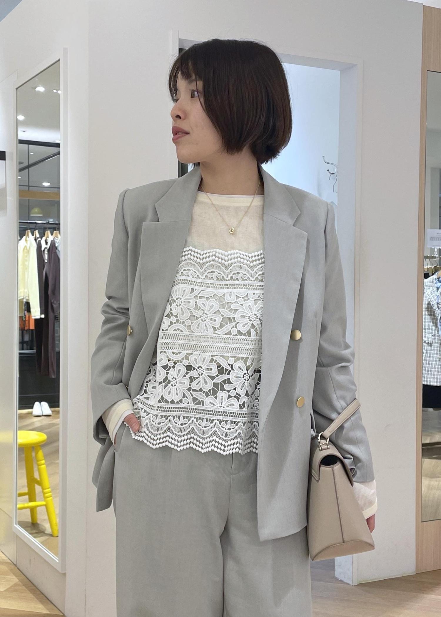 ジャケットのインナーにはシアーカットソーとレースビスチェのレイヤードスタイルを合わせて軽やかな印象のコーデに◎