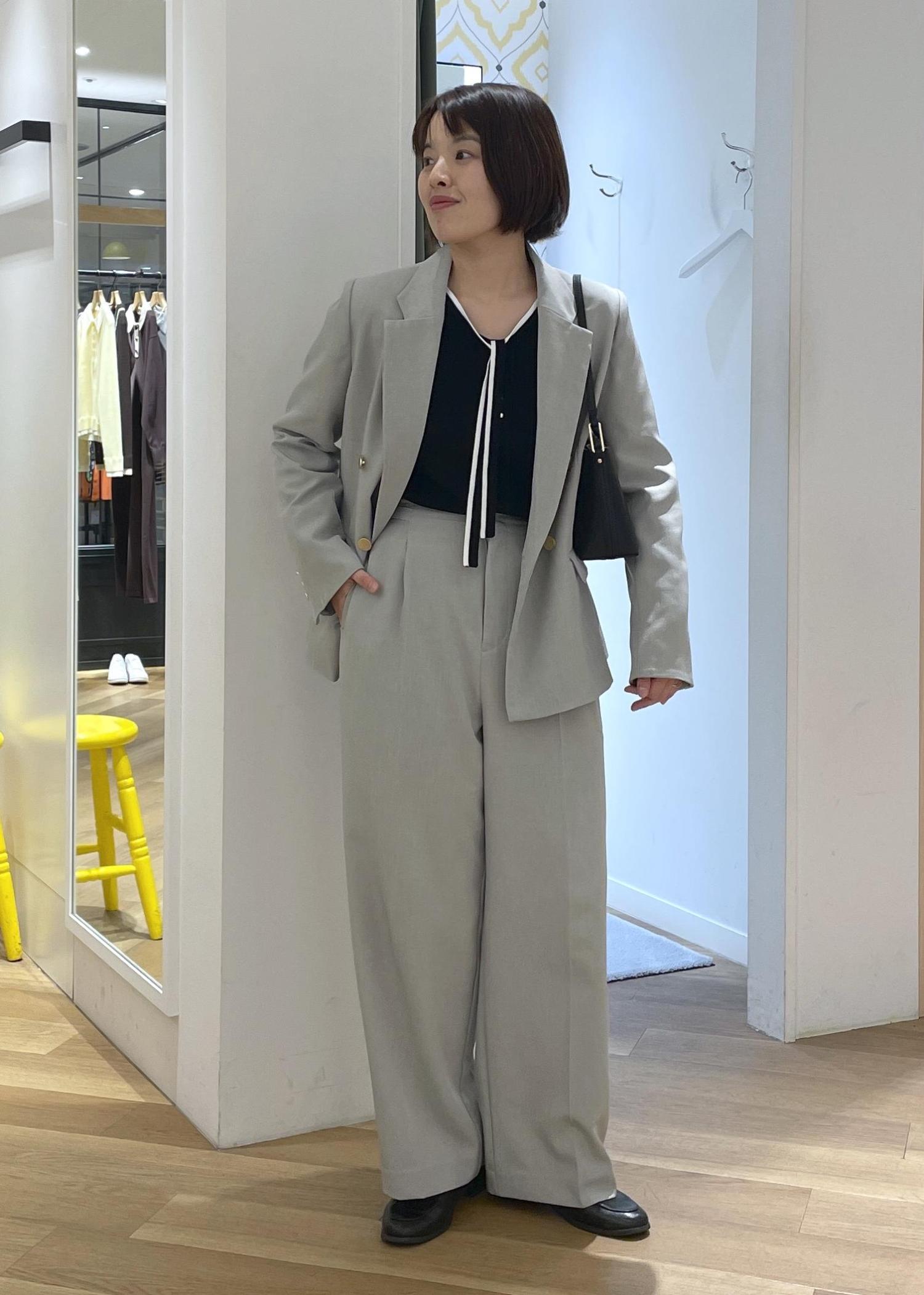 ハンサムな印象のジャケットセットアップに、女性らしい印象のリボンパールニットを合わせた、品良く決まるコーデです!