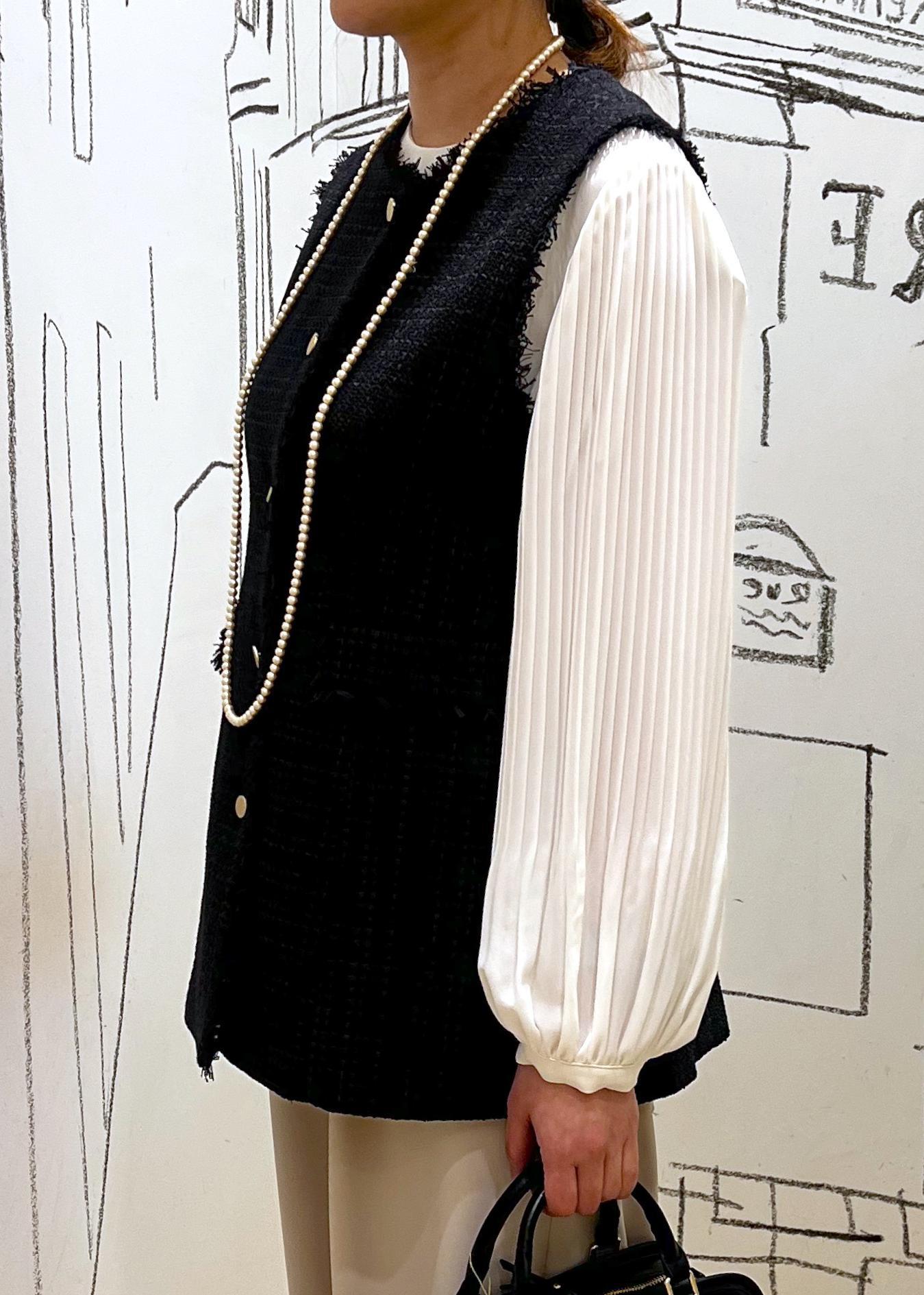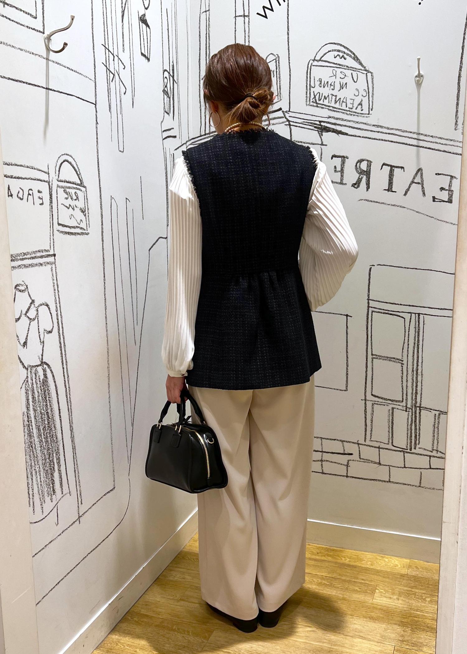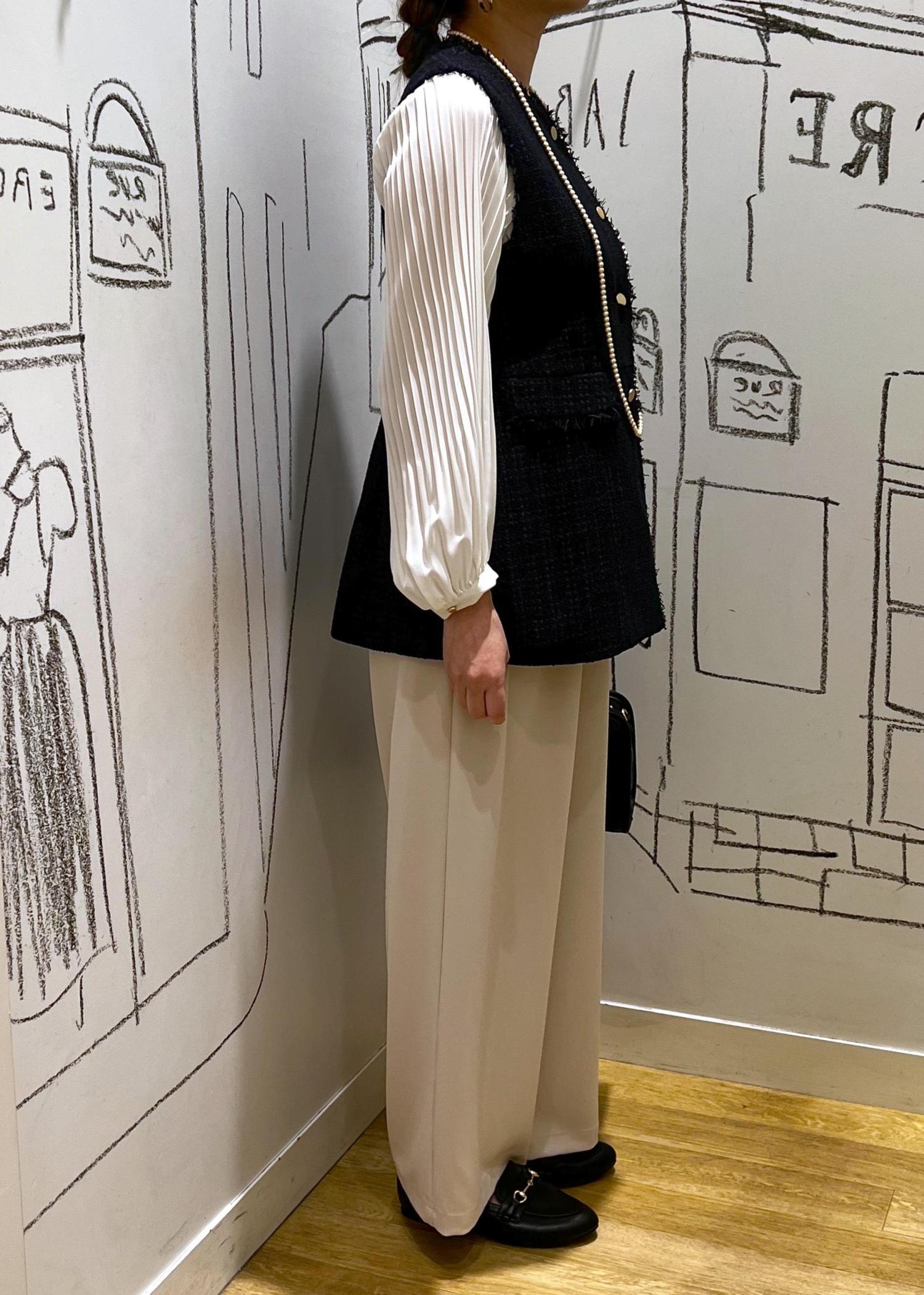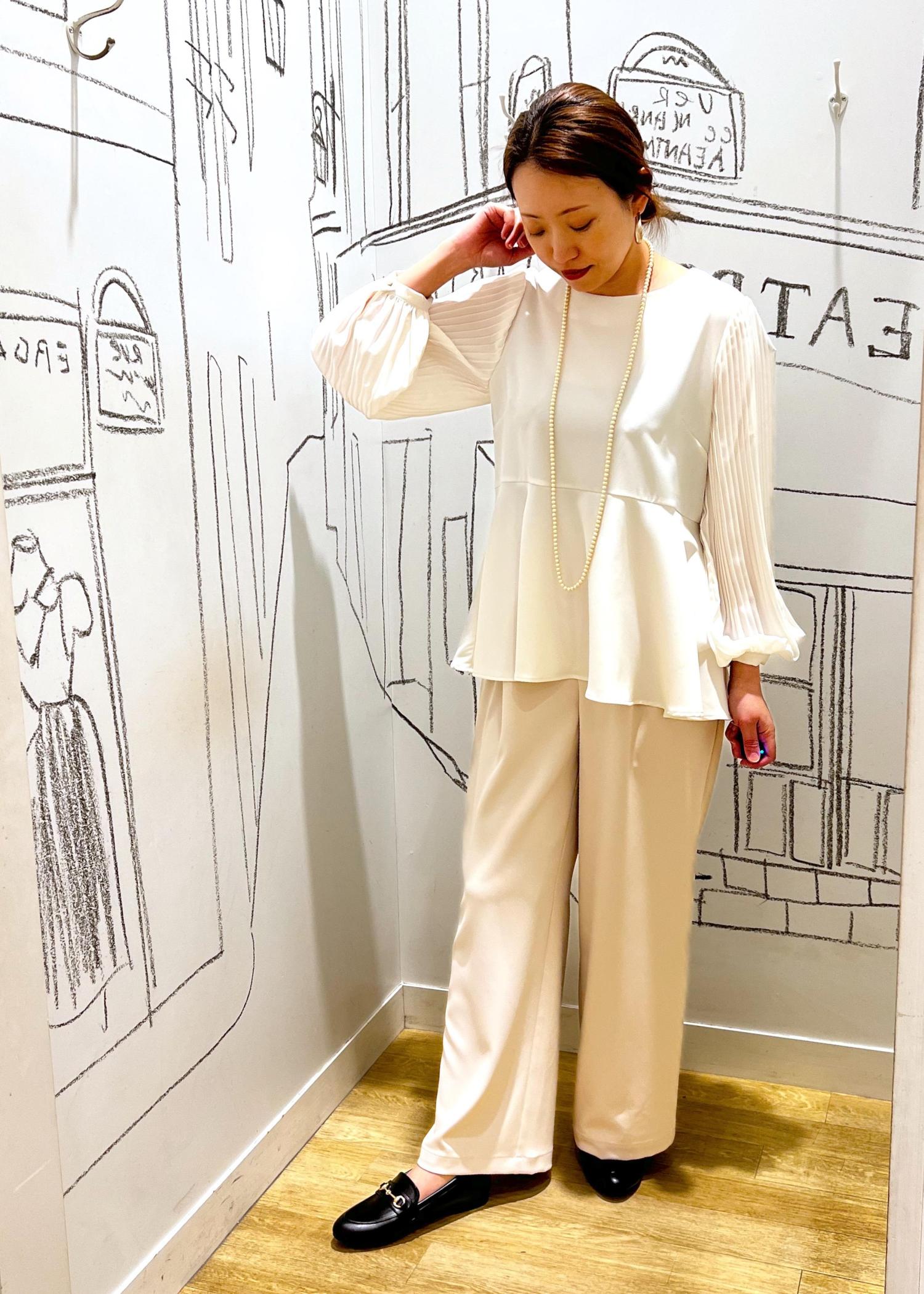 もし変化をつけるとすればブローチやコサージュ、パンツを濃い色に変えてもオシャレです。