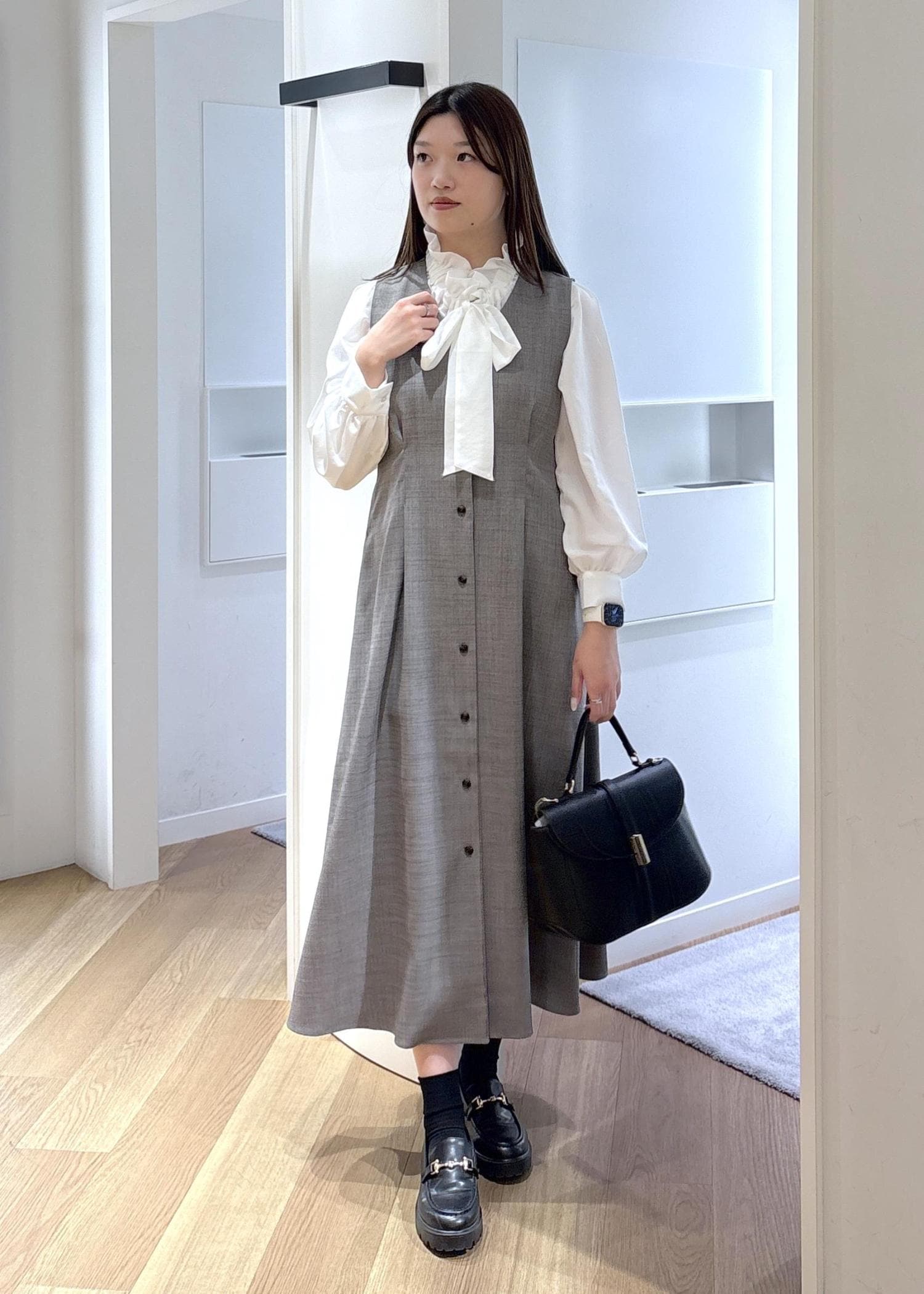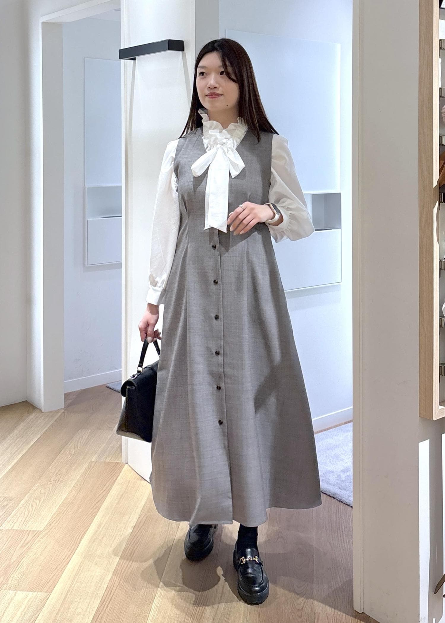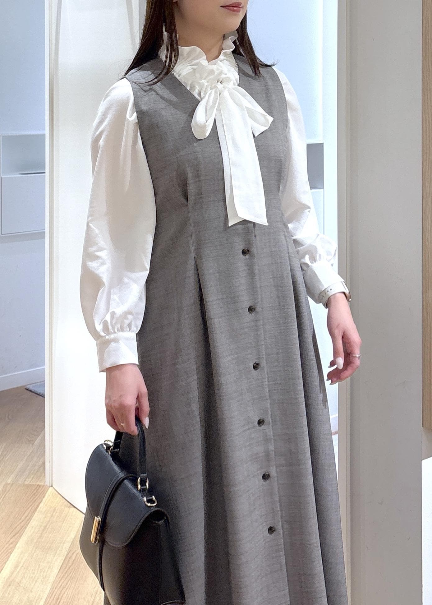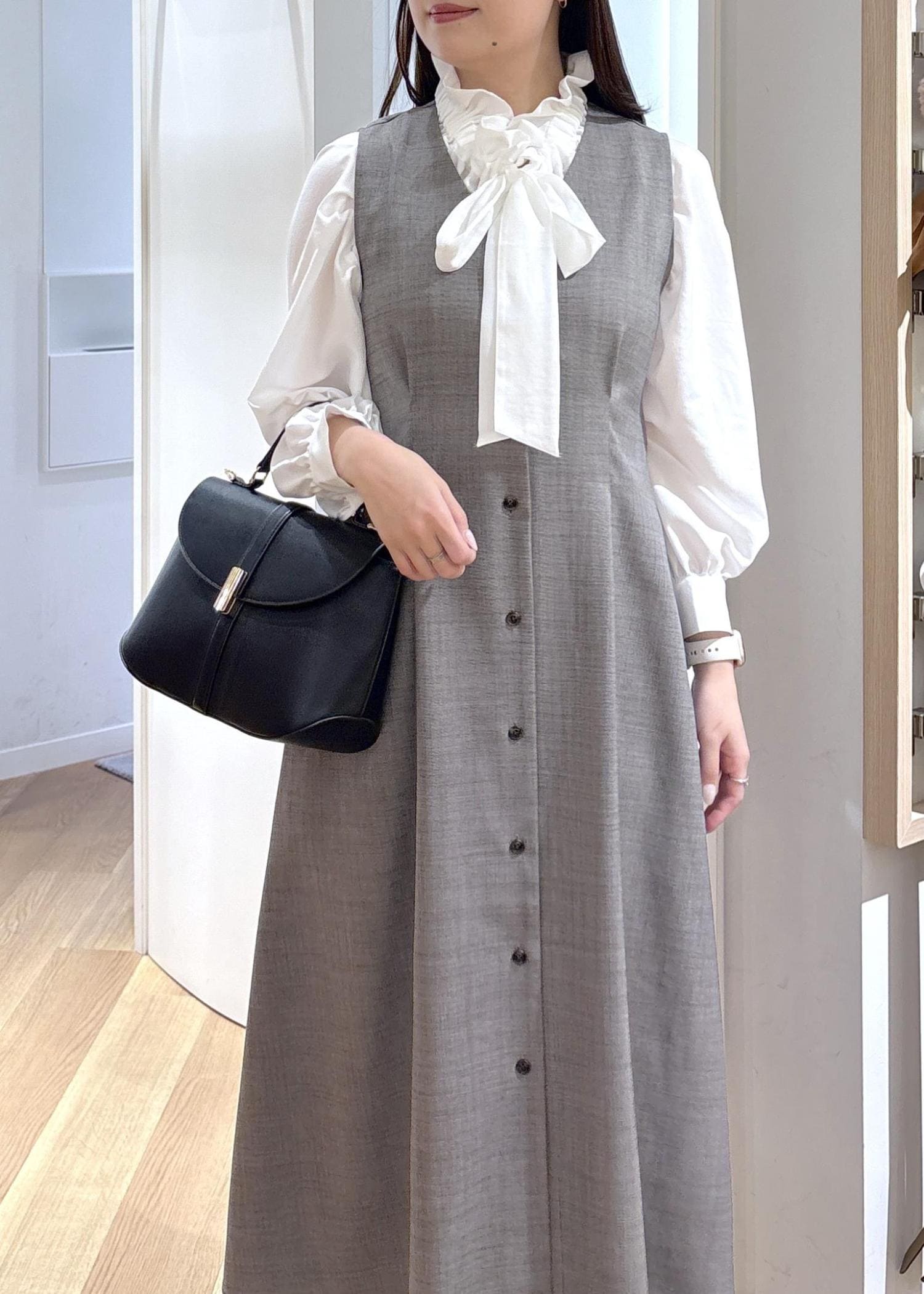 首周りのフリルやリボンが華やかで、ジャケットやカーディガン、ジレのレイヤードに使いやすいです。