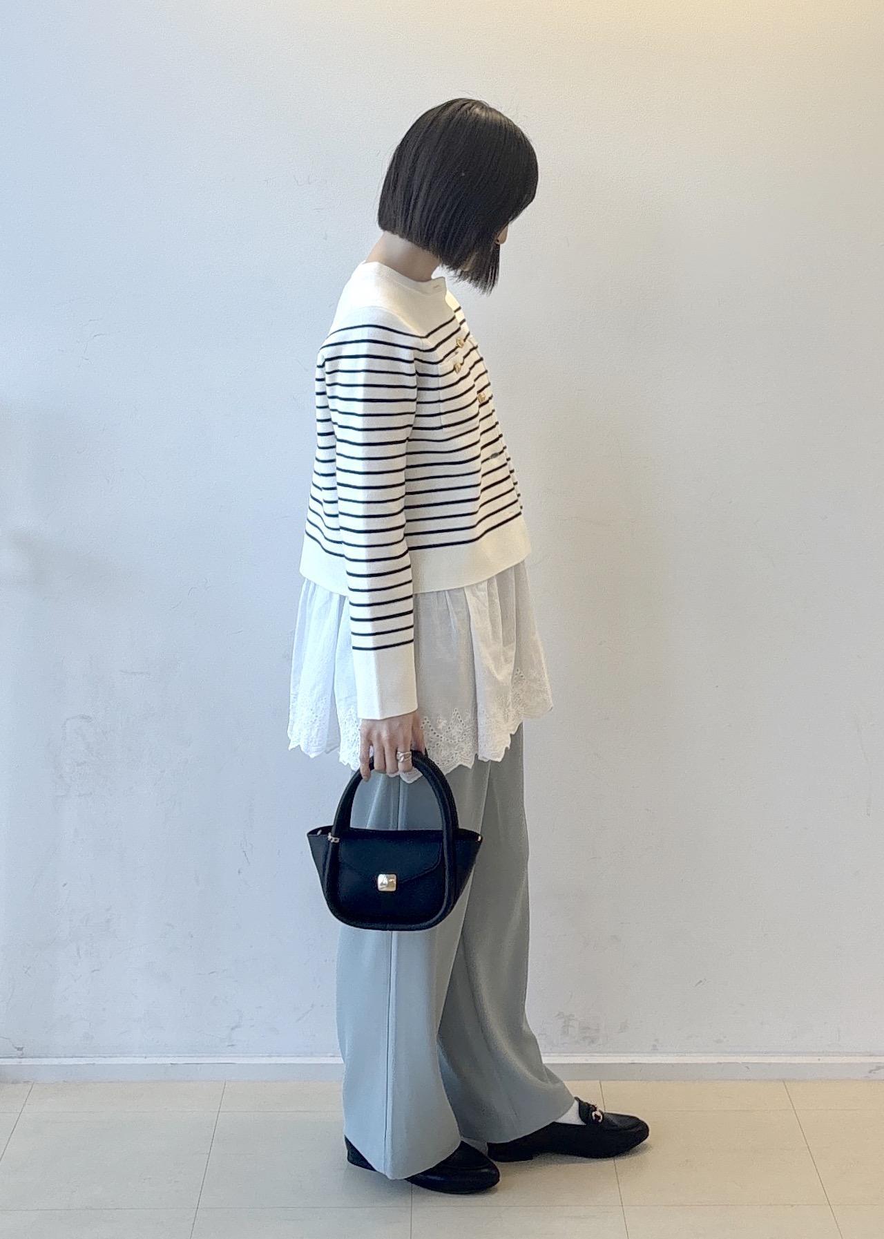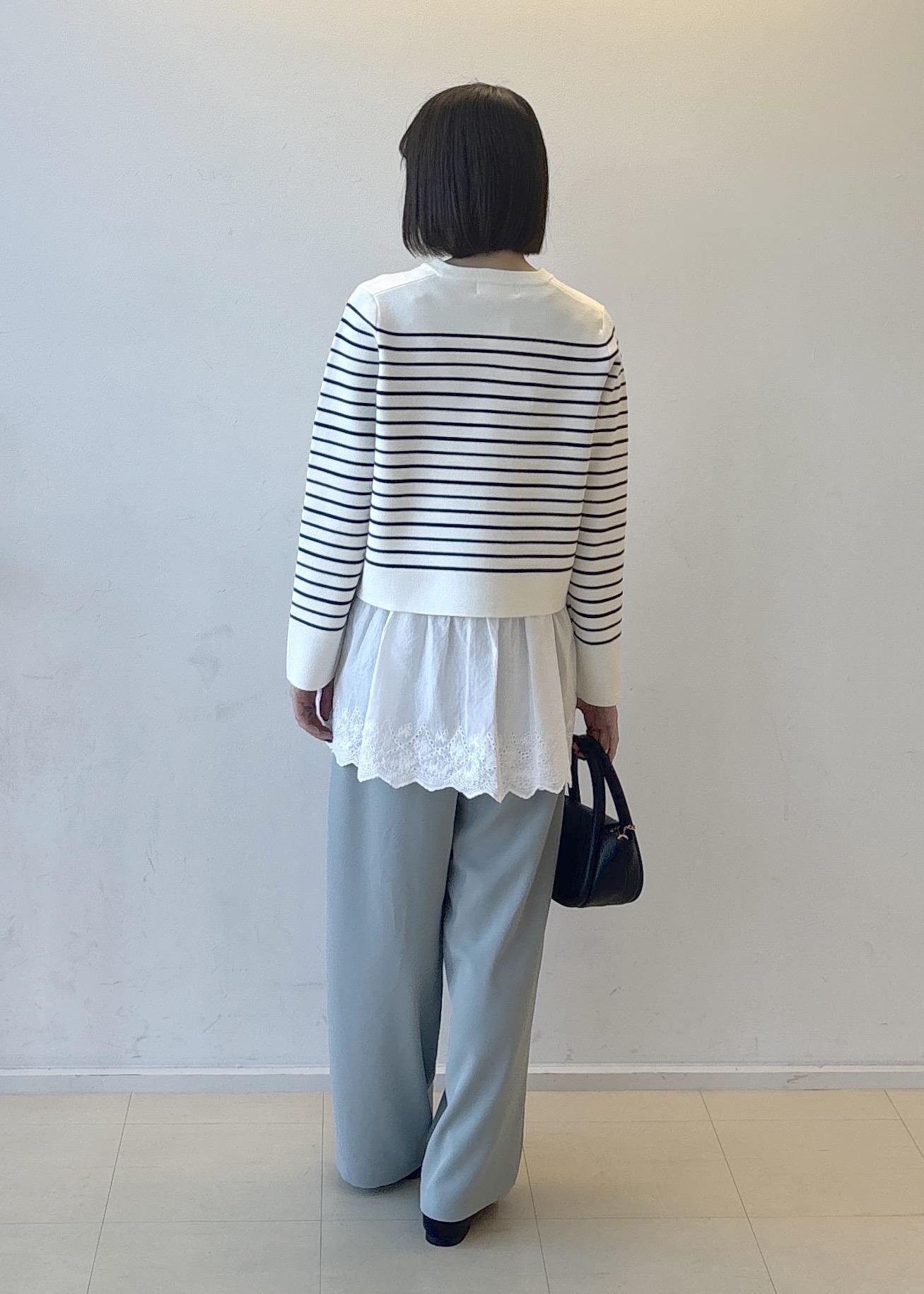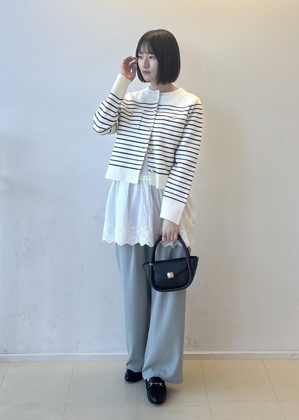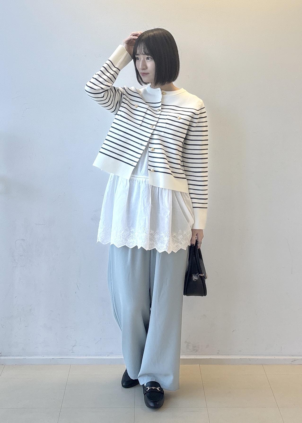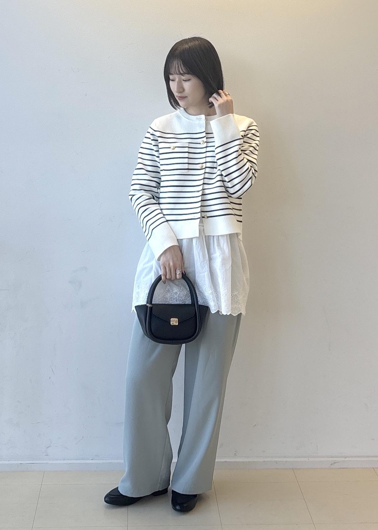 カーディガンのボーダーとパンツのグリーンがとても相性抜群です!