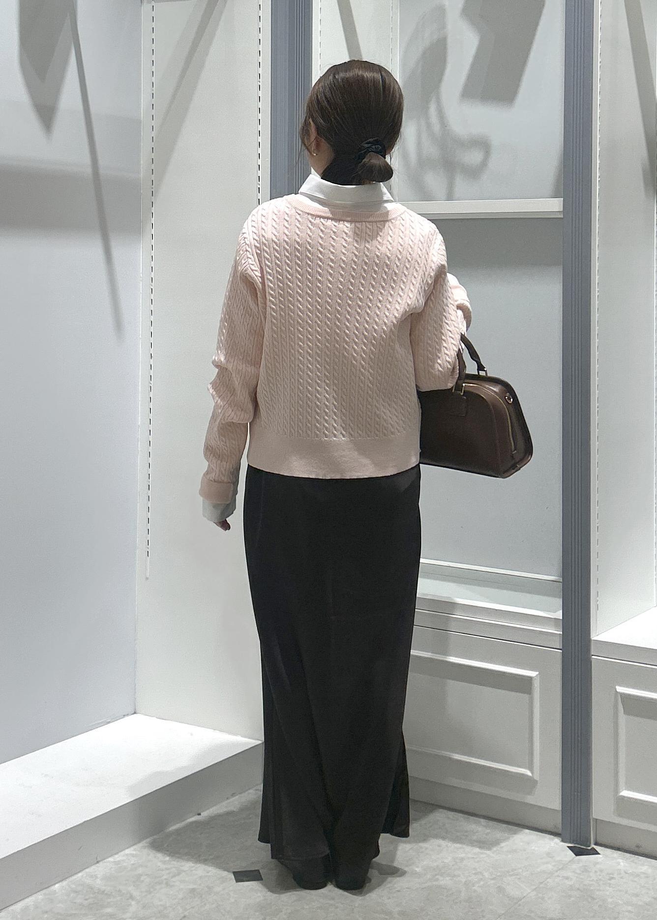 ピンクのカーディガンを甘くなりすぎない様にブラウン系のスカートや小物を合わせました!