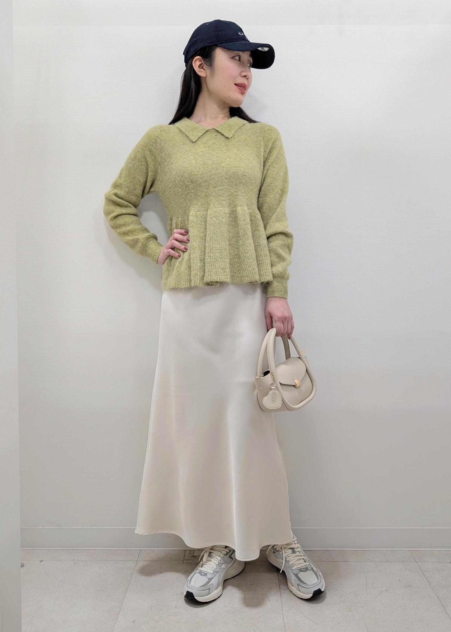 トレンドのペプラムニットに程よく女性らしいシルエットが出るスカートを合わせたカジュアル過ぎないスポーツミックスコーデ。