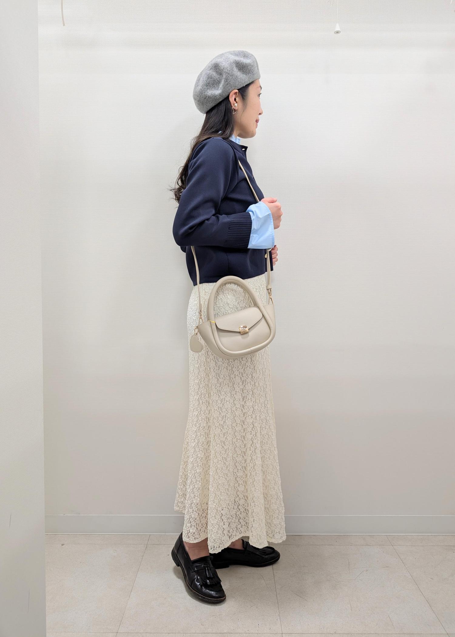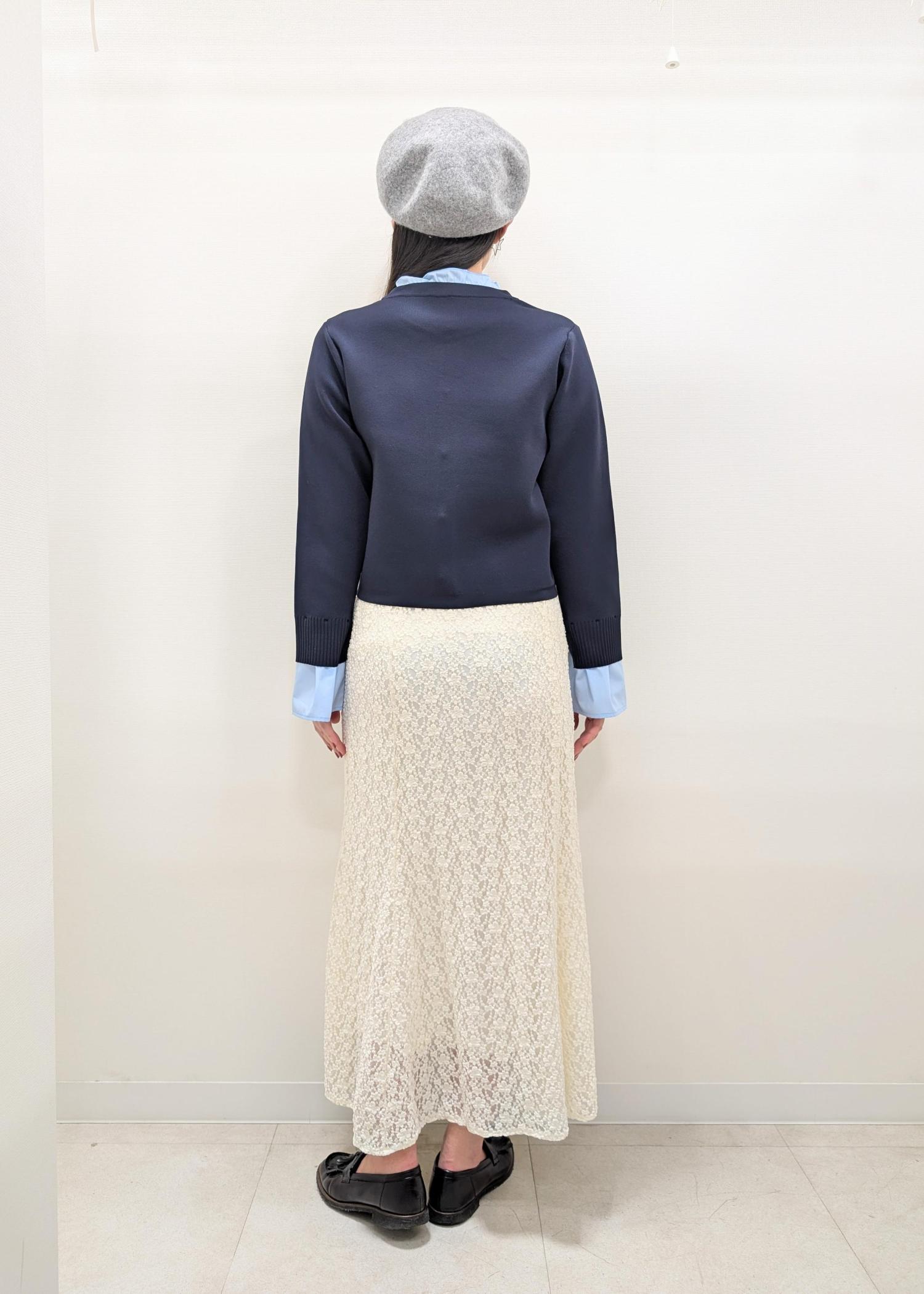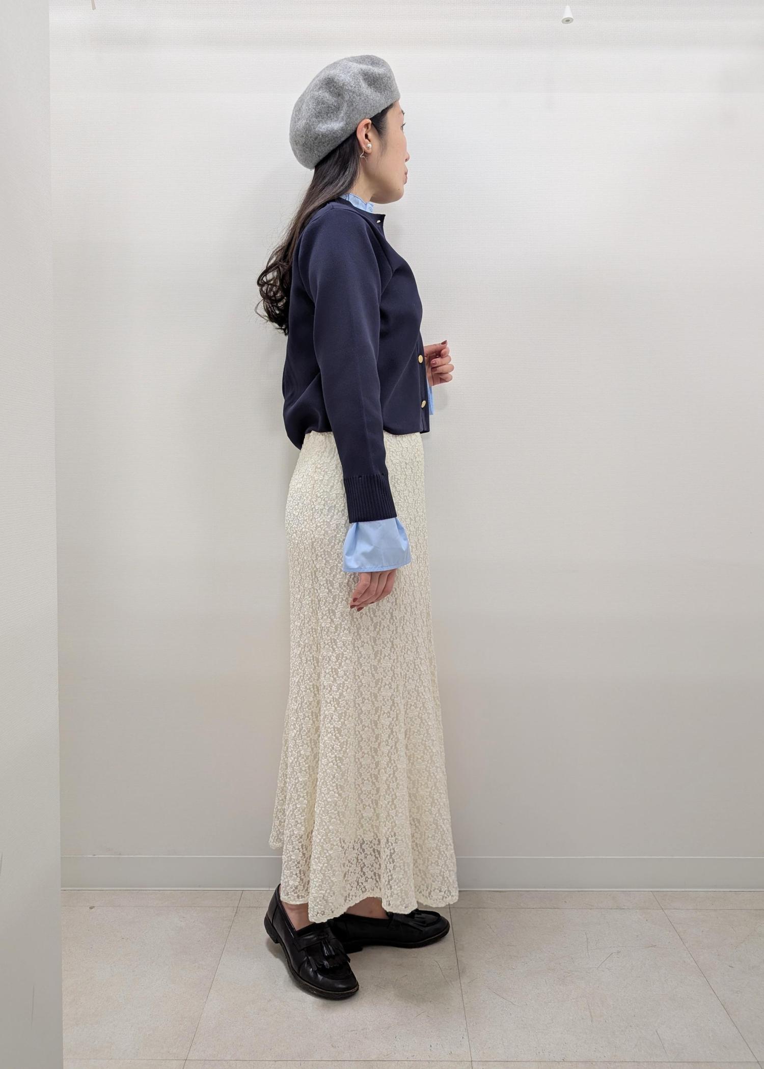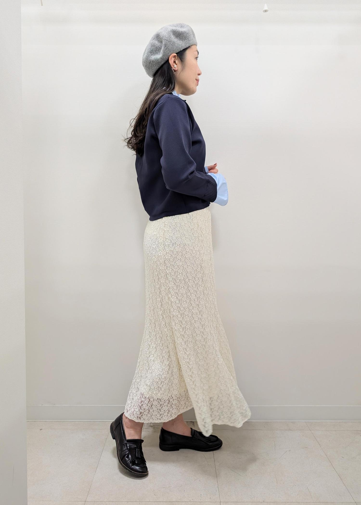 重ね着風カーディガン×楽ちんな履き心地のスカートの時短&映えコーディネート。