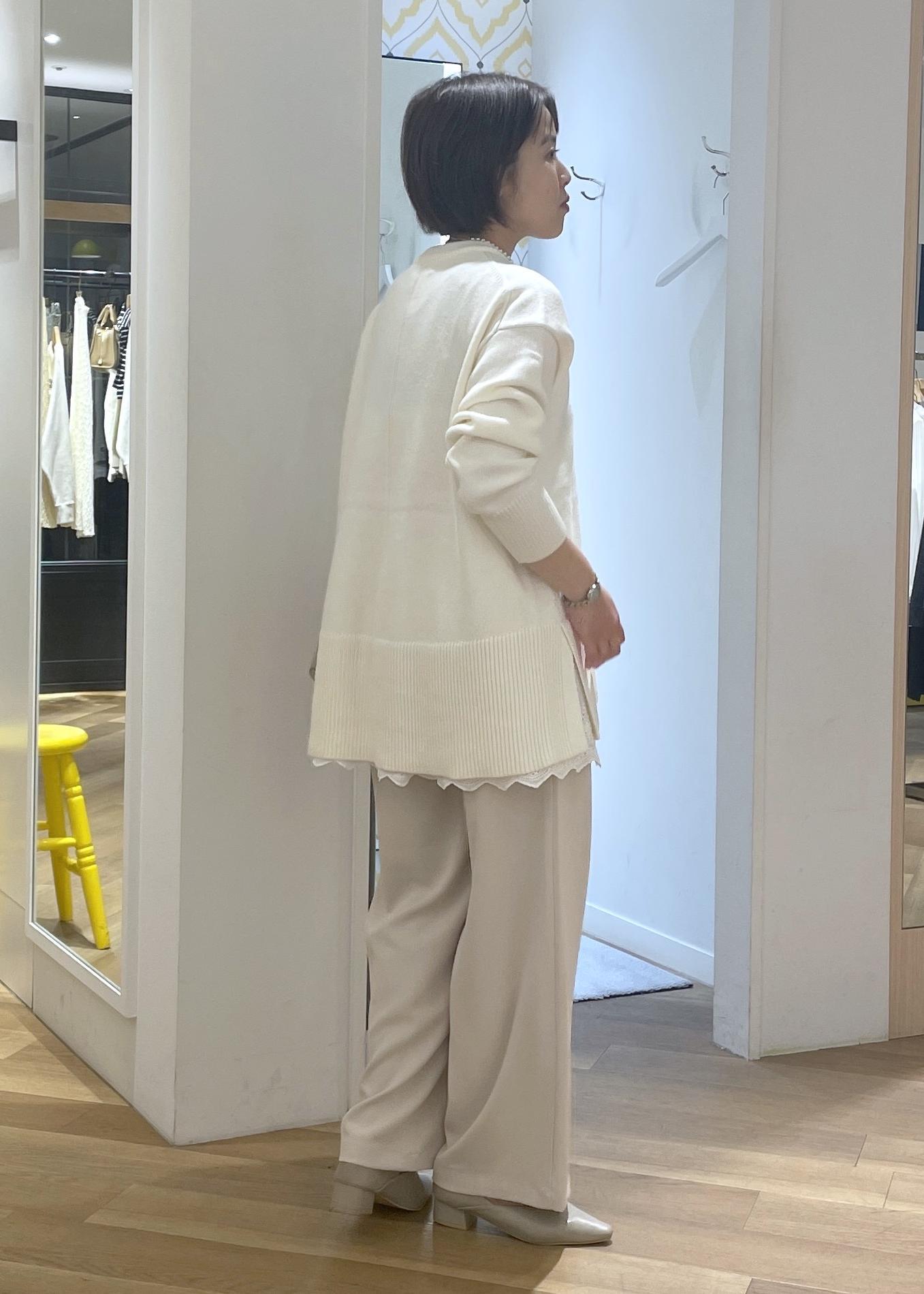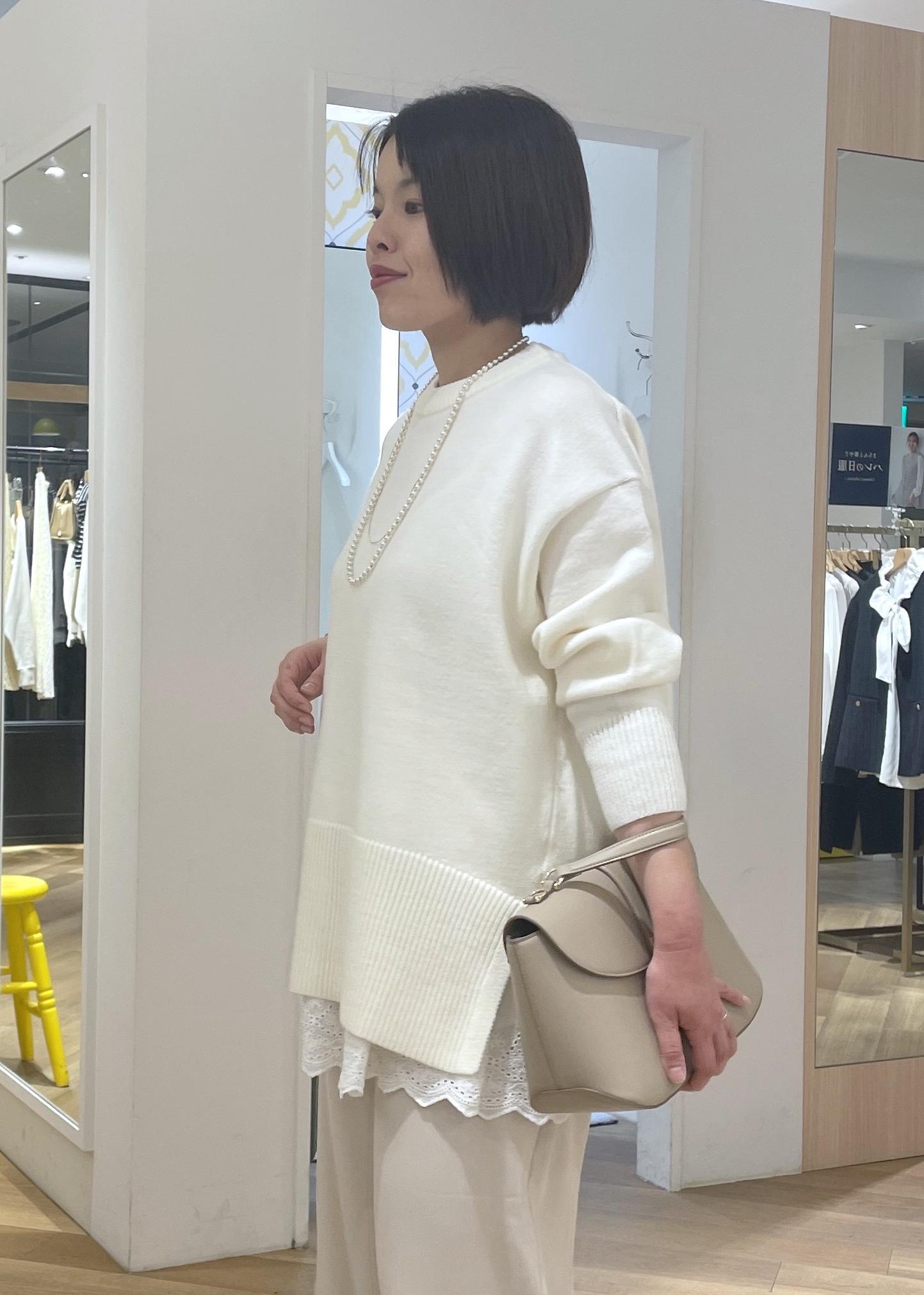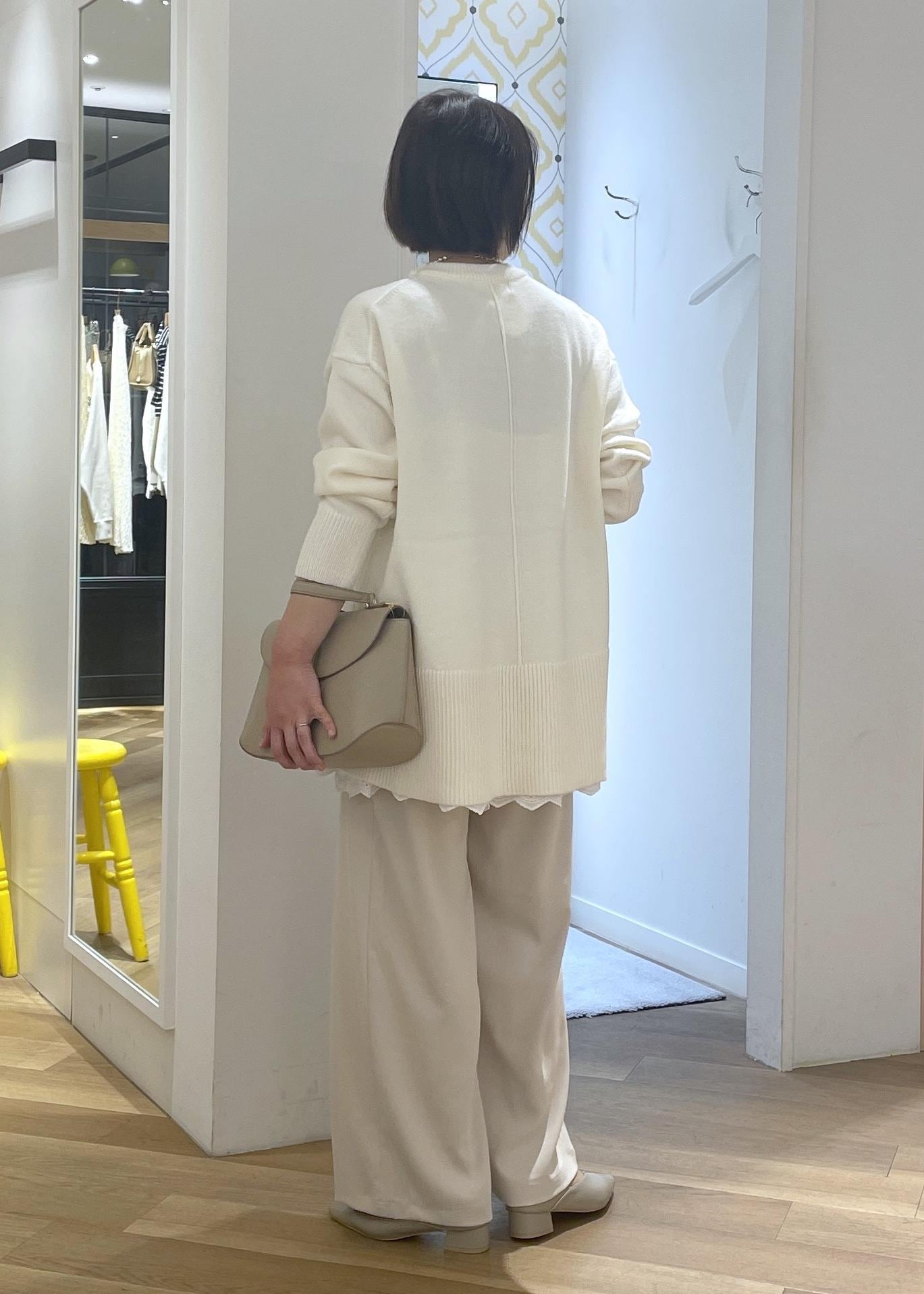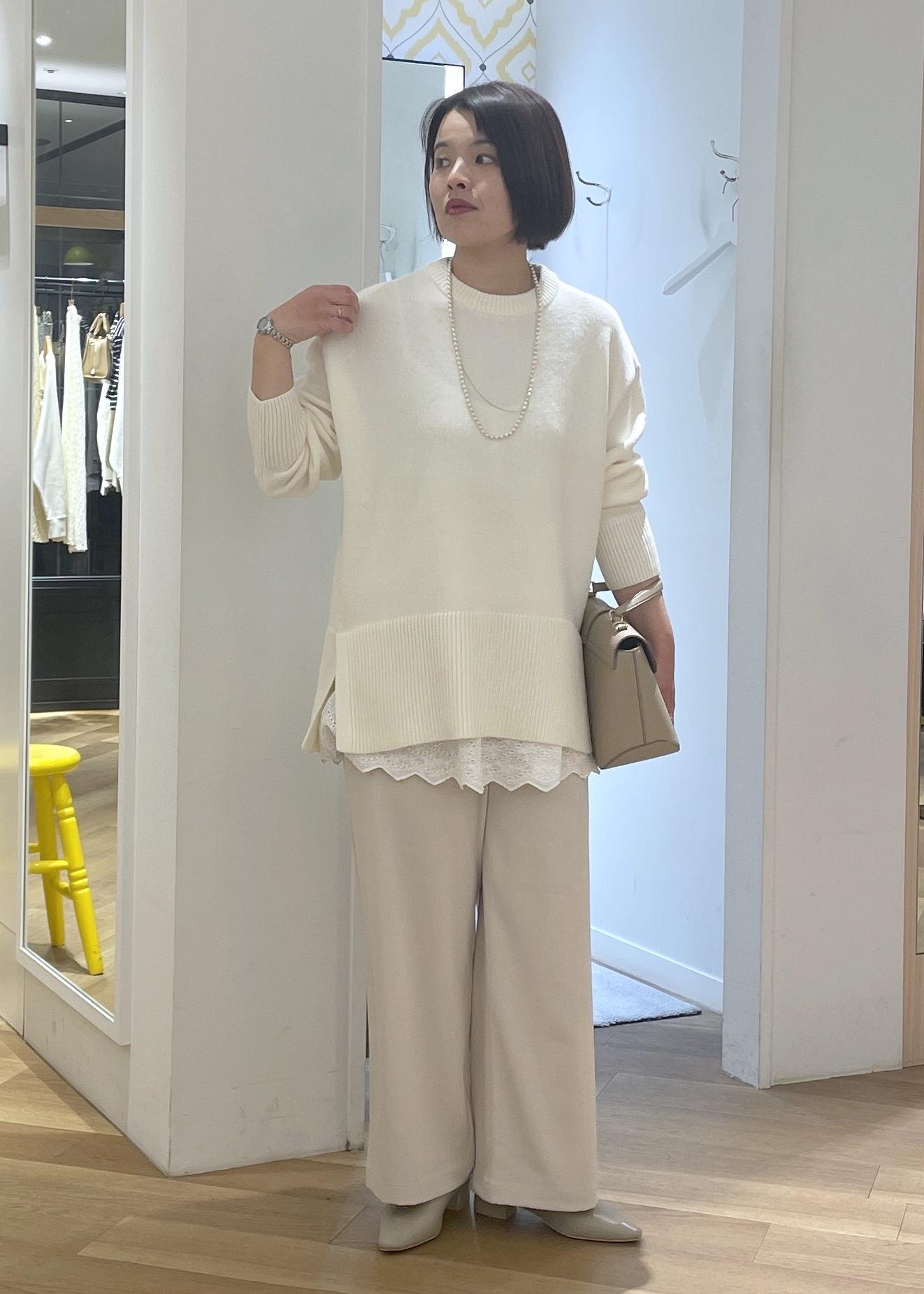 パンツがとろみのあるパンツなので、ニットコーデも品良く軽やかな印象で合わせることができます◎