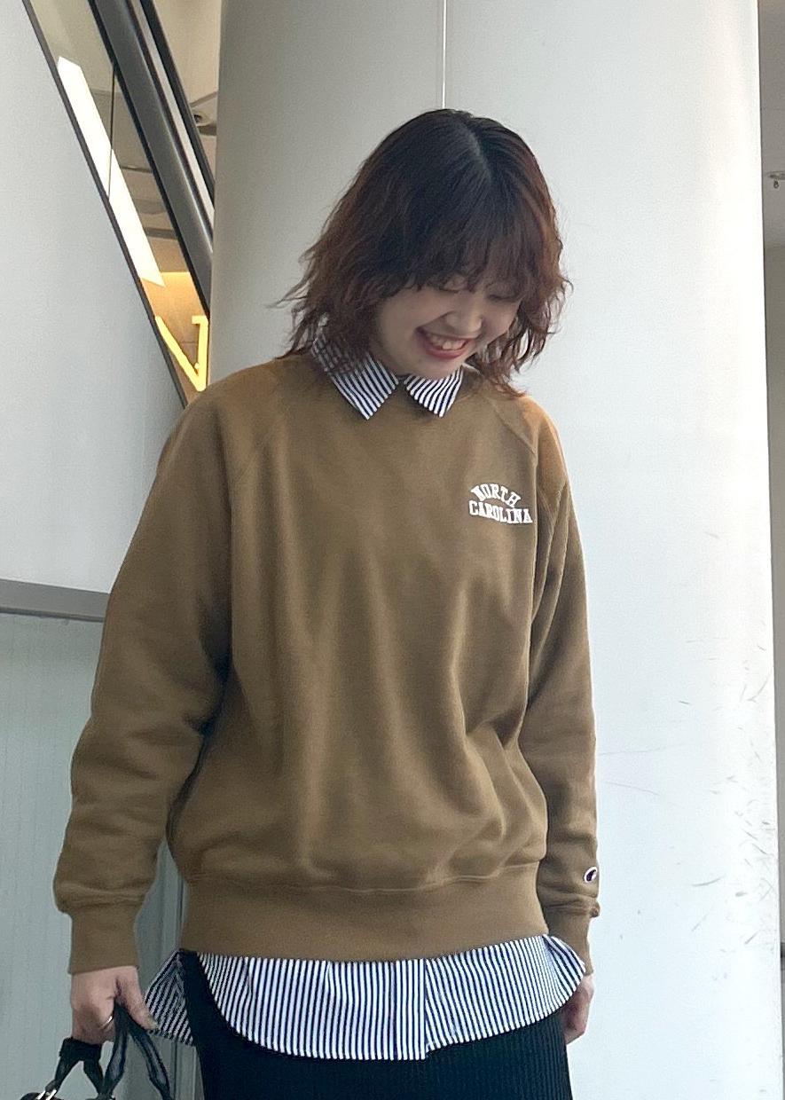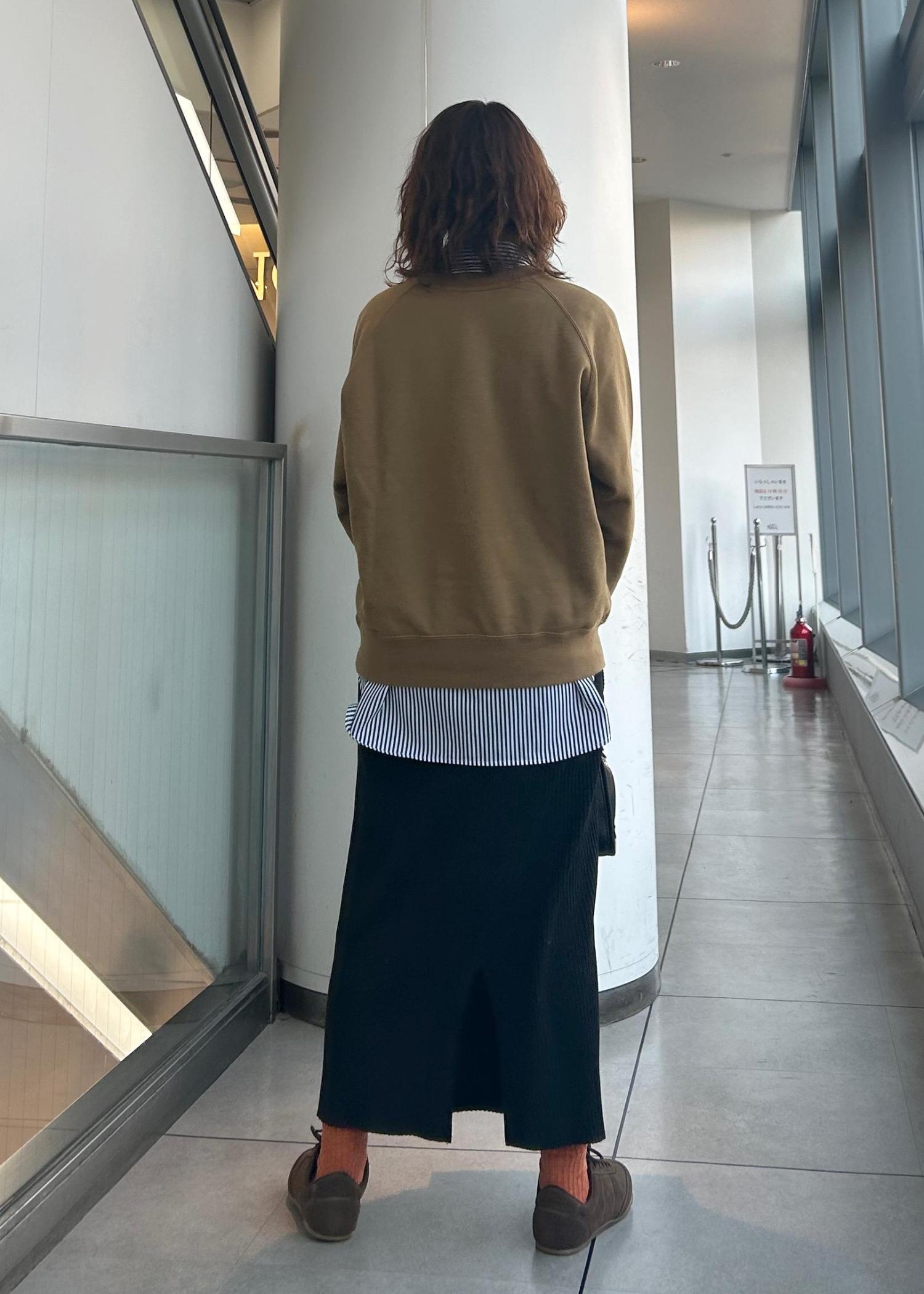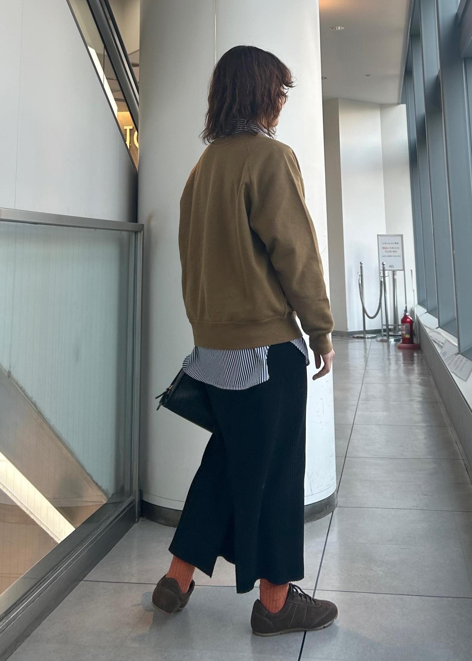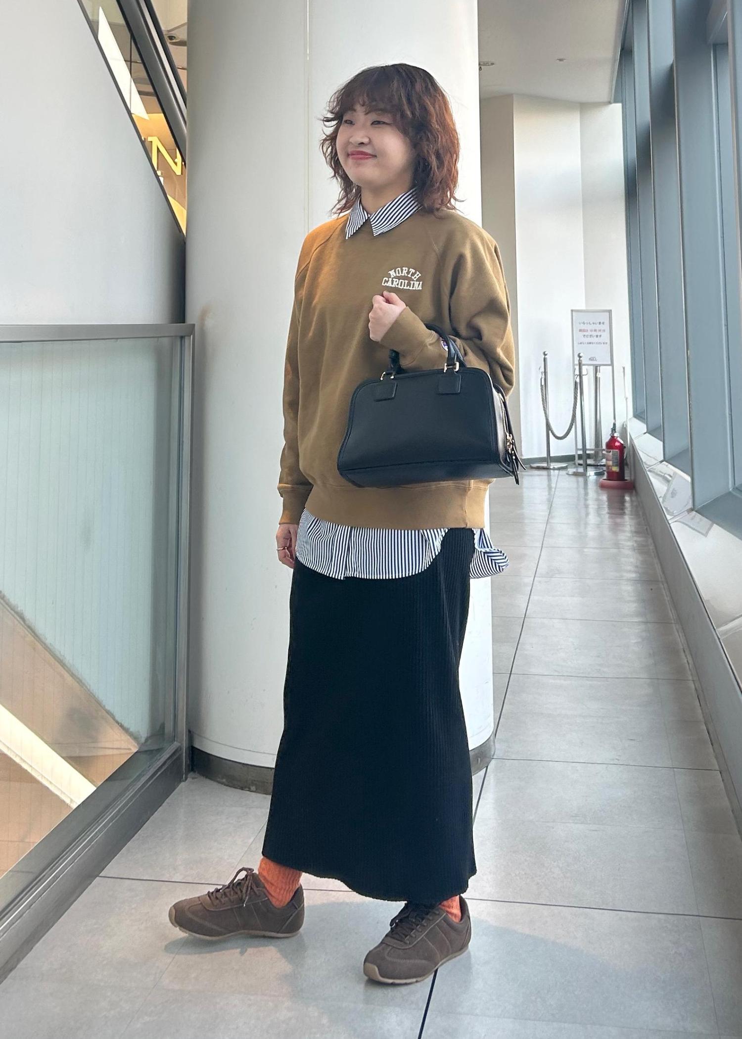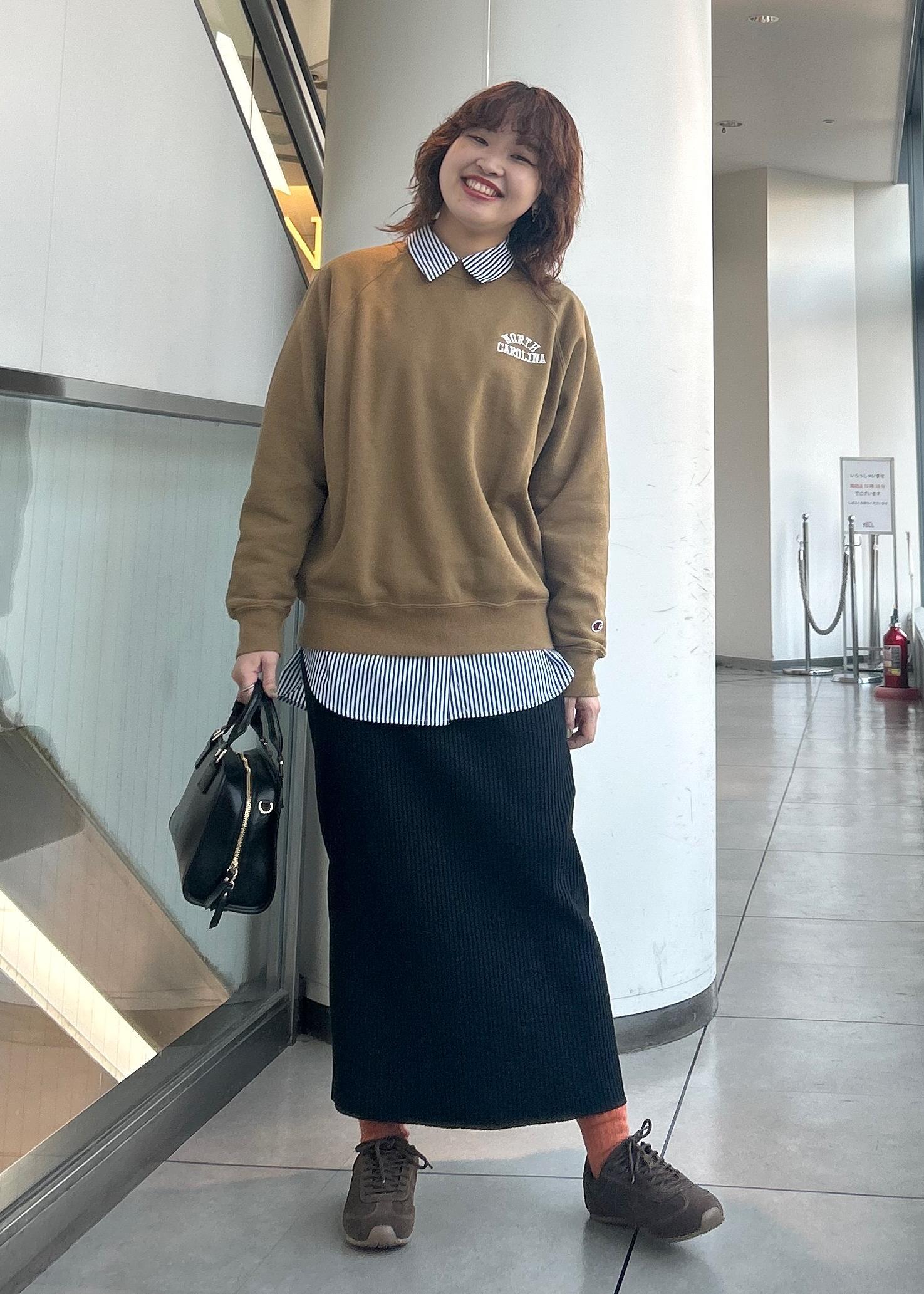 スウェットでカジュアル感を出しつつ、シャツとスカートでキレイめな雰囲気にまとめました!