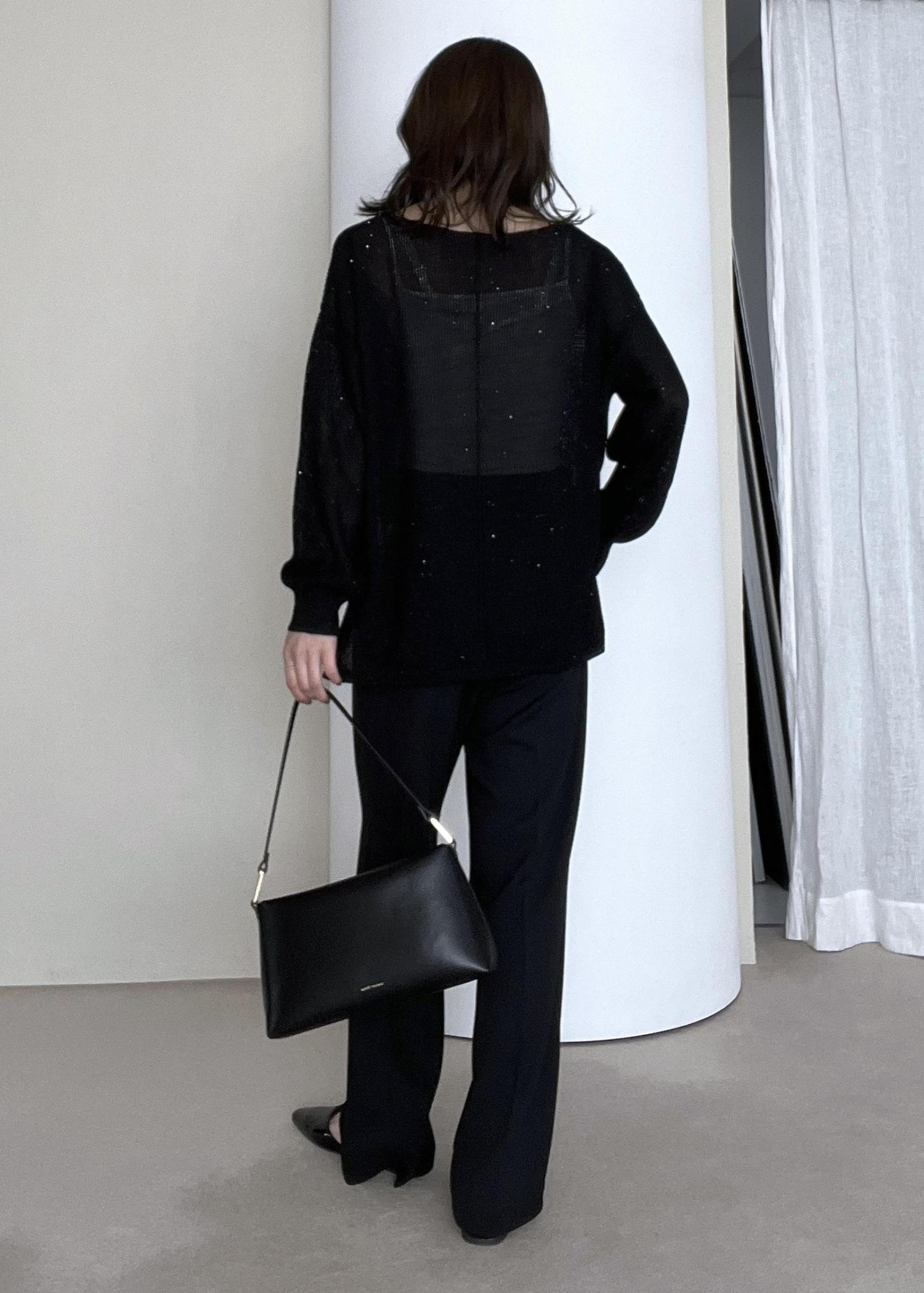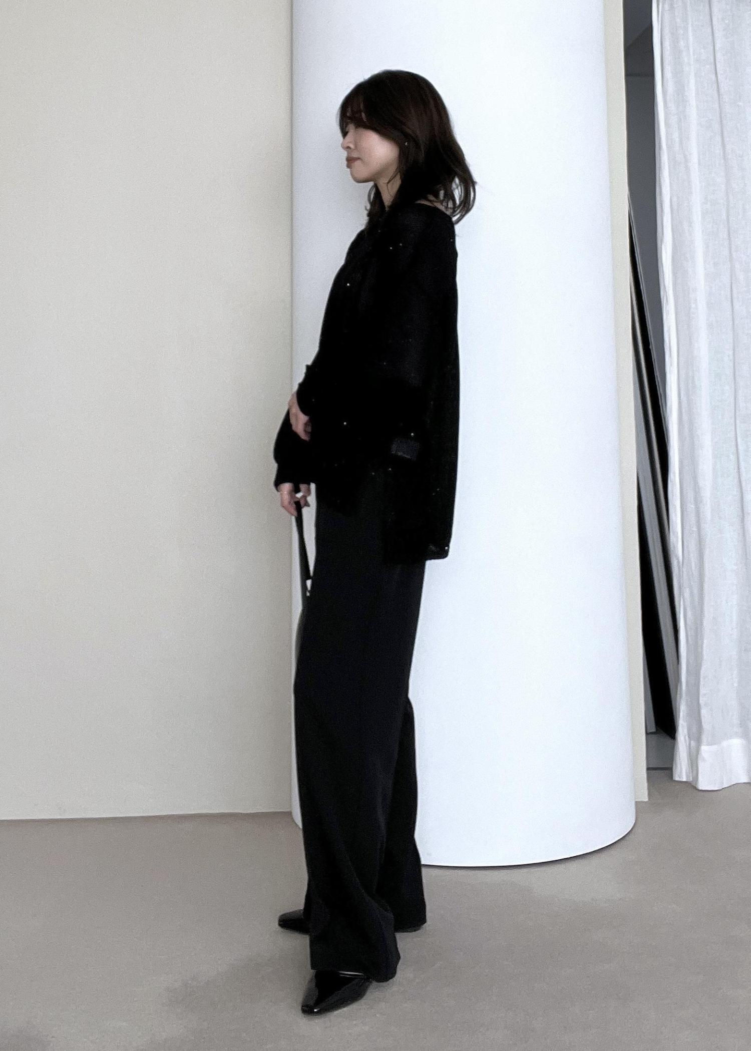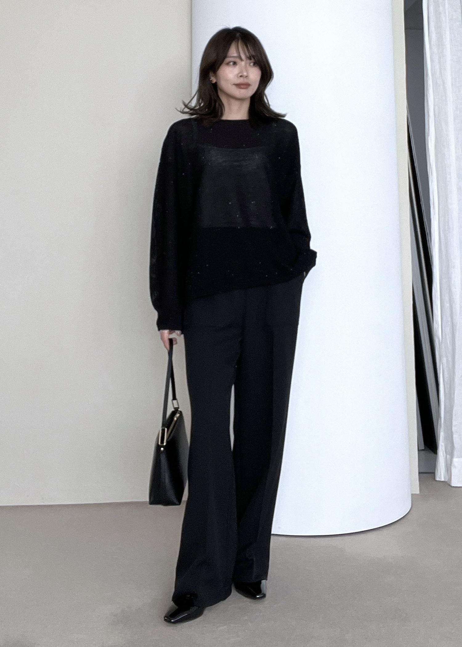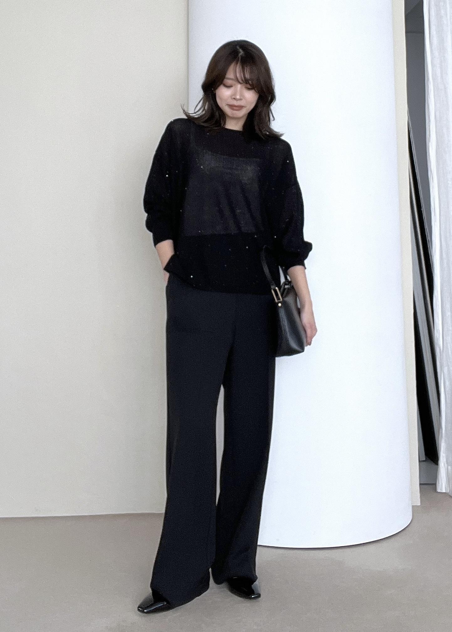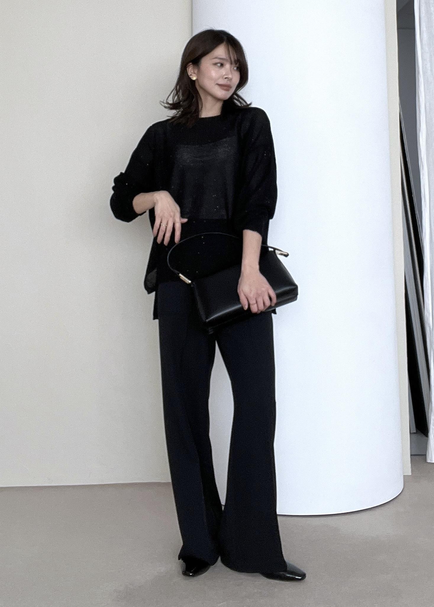 ニットは柔らかく透け感のある軽い生地感で、ブラックでも重たく見えないので春夏にも合わせやすいです。