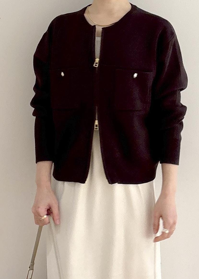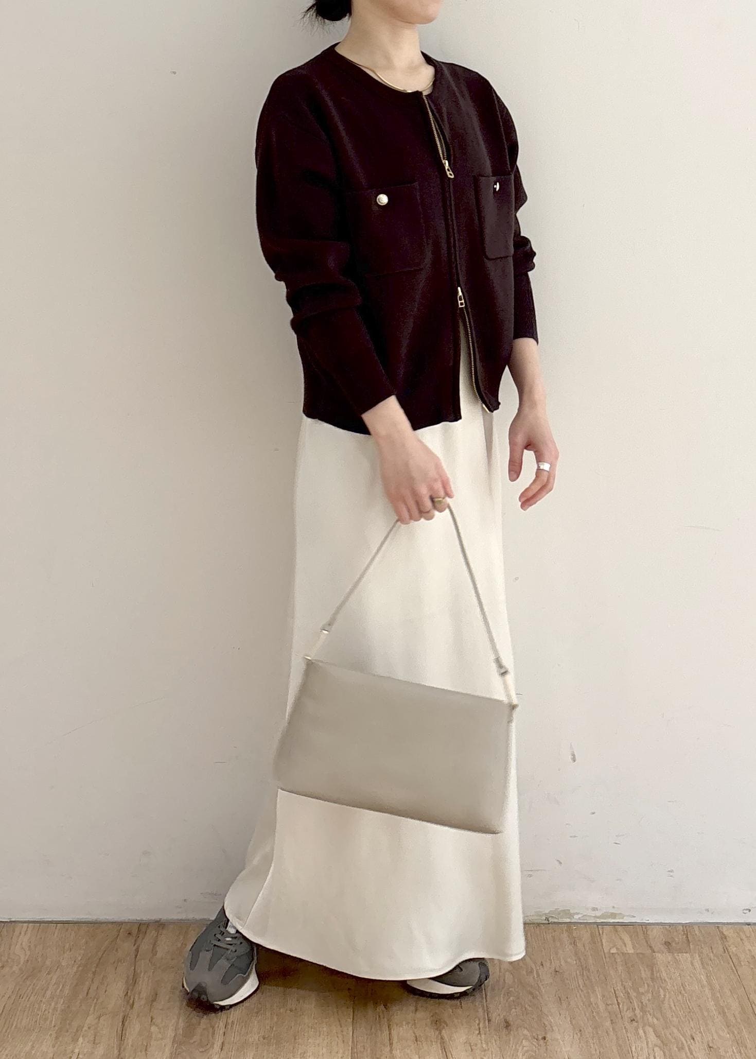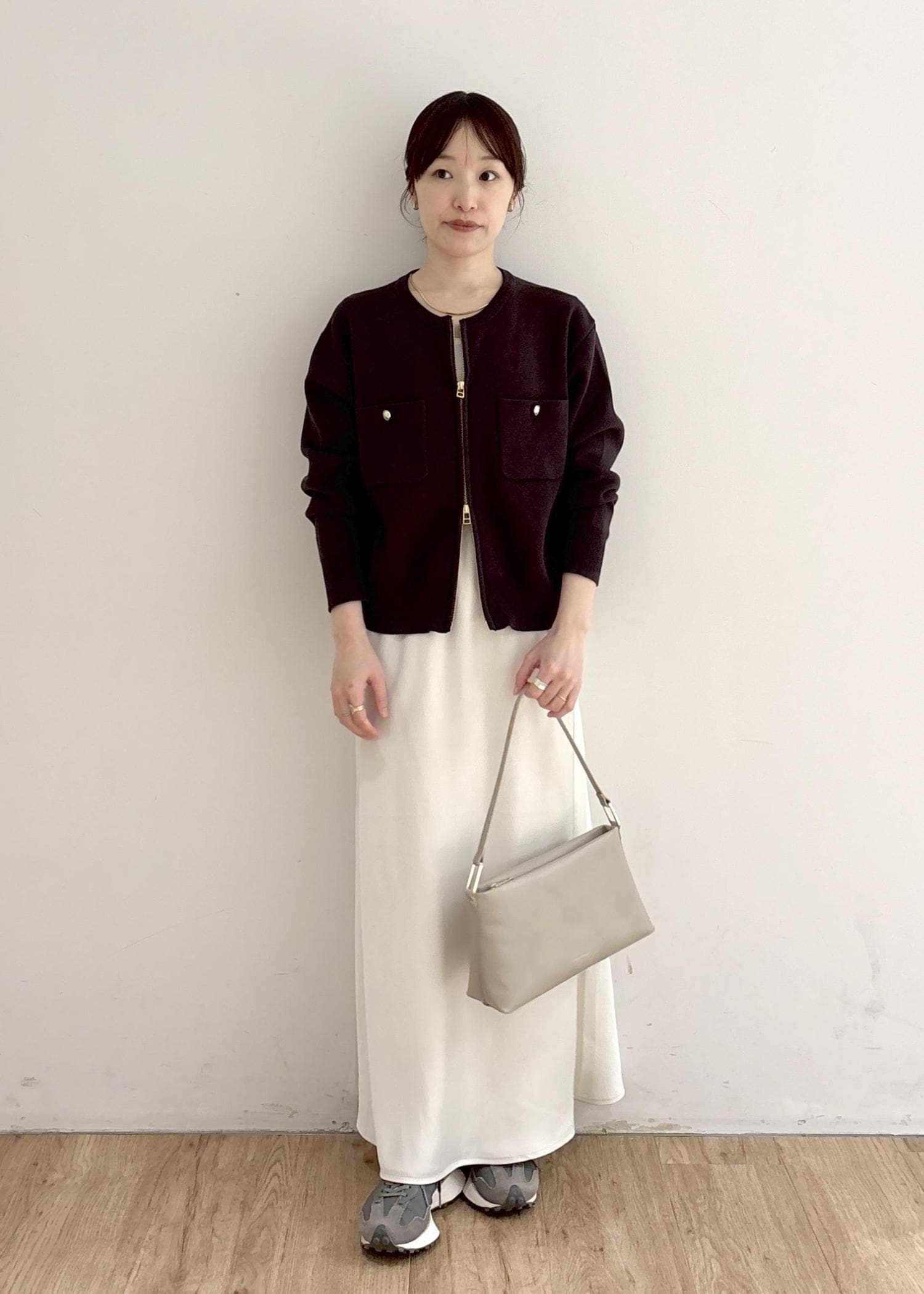 きれいめなスタイリングですが、スニーカーを合わせて少しカジュアルに。カーディガンはダブルジップなので、様々なスタイリングができます◎