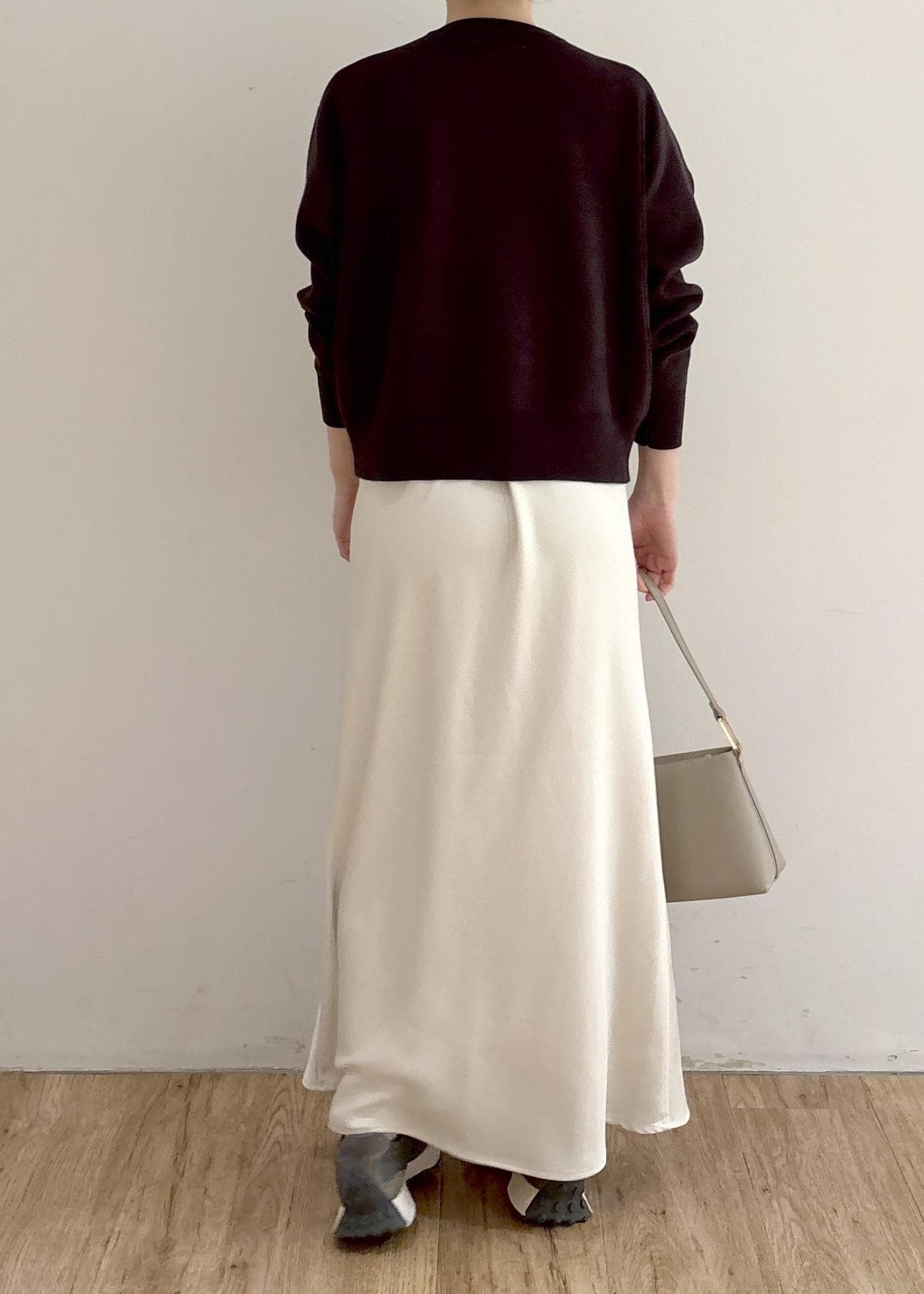 ROPÉ PICNIC細見えバイアスサテンスカート/イージーケアオフホワイト / F¥6,490レビューウエストはゴム仕様で少し緩めです。ウエストに合わせて履いて、ヒールなしの靴でも引きずらない長さになります。裏地はついていなく透けにくいですが、下着は色が透けないものやペチコート着用をおすすめします◎