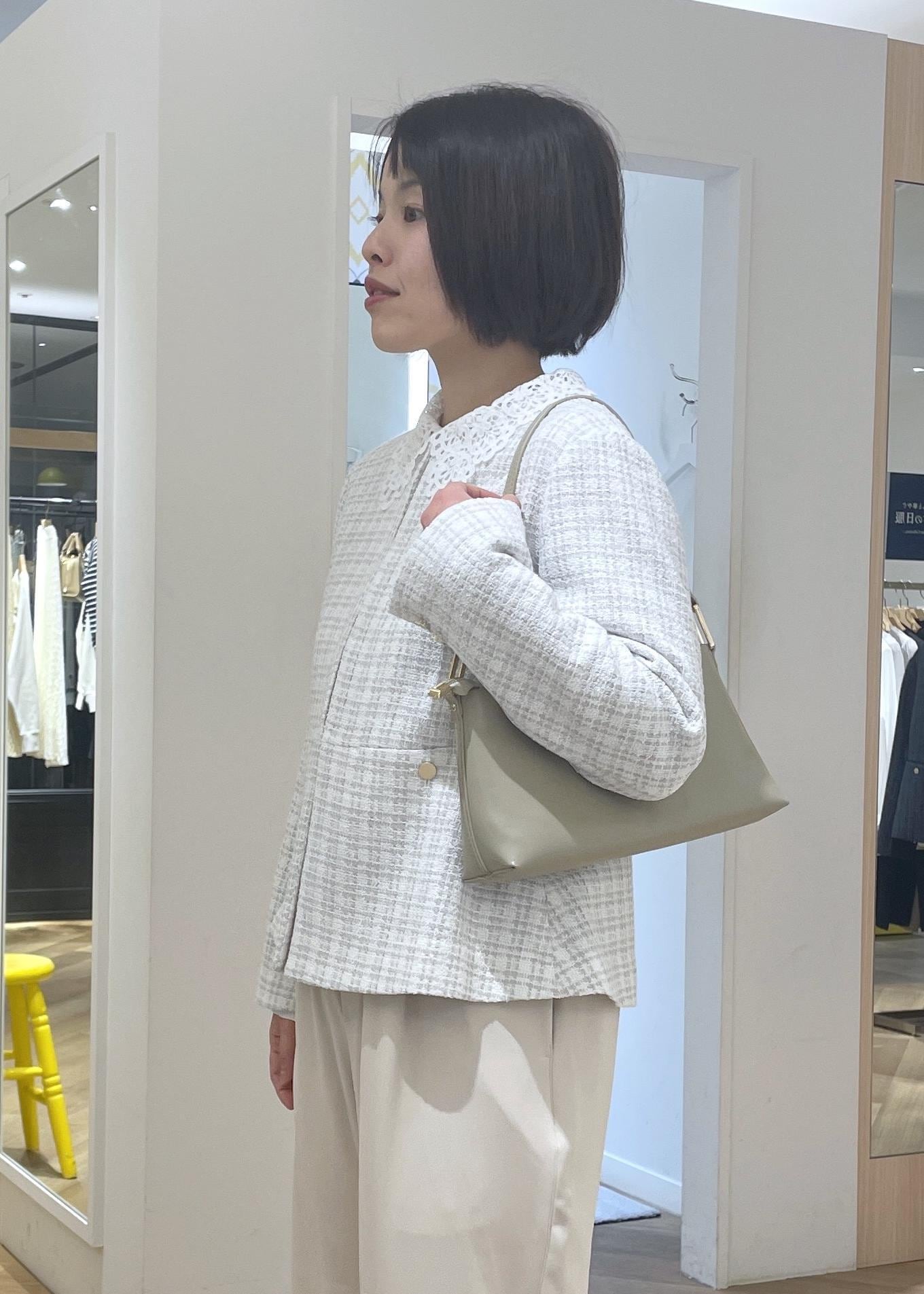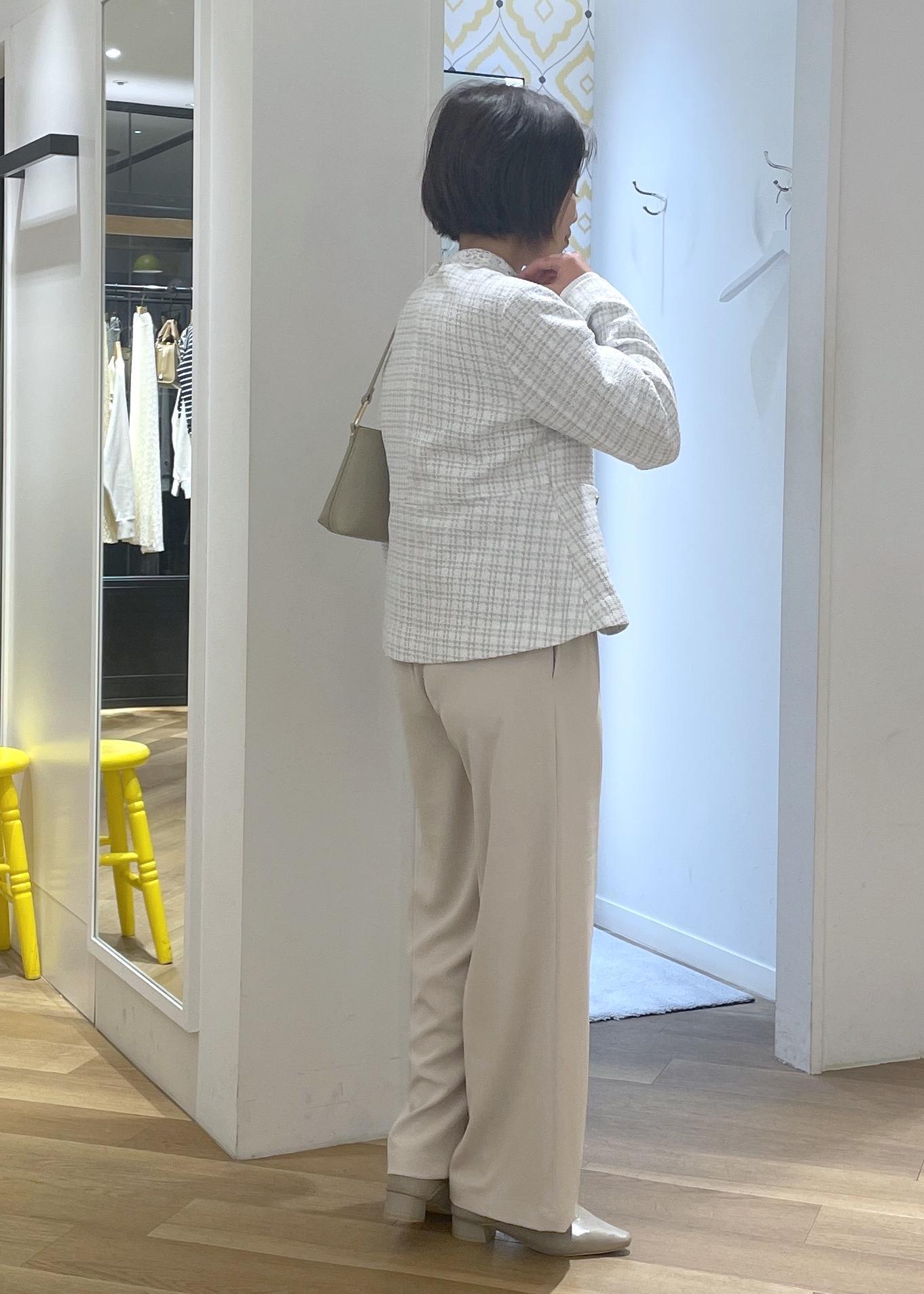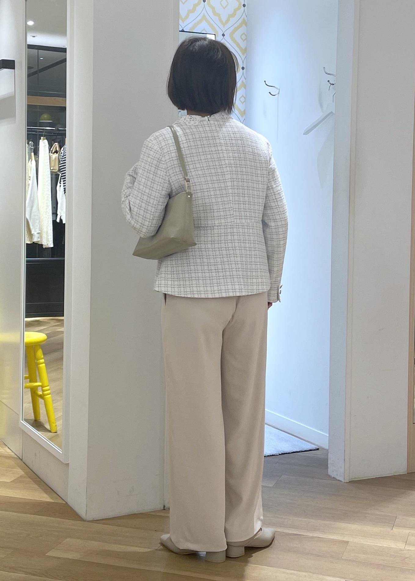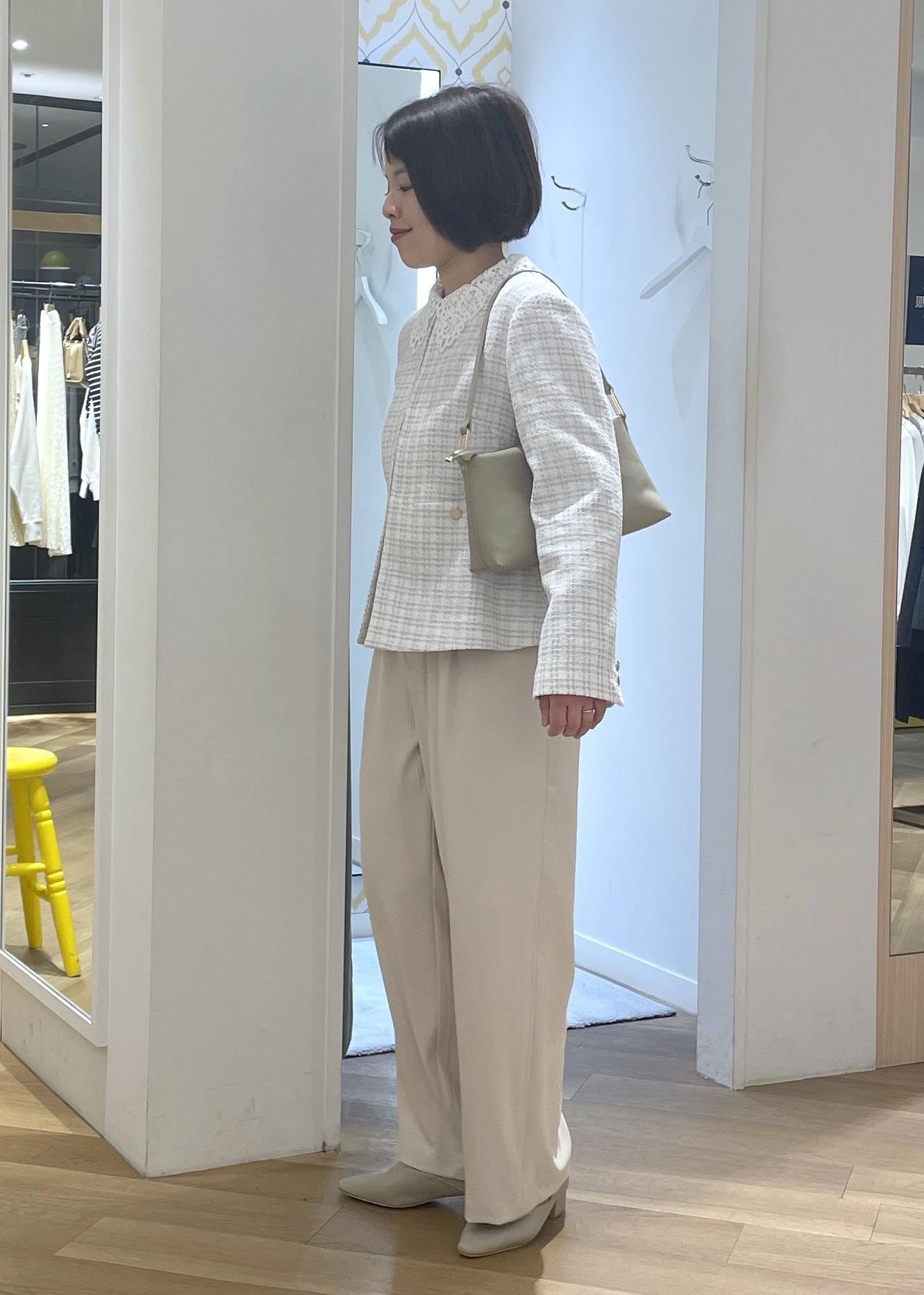 とろみのあるパンツできれい見えも叶うので、華やかなツイードジャケットを合わせればセレモニーでも使えるコーデに◎