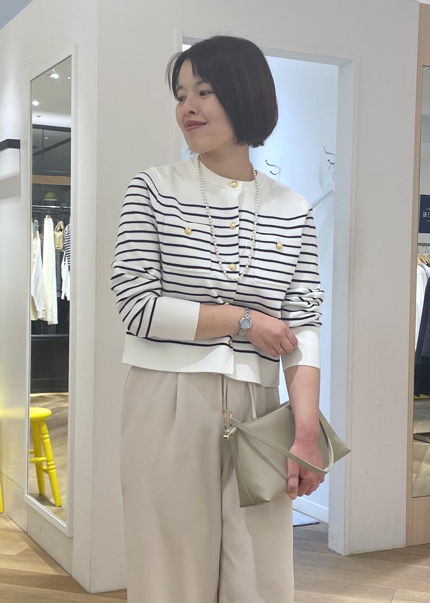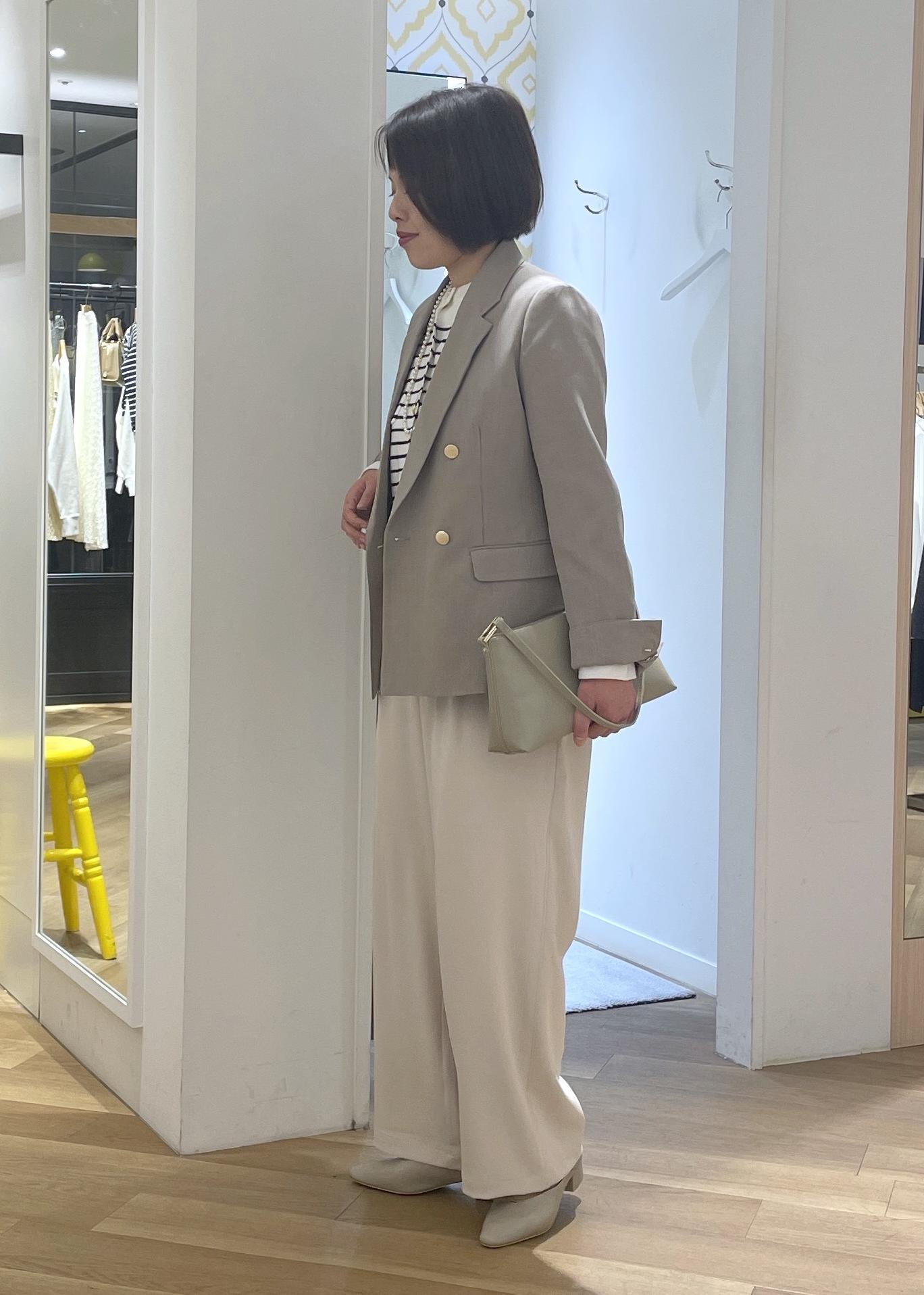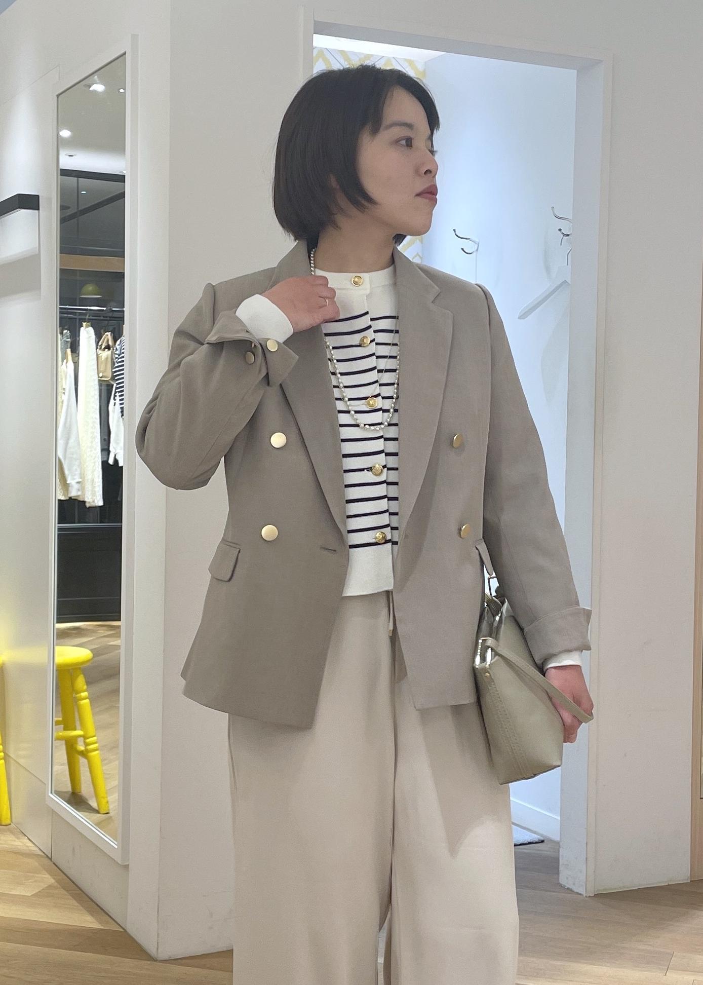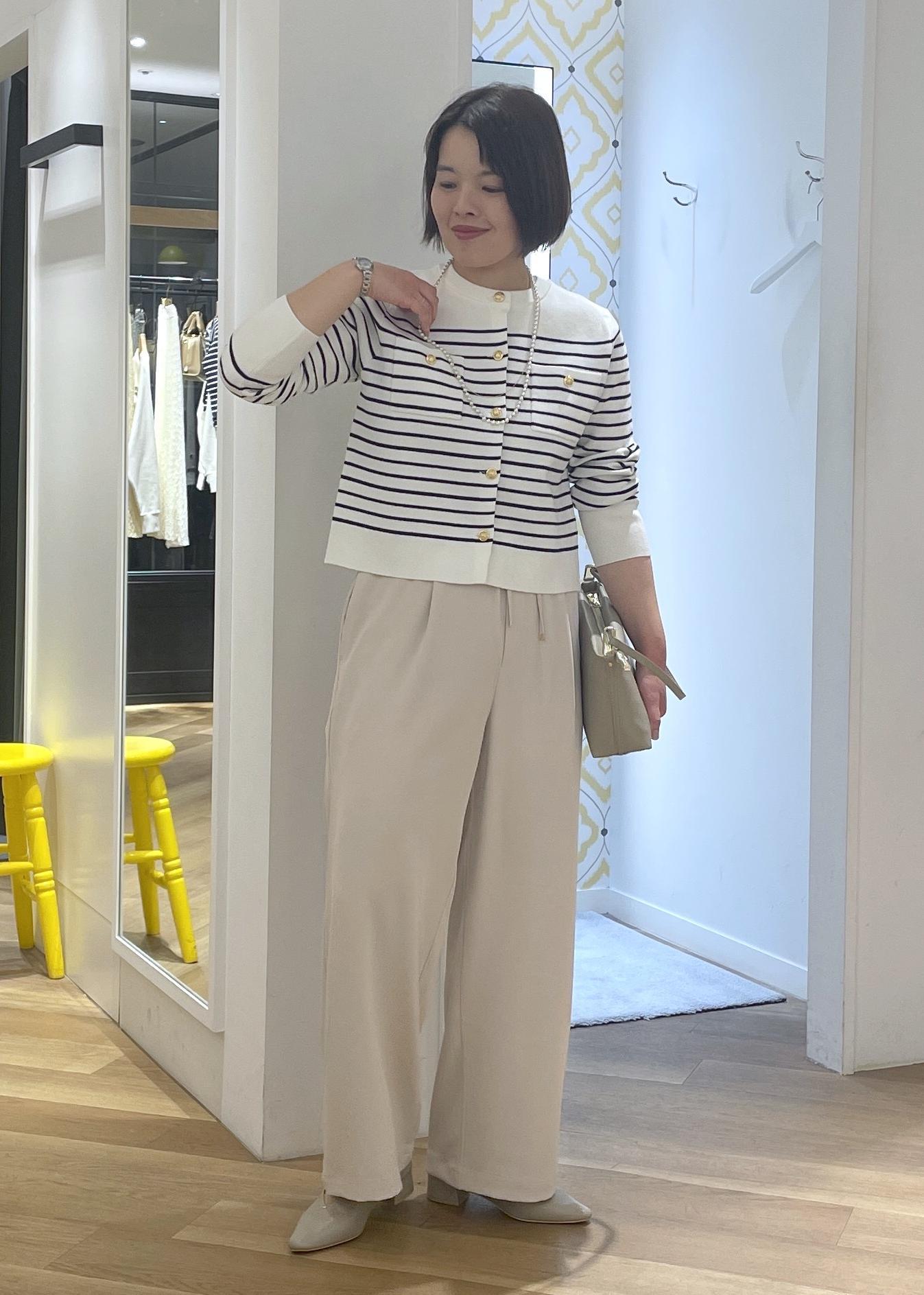 淡いブラウンのジャケットにボーダーのカーディガンを合わせた、春に着たいマリンテイストのきれいめカジュアルコーデです!