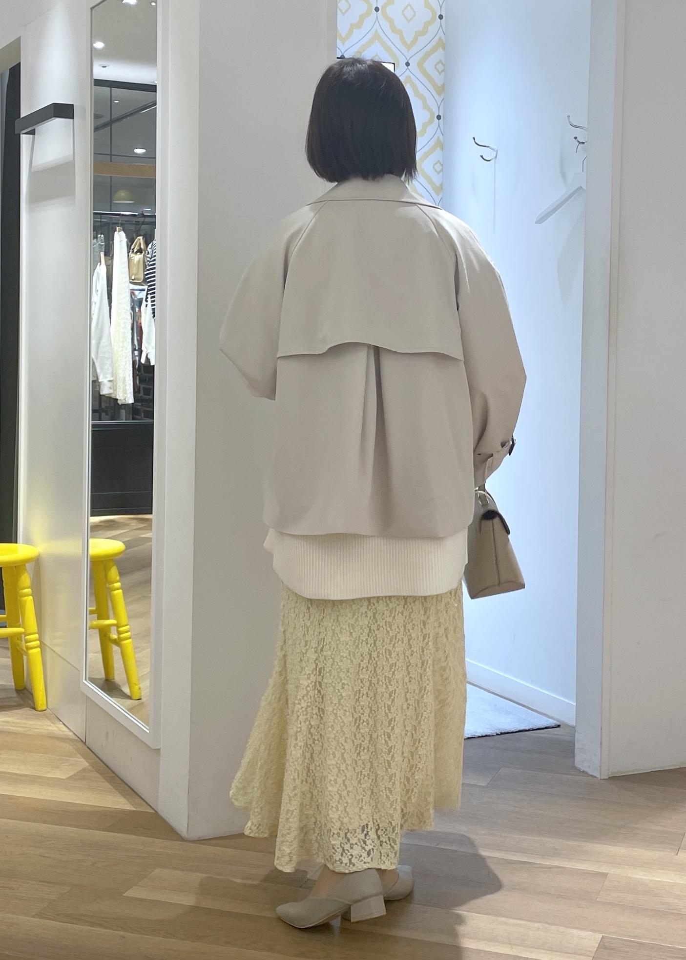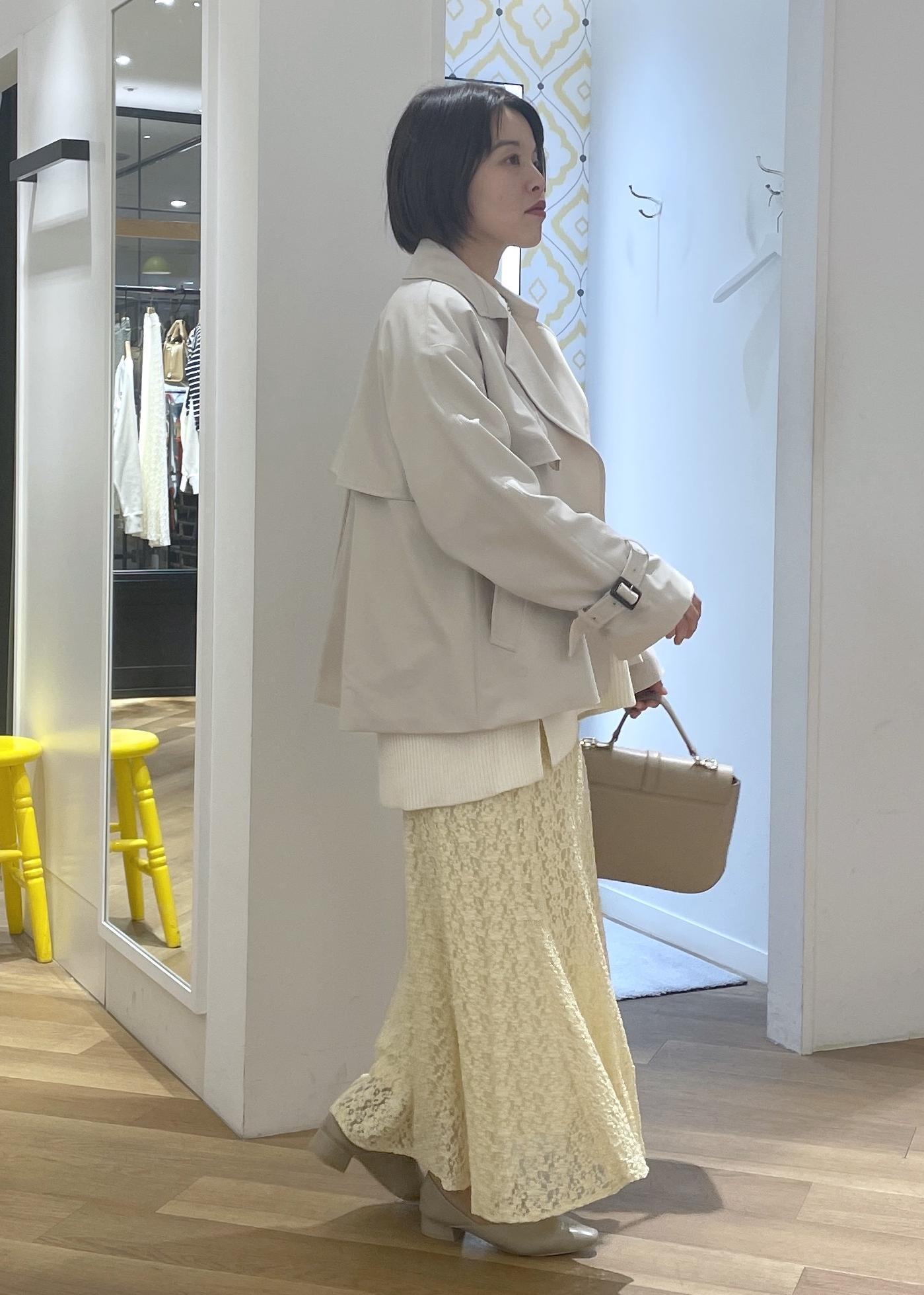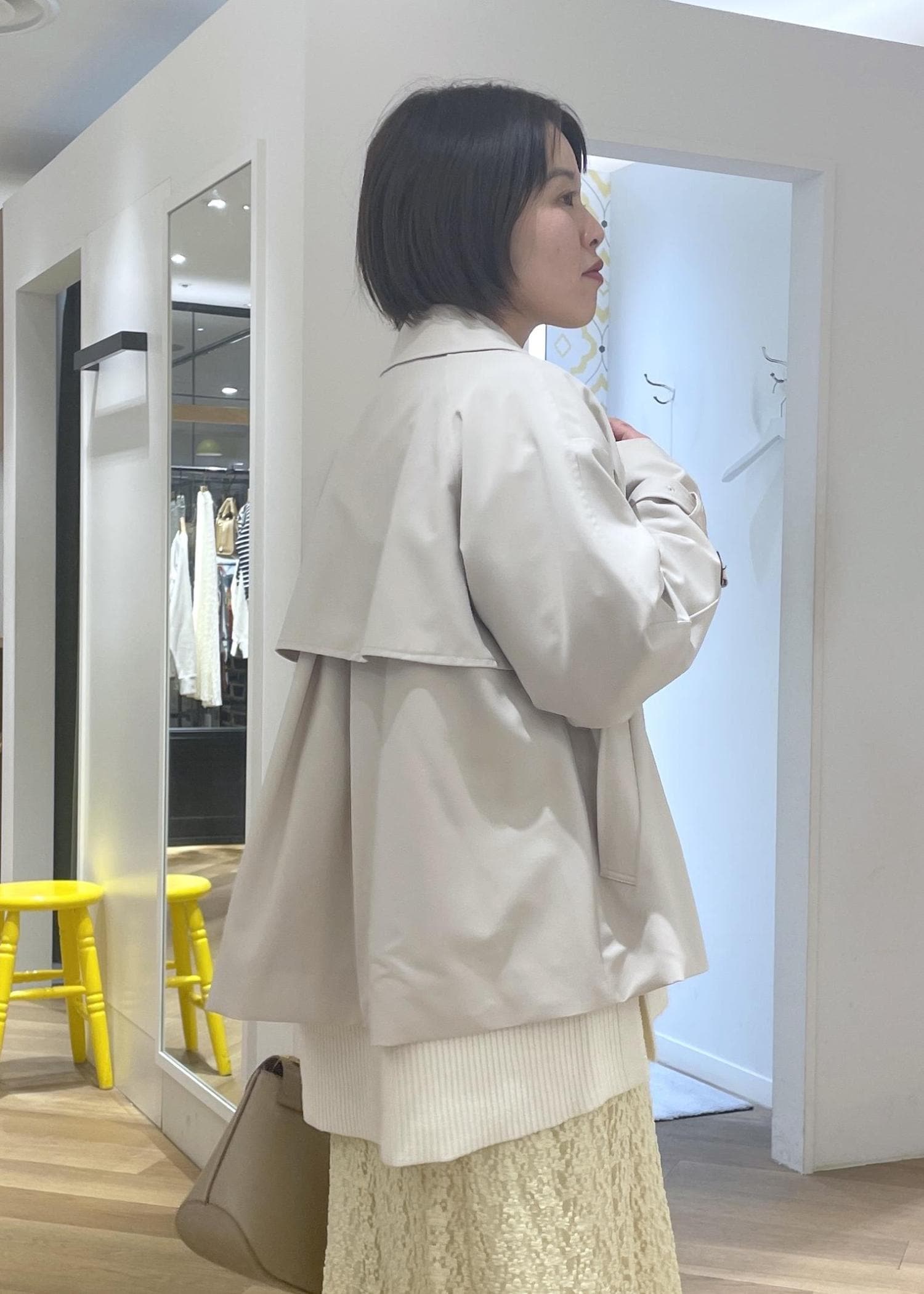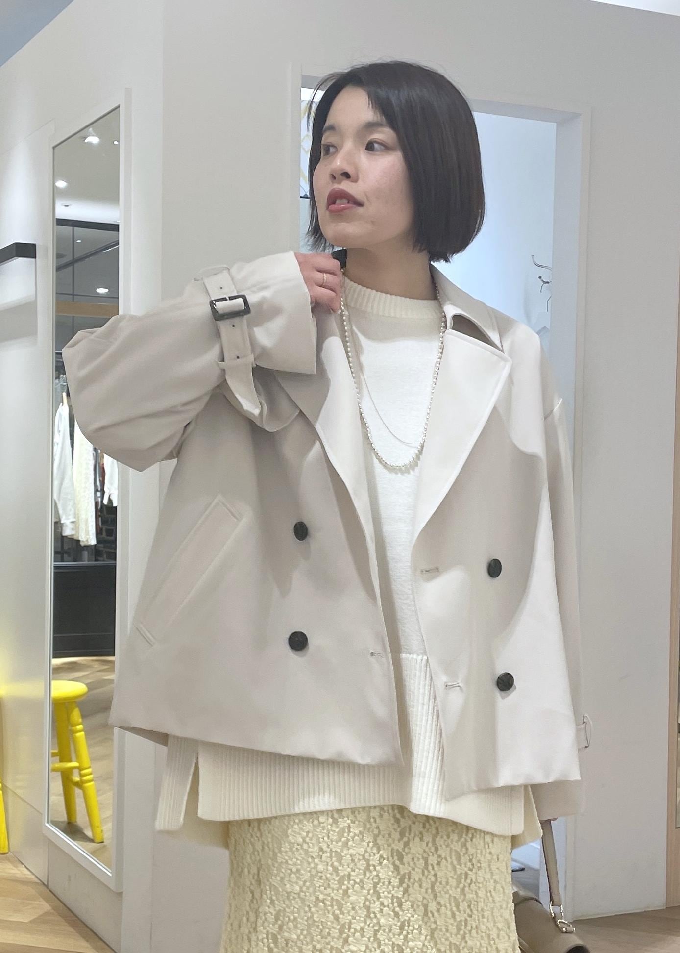 春に着たくなるベージュのショートトレンチに白ニットを合わせた、柔らかな印象の大人カジュアルコーデです!