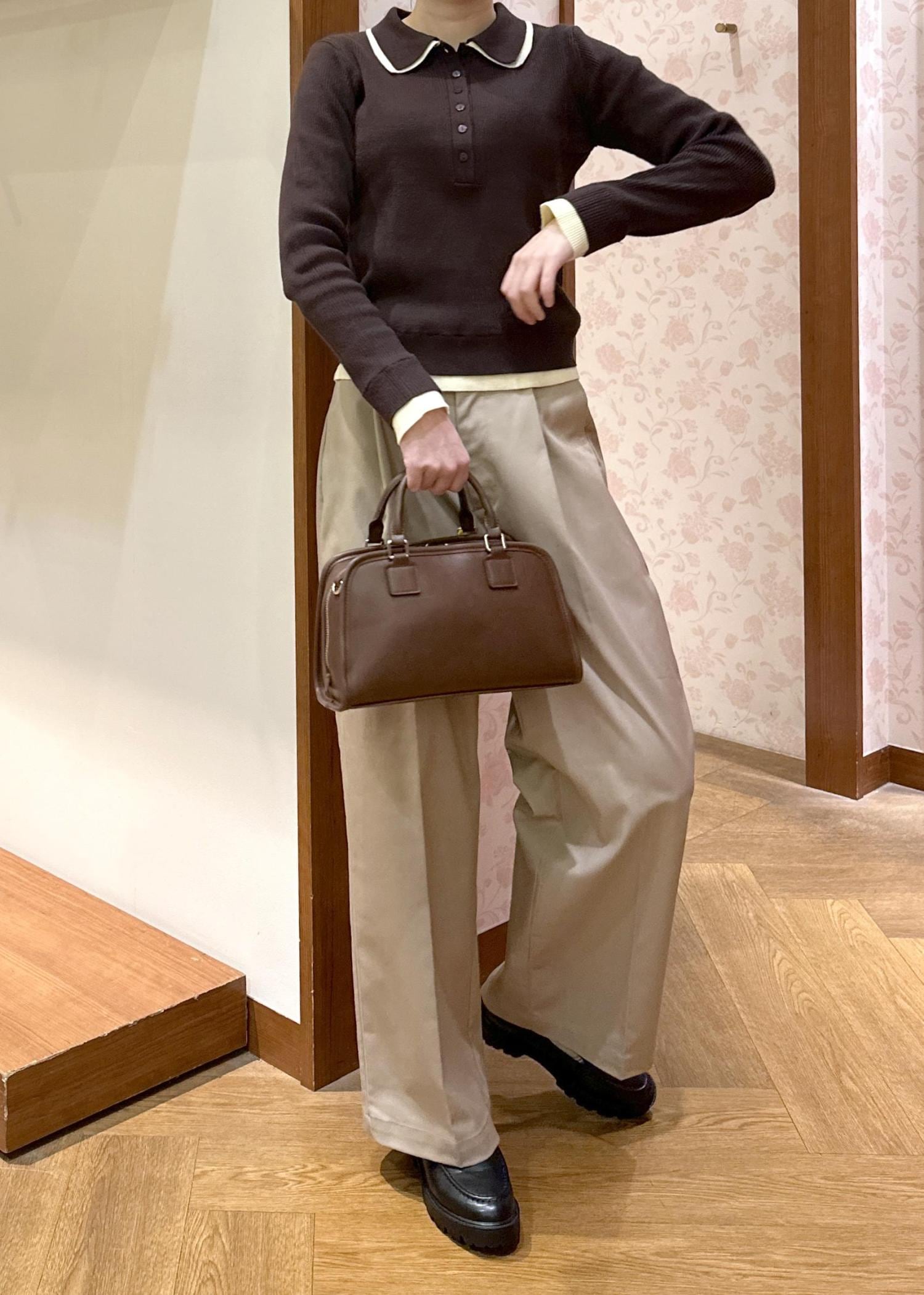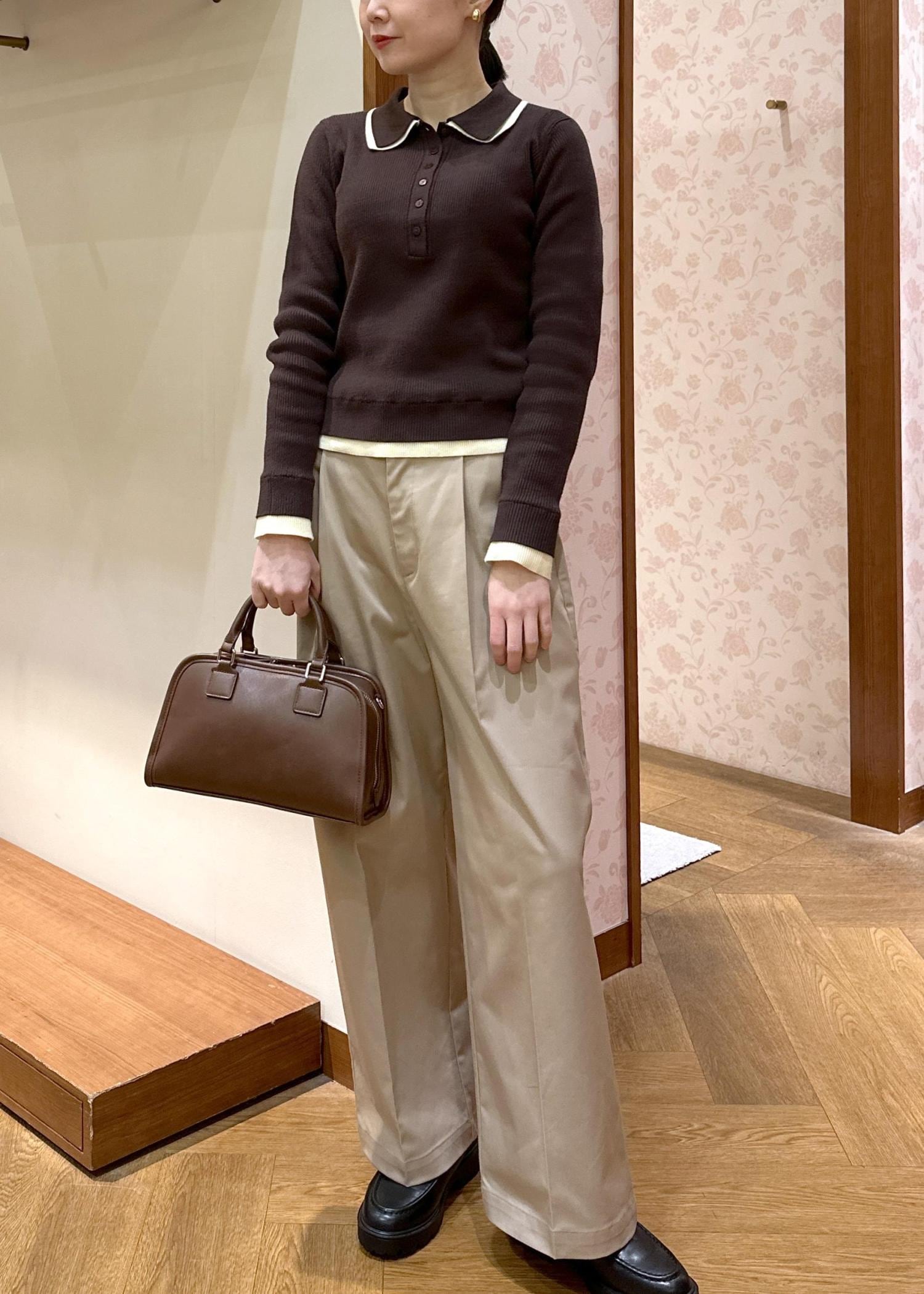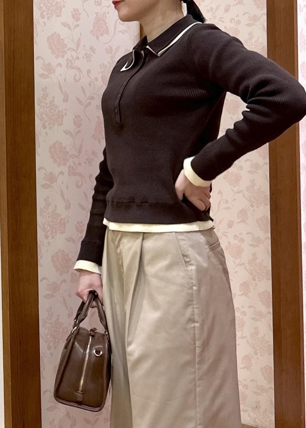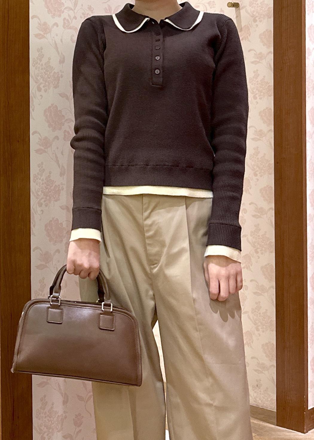 衿が苦手な方にも、おすすめのニットポロです。柔らかいだけではなく、着るだけで腰が高く見えるのでバランスよくお召しいただけます。