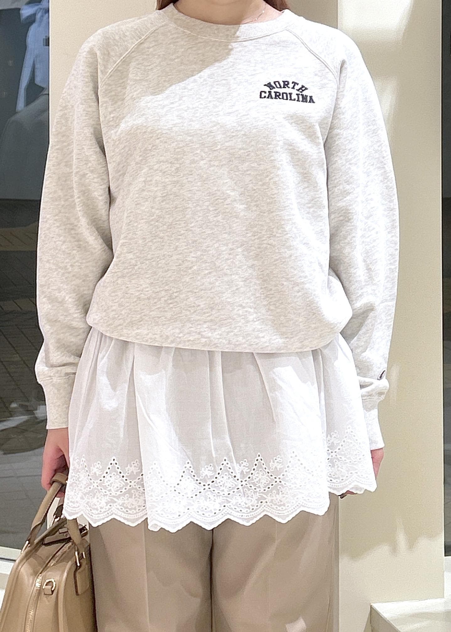 スウェットとチノパンだけでも可愛いですが、少しカジュアルすぎるのでレースビスチェをインナーに取り合えることで、ガーリーさが増して着やすいコーデにまとめました。