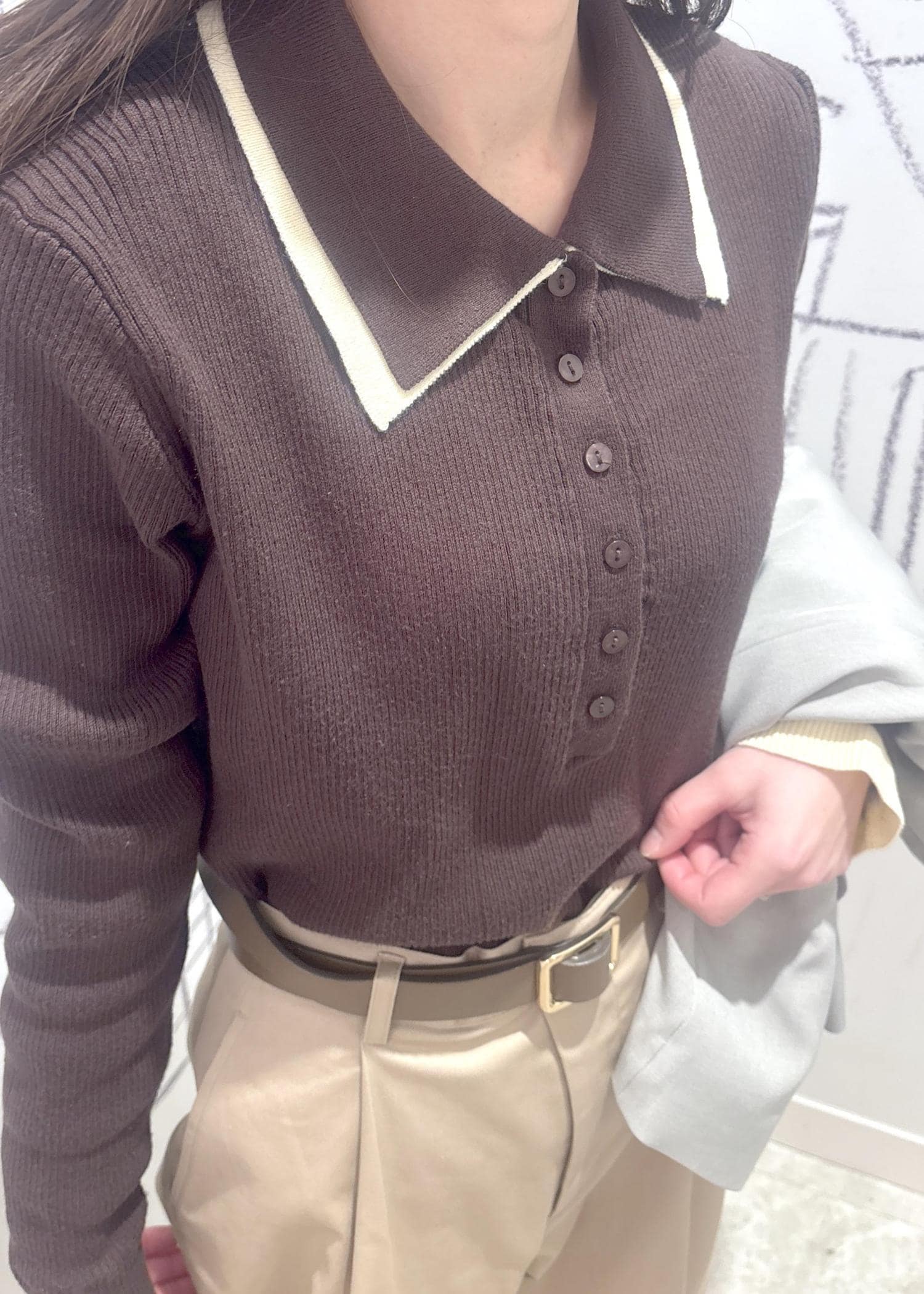 インナーにレイヤード襟のポロニット、チノパンを合わせてカジュアルな着こなしに。