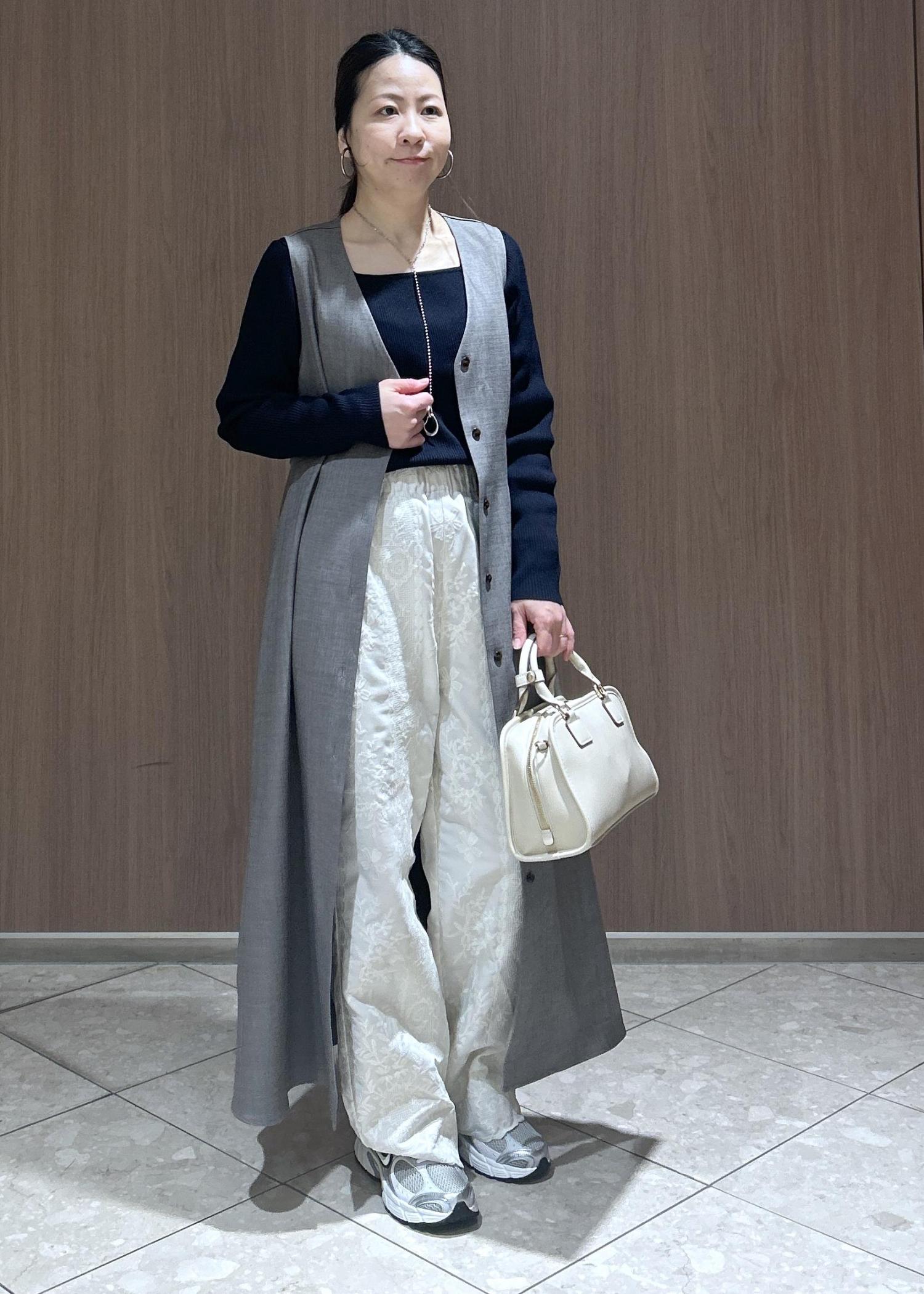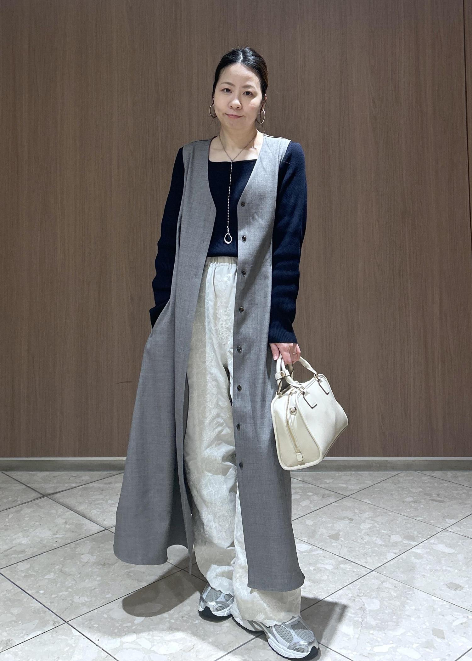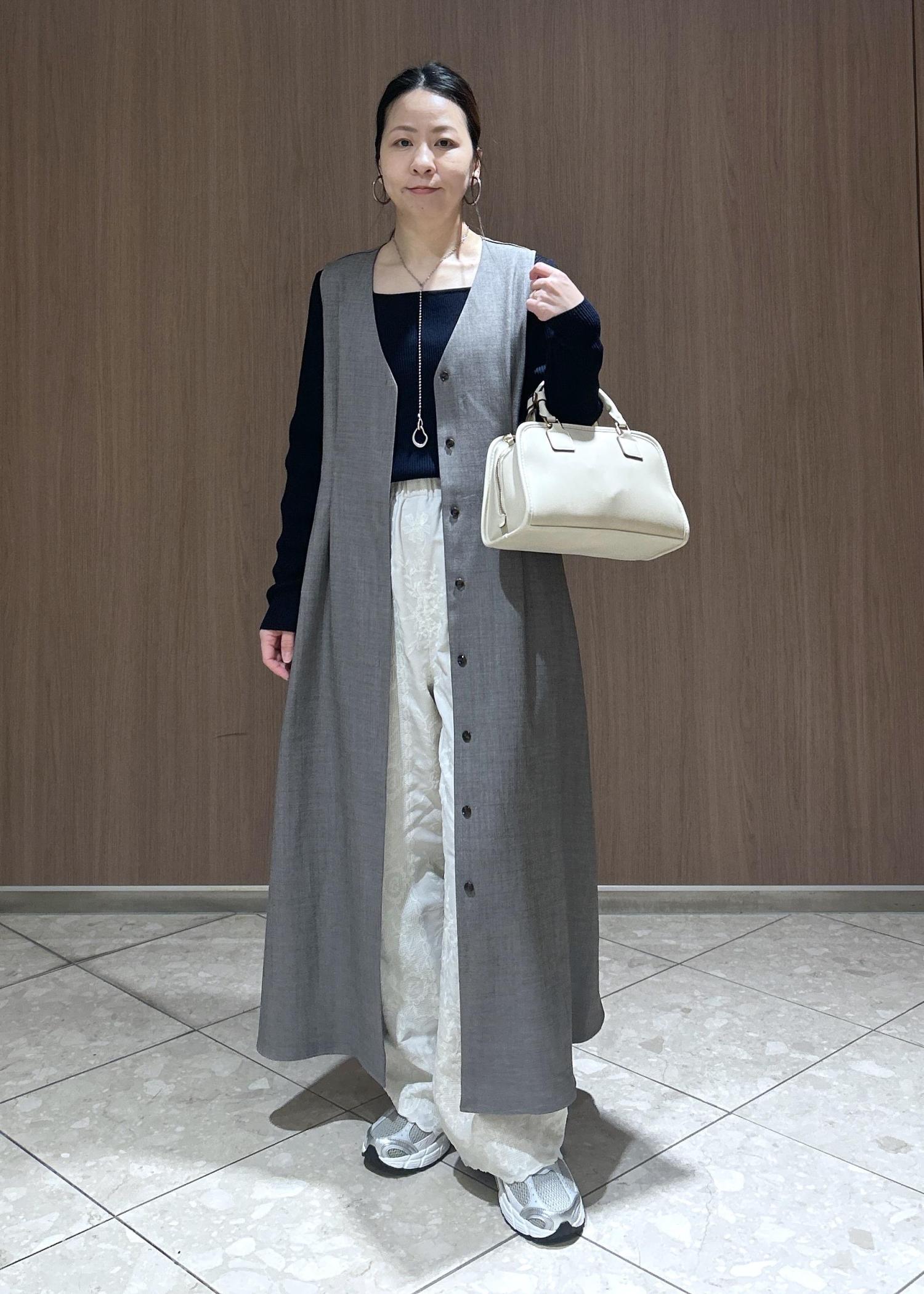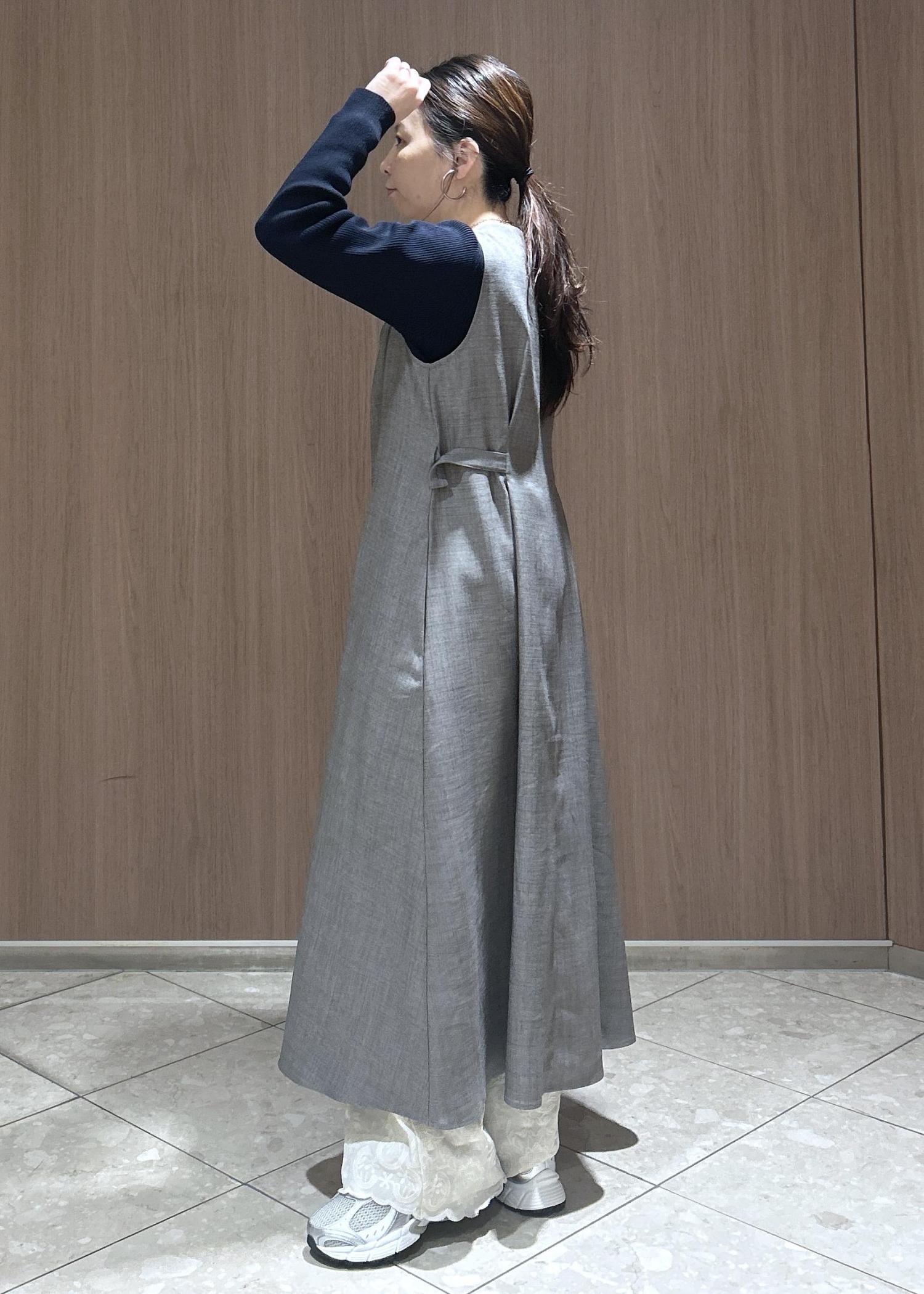 ROPÉ PICNICウエストタックジャンパースカートグレー系 / F¥7,997レビュー着丈はくるぶしかかるくらいです。長めのタイプを選んでよりすらっとした印象に見せたかったので。ノースリーブなのでインナーは厚みあるものから薄手のタイプまで着られるので季節によって温度調整しやすいです。ボタンの開け閉めでコーディネートの幅が広がるアイテムなので便利です。