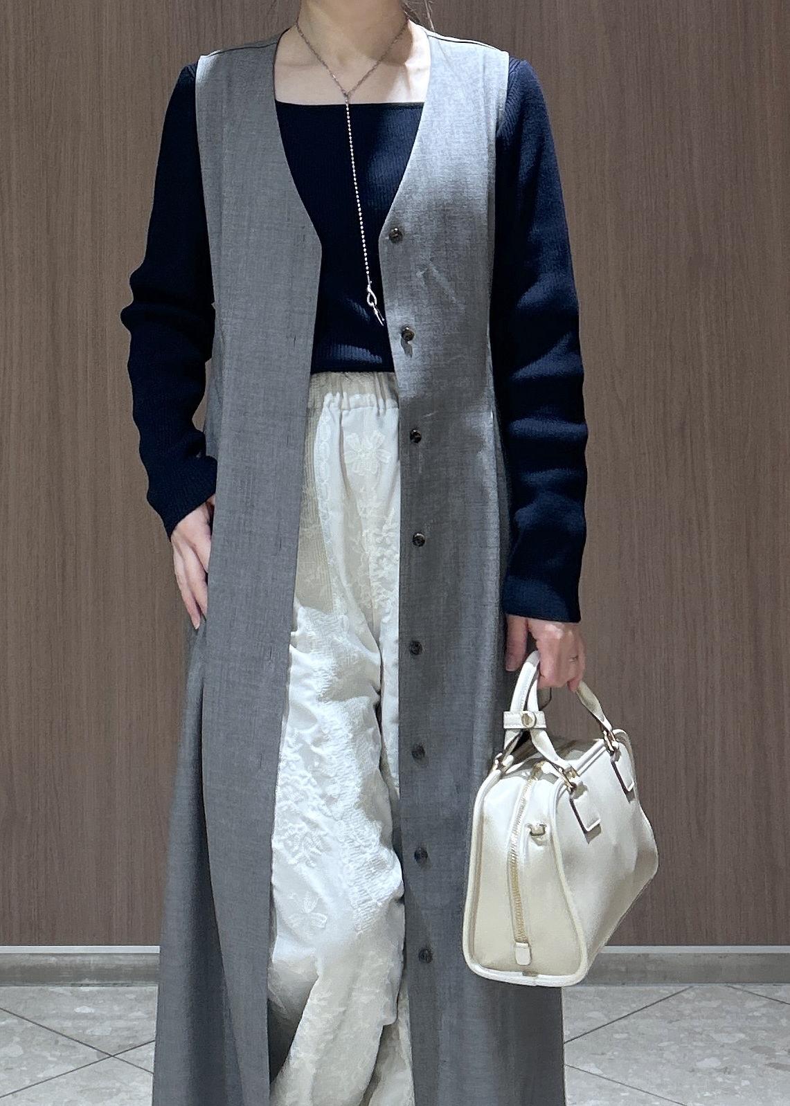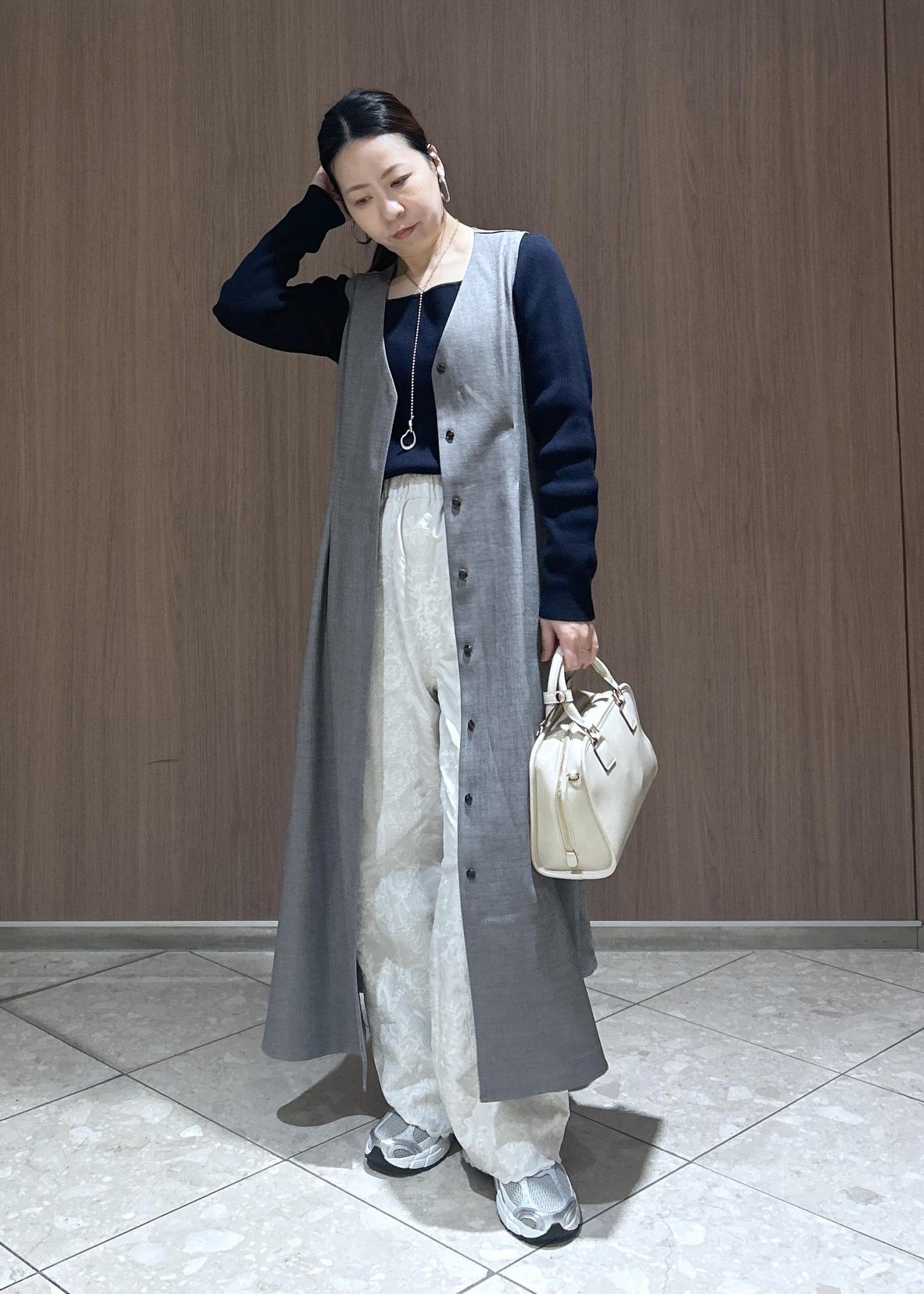 タックワンピースですが、前ボタンなので羽織りで着こなしてみました。レースパンツにネイビーのトップスを合わせることなくシンプルスタイルにジラが入ることでワンランク上のオシャレが出来るかと思います。ぜひお試しください。
