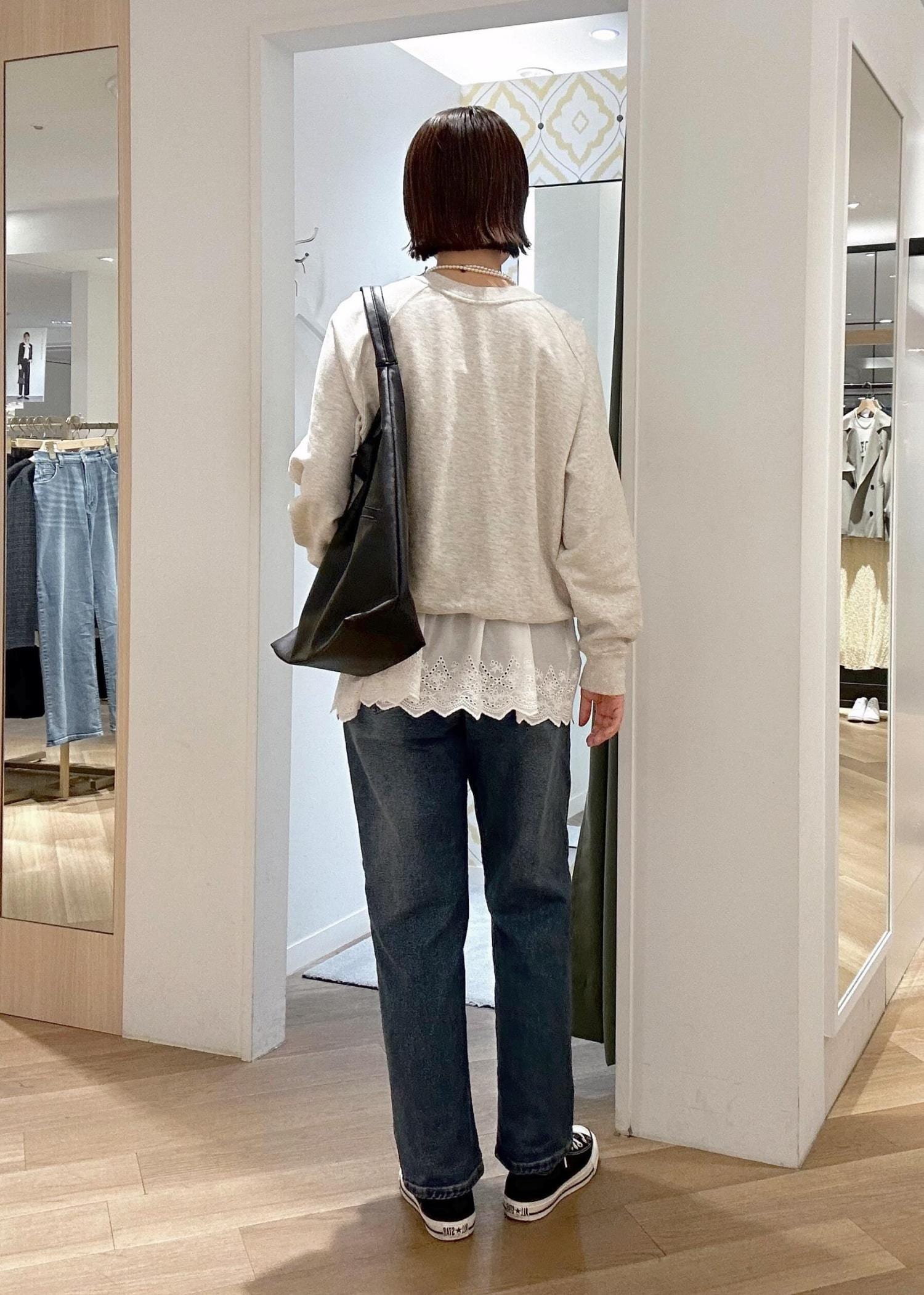 トレーナー×デニムのシンプルなスタイリングも、レースキャミをレイヤードすれば垢抜けた印象に♪ デニムも伸縮性があって、小さい子供がいてもアクティブに動き回れます!