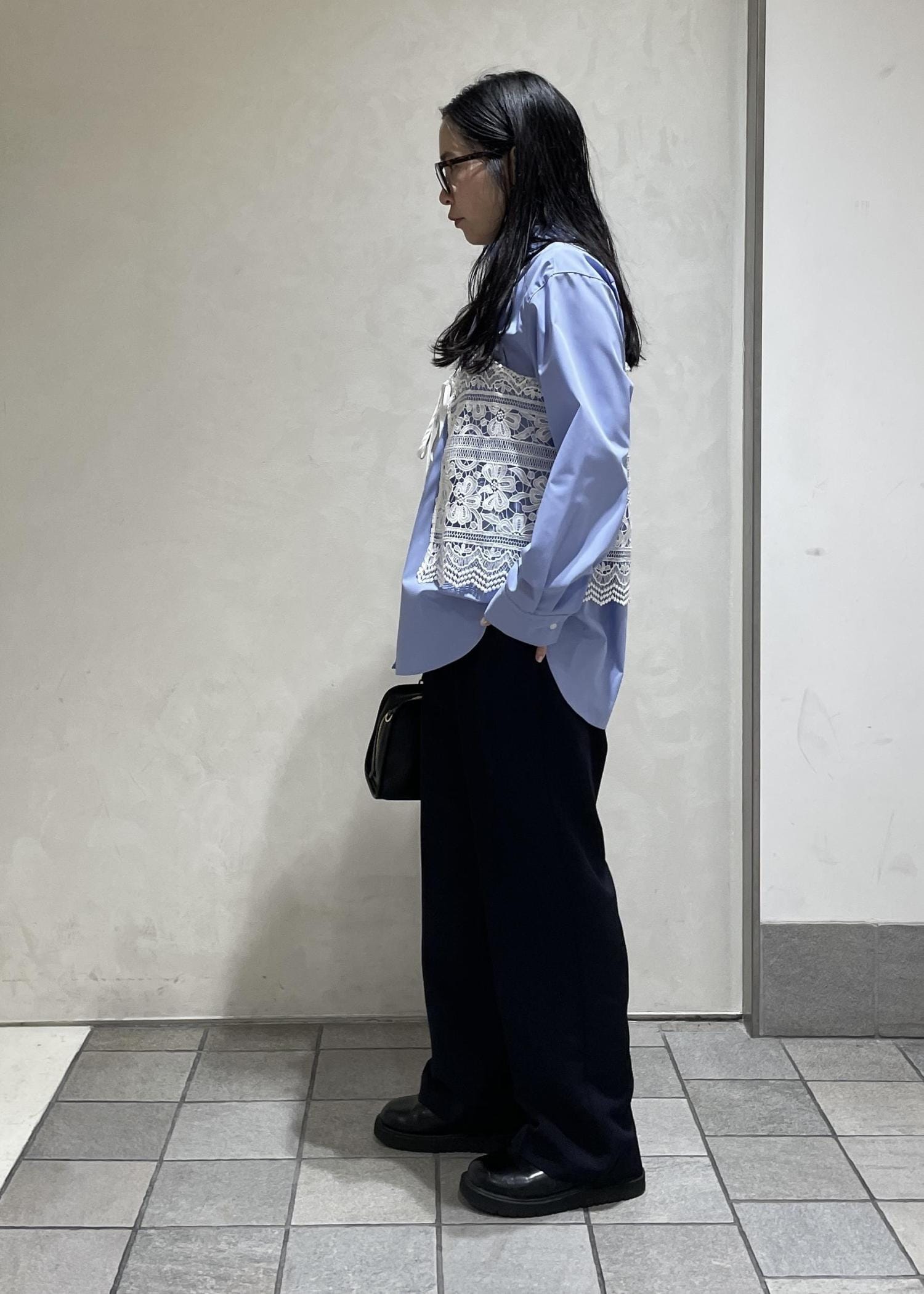 前後で着ていただけるので、シャツやニットとレイヤードしやすいです。 -