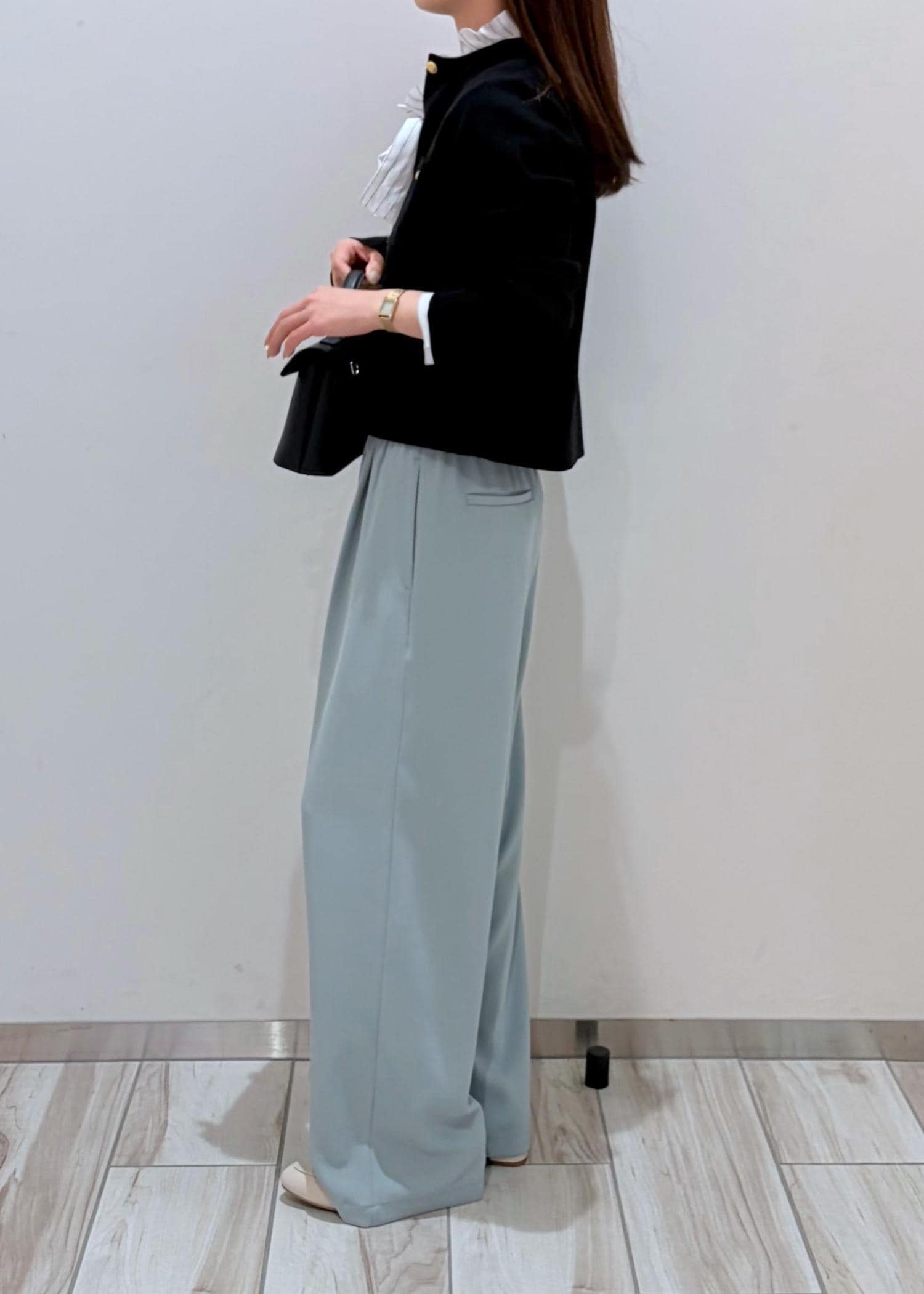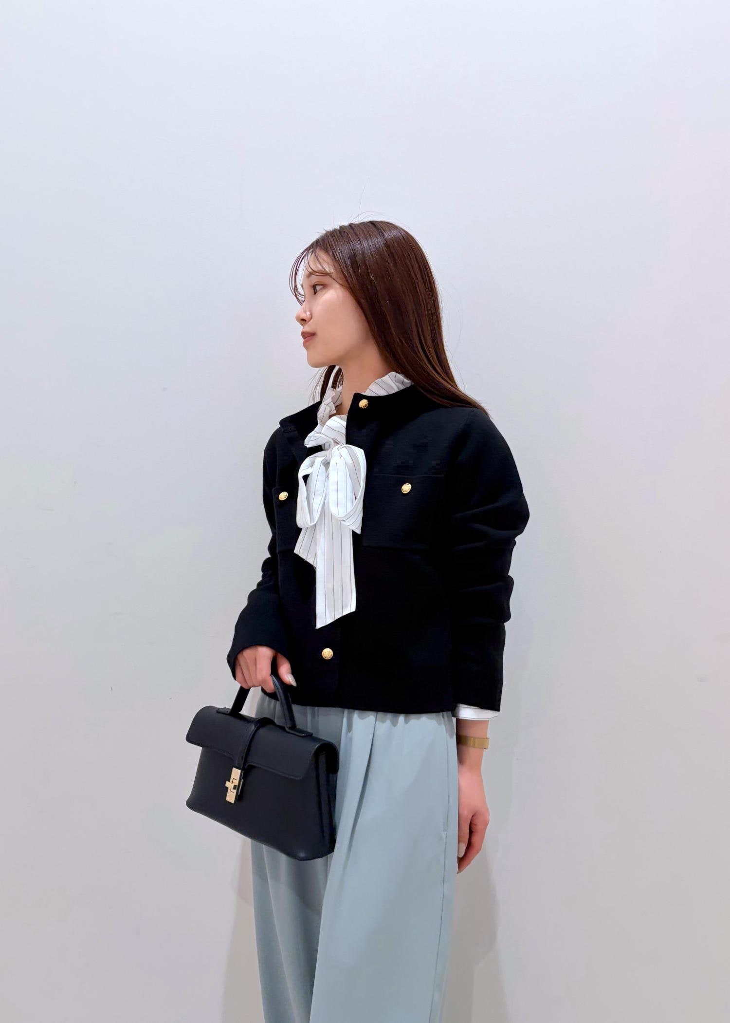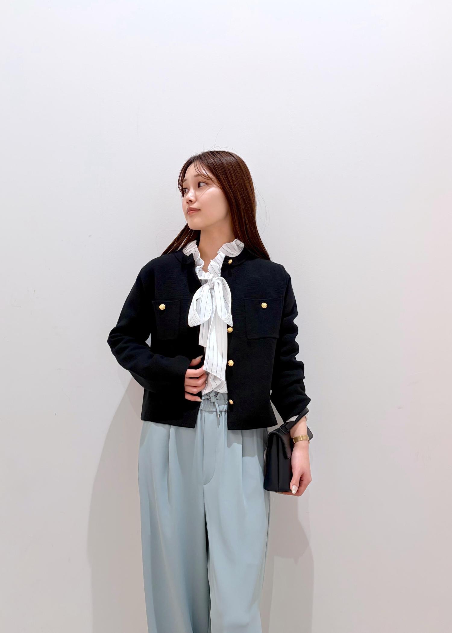 春らしい鮮やかなミント系のパンツと綺麗めなパキッとしたブラックカーデ+フリルブラウスで、上品な雰囲気の中に可愛らしさと鮮やかさをだしてみました。