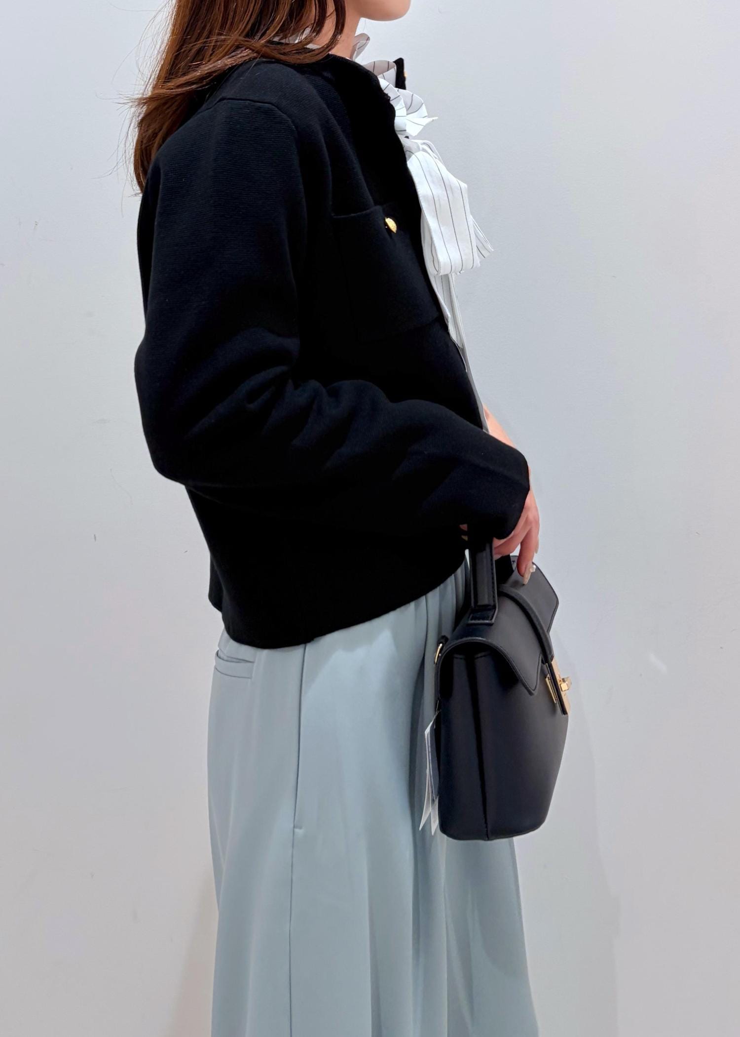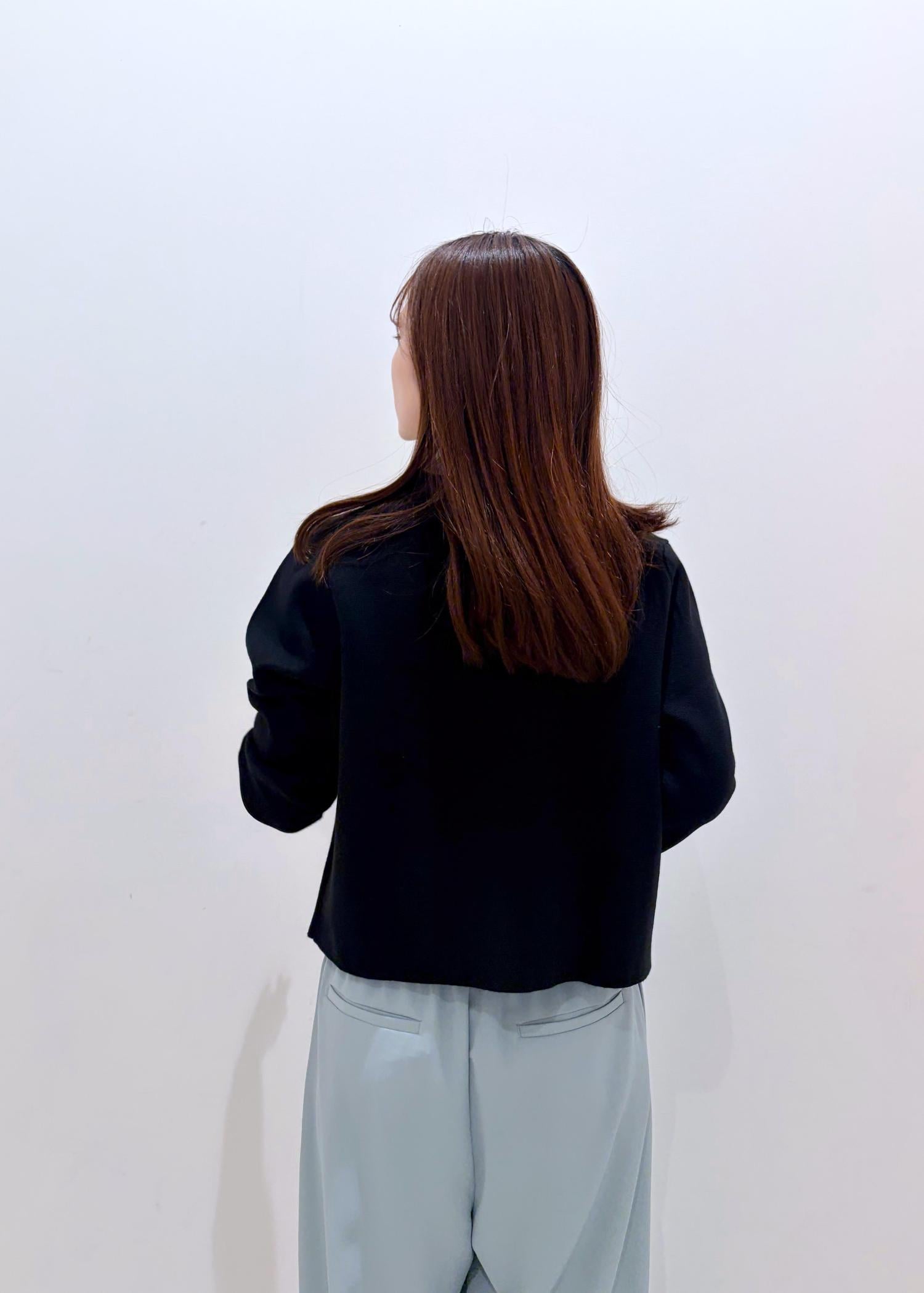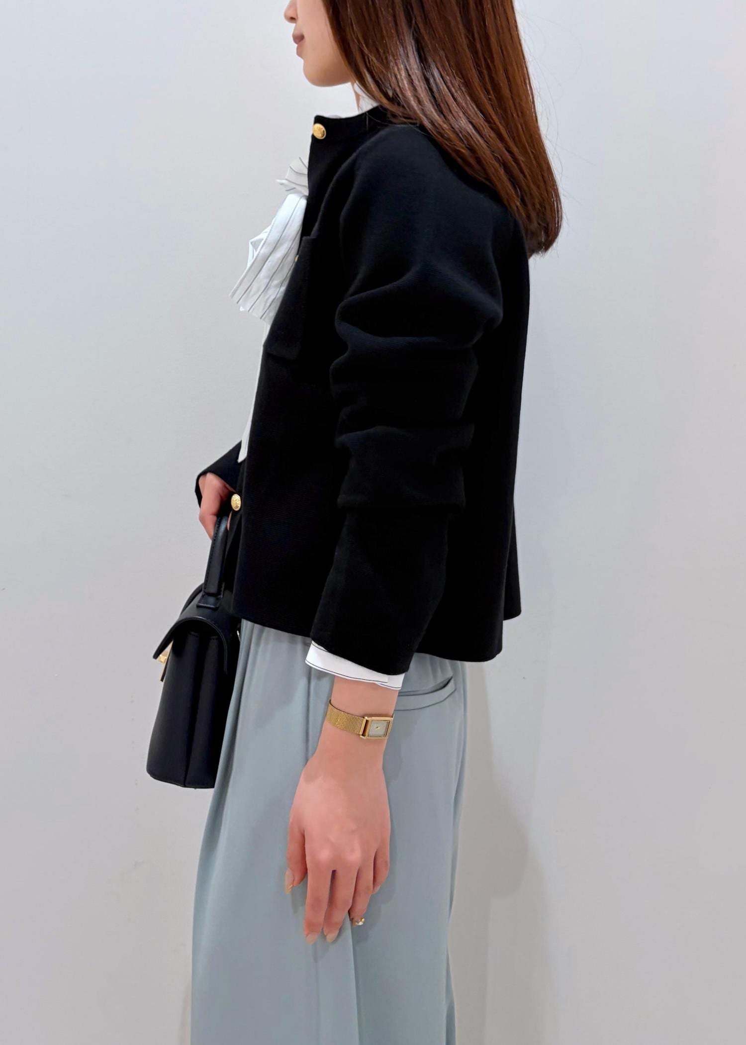 春らしい鮮やかなミント系のパンツと綺麗めなパキッとしたブラックカーデ+フリルブラウスで、上品な雰囲気の中に可愛らしさと鮮やかさをだしてみました。