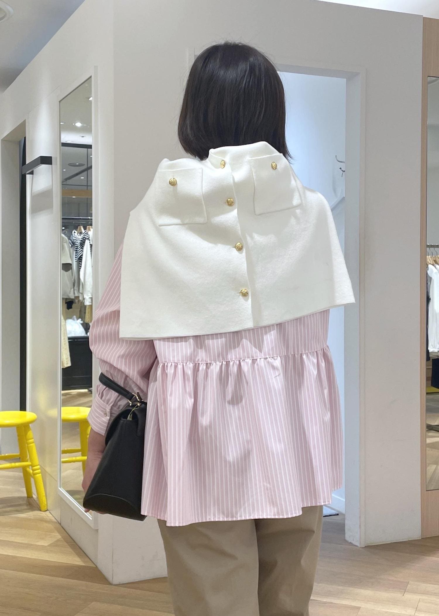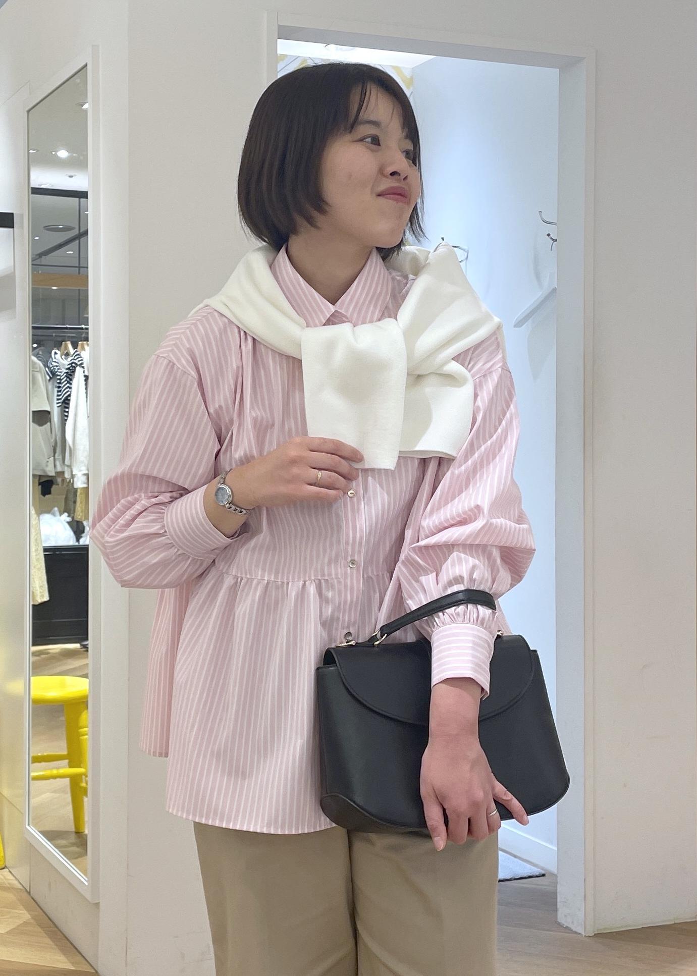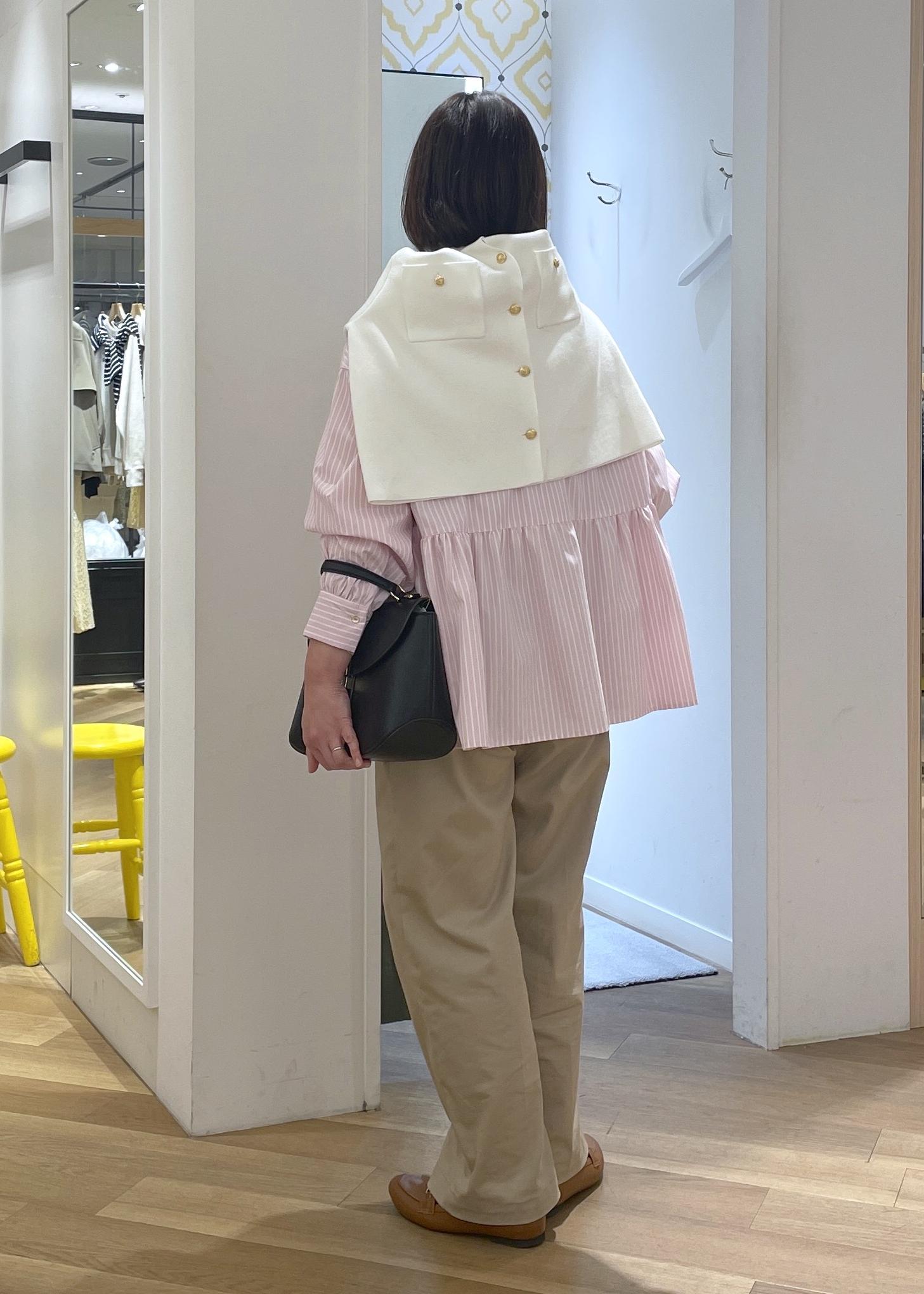 そのままでも可愛いのですが、ふんわりとしたシルエットのシャツなので、白のカーディガンを肩掛けしてコーデのポイント使いかつメリハリを付けてみました◎