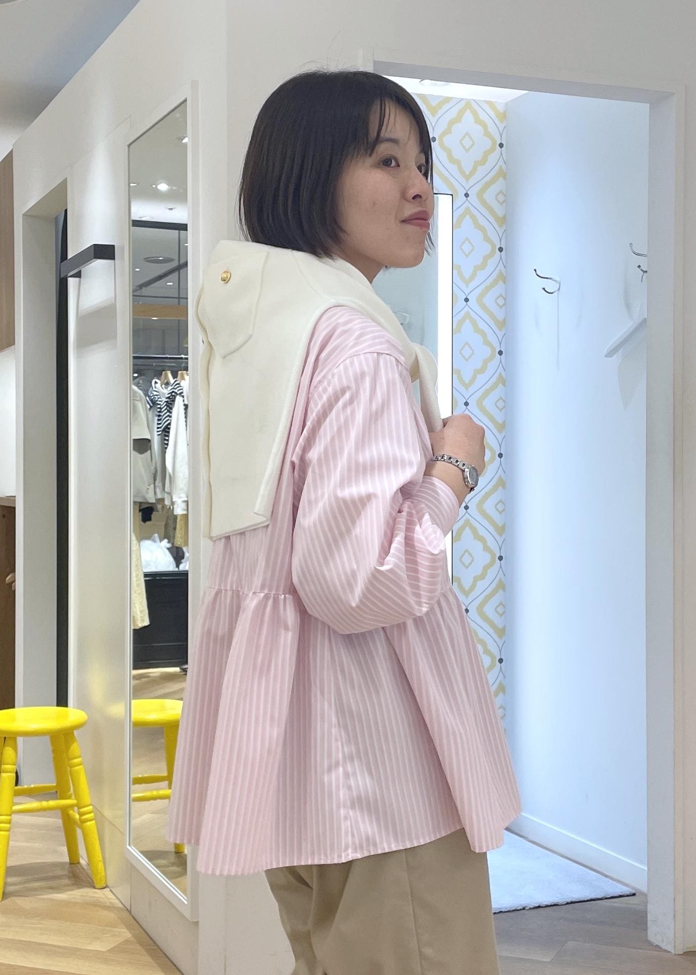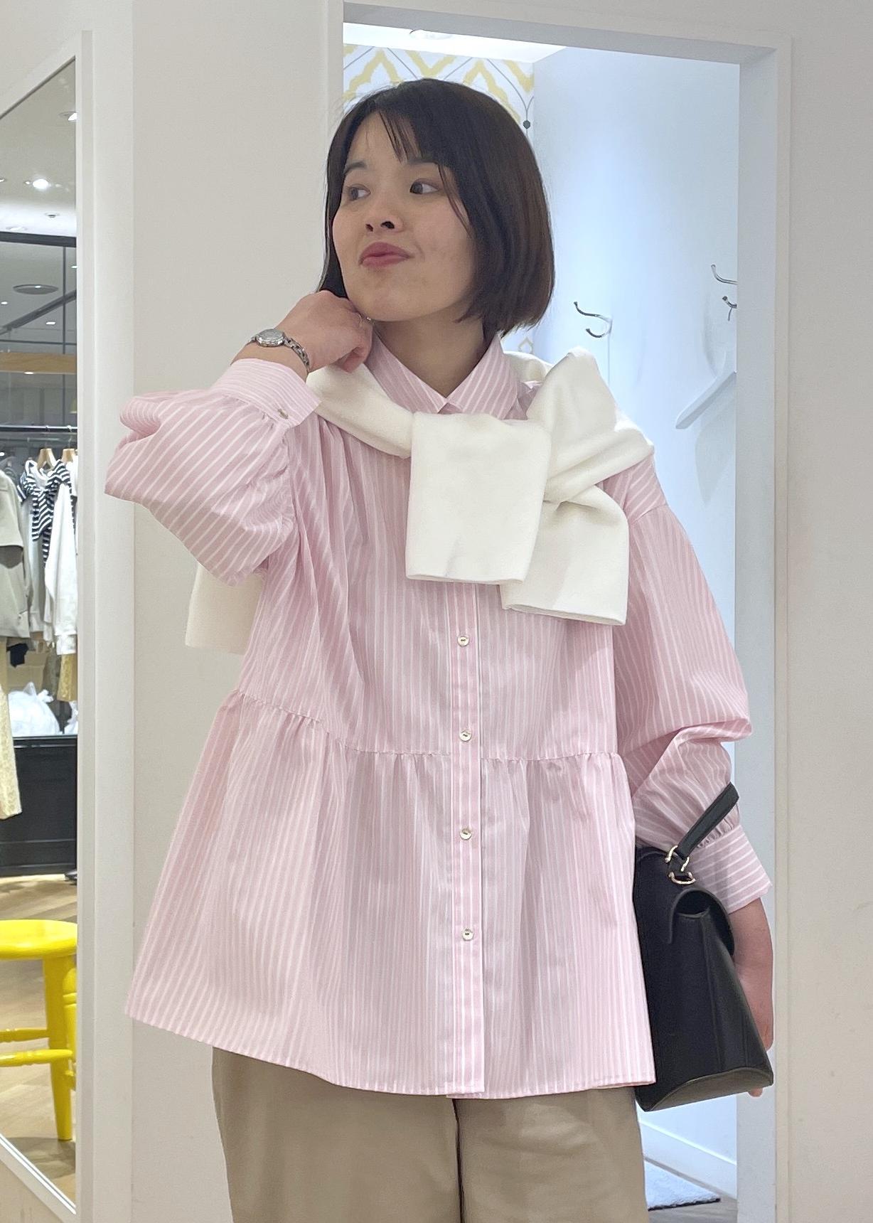 ごわつかないくらいの程良いハリ感のあるシャツできれいなシルエットでお召し頂けます。ゆったりとしたサイズ感で、身頃はラインを拾わず体型カバーしてくれます。裾がペプラムになっているのでふんわりとしたシルエットで、ヒップや腰回りも可愛くカバーしてくれます。着丈はヒップが隠れるくらいの長さです。