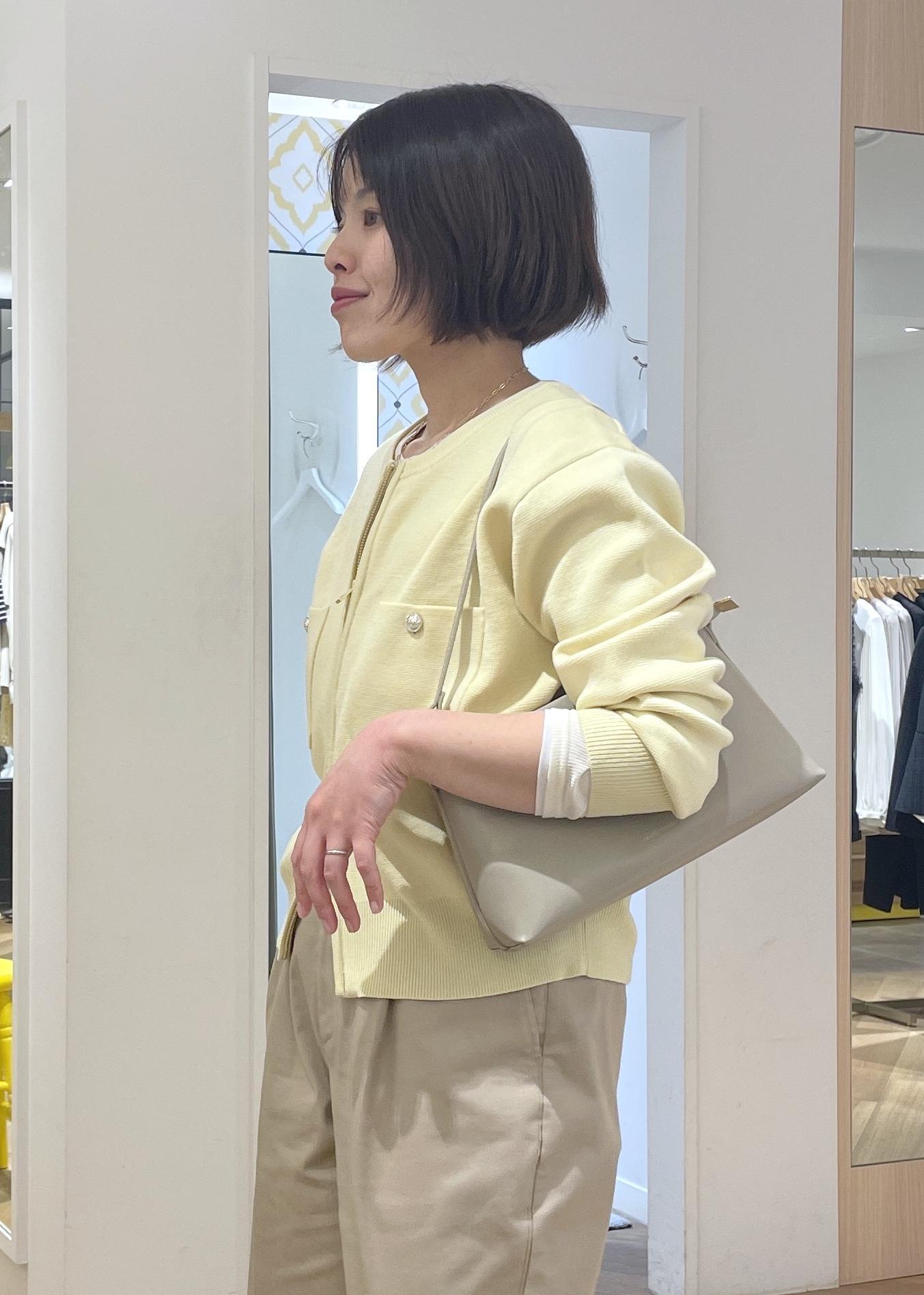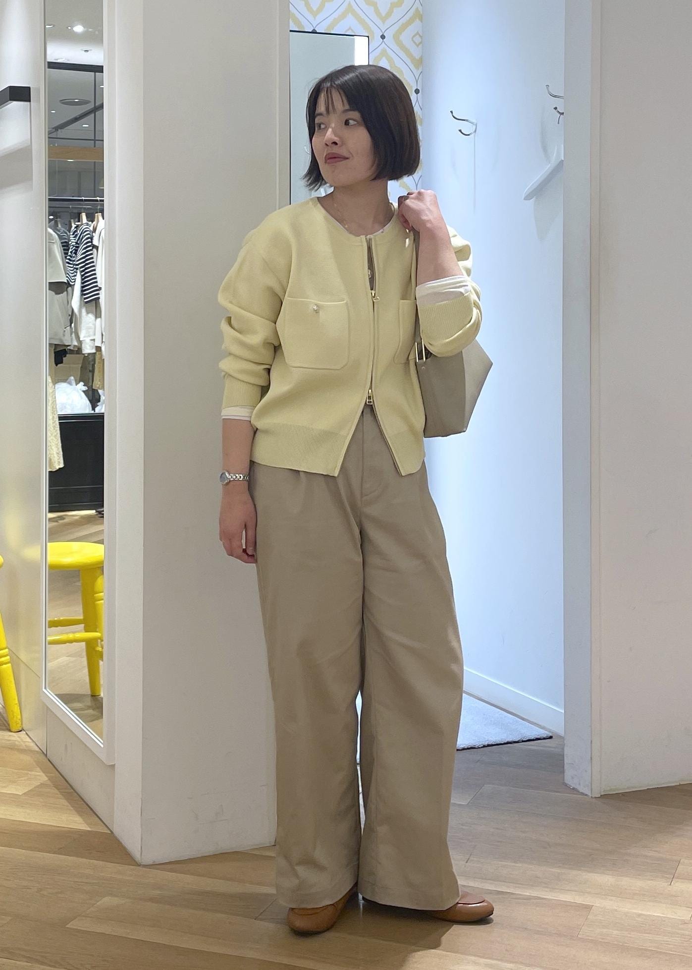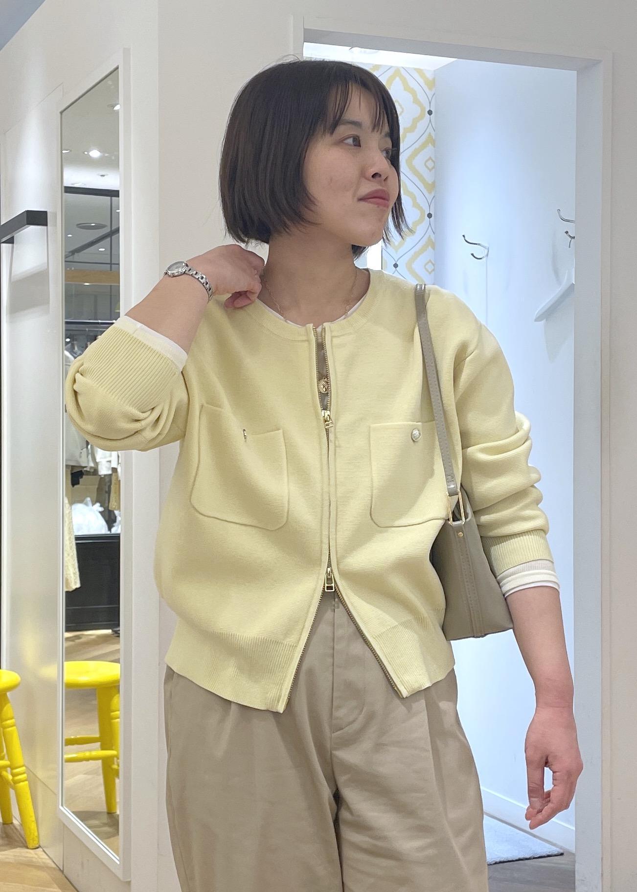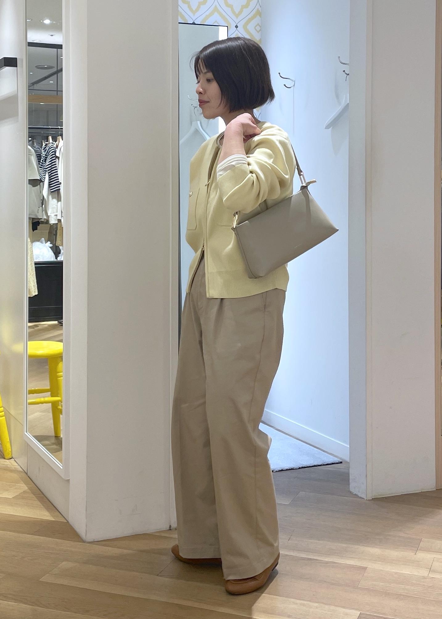 柔らかなイエローのカーディガンにチノのワイドパンツを合わせた、春の大人カジュアルコーデです!