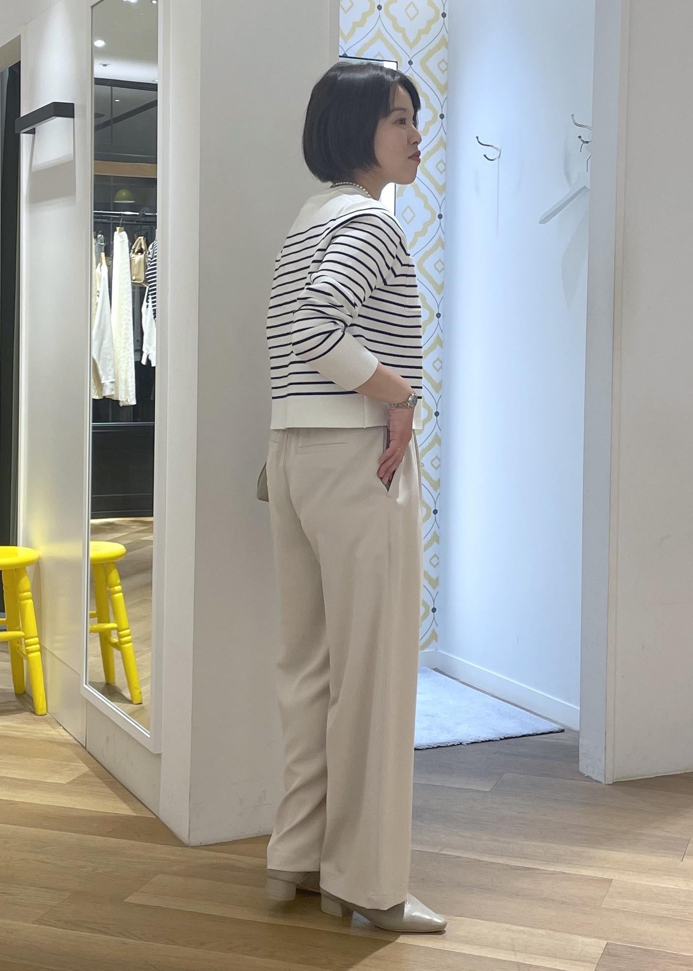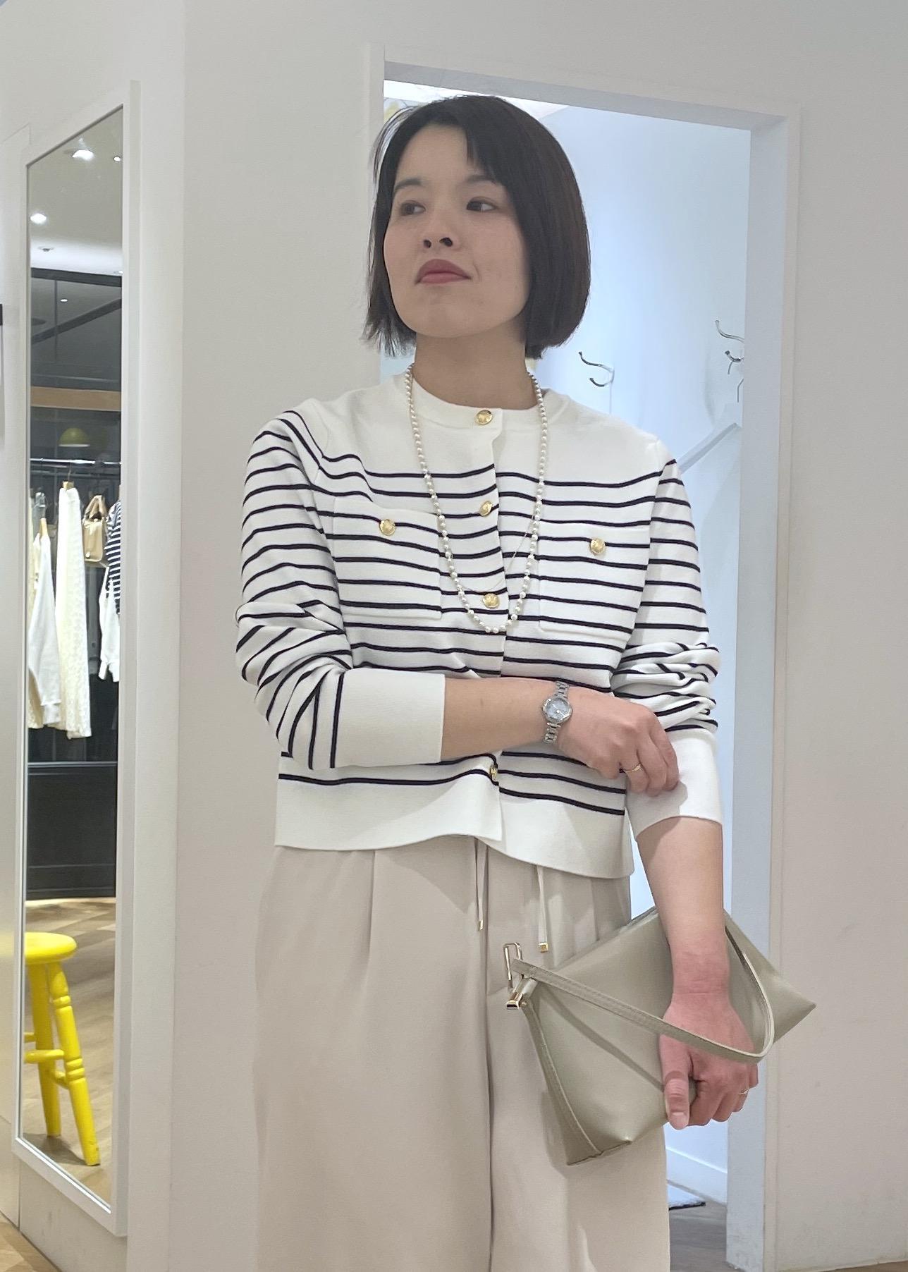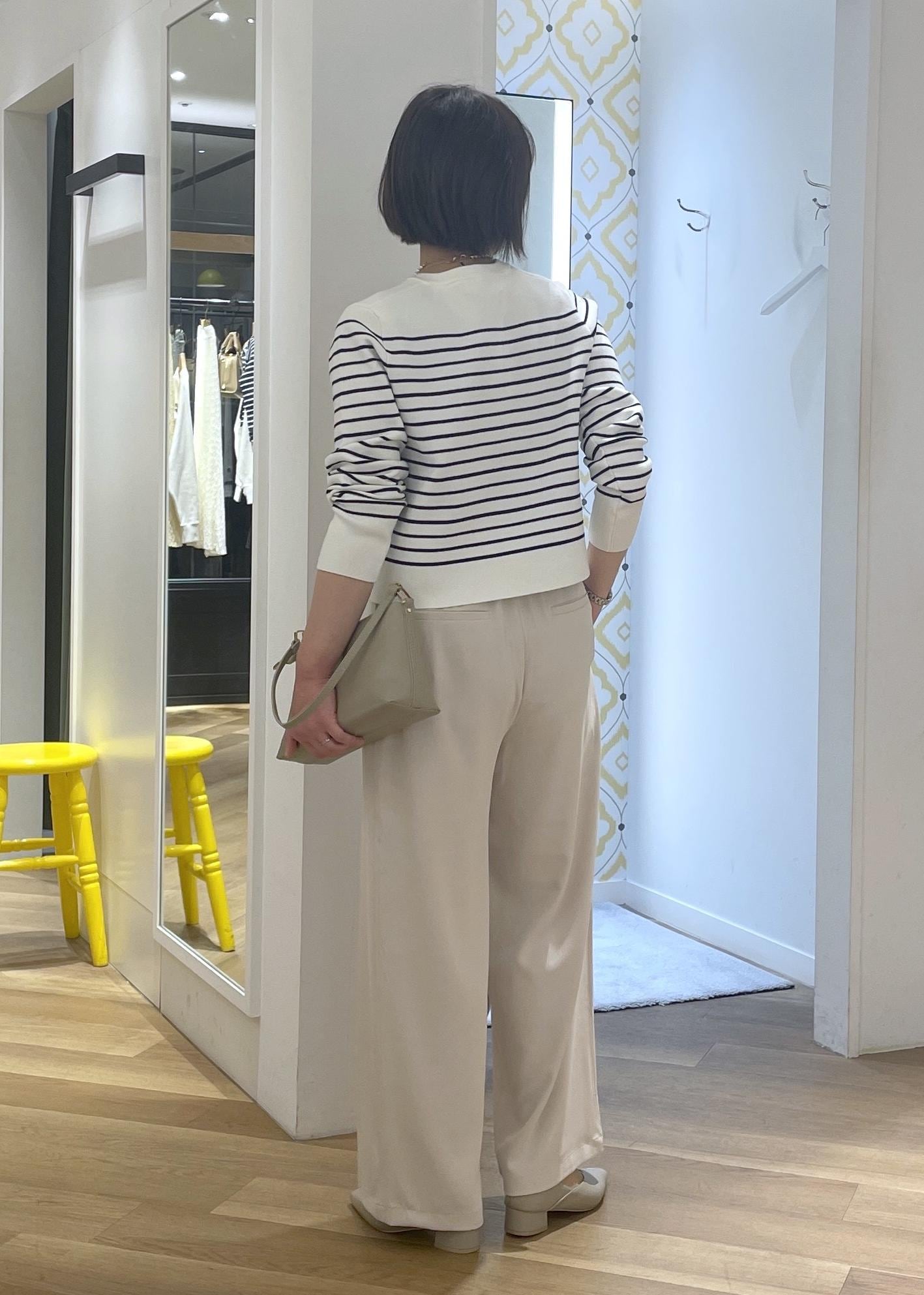 フレンチシックなボーダーのカーディガンに淡いベージュのワイドパンツを合わせて、柔らかなカラーの大人カジュアルコーデに◎