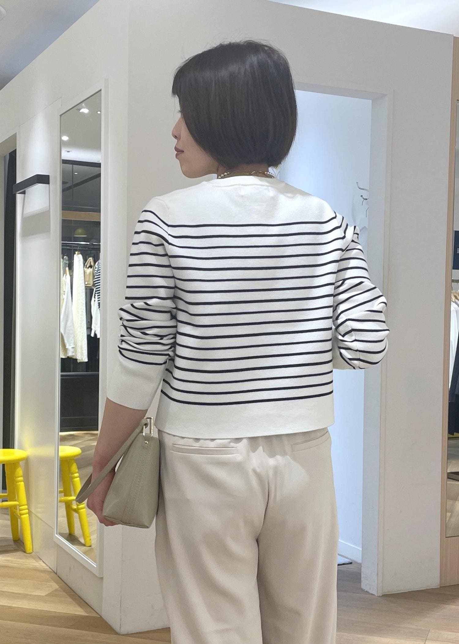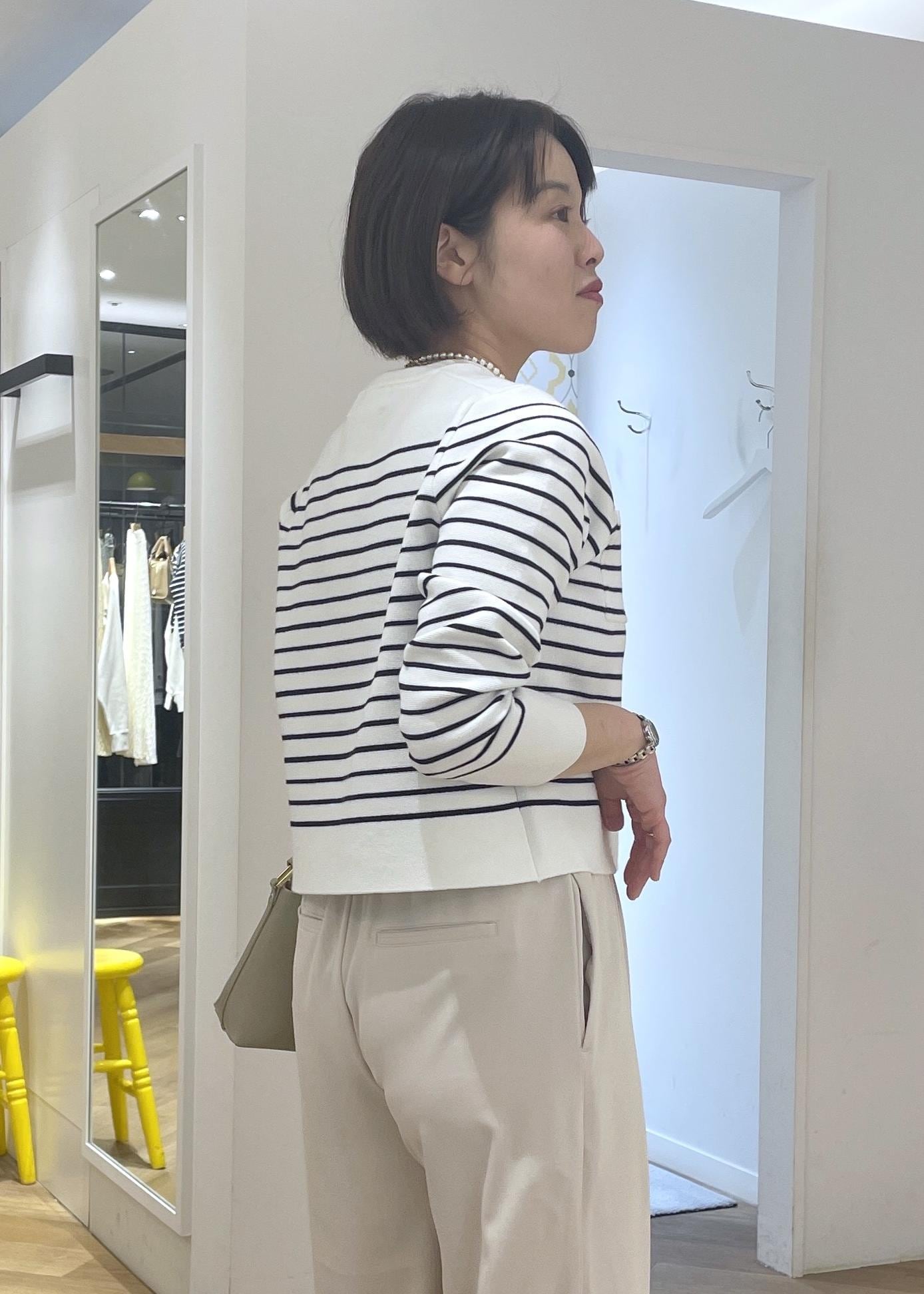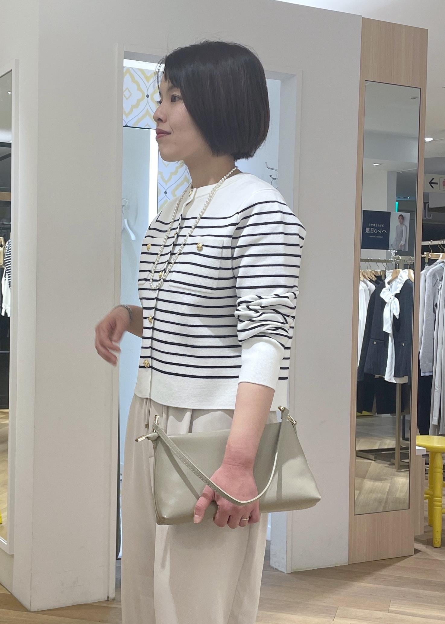 フレンチシックなボーダーのカーディガンに淡いベージュのワイドパンツを合わせて、柔らかなカラーの大人カジュアルコーデに◎