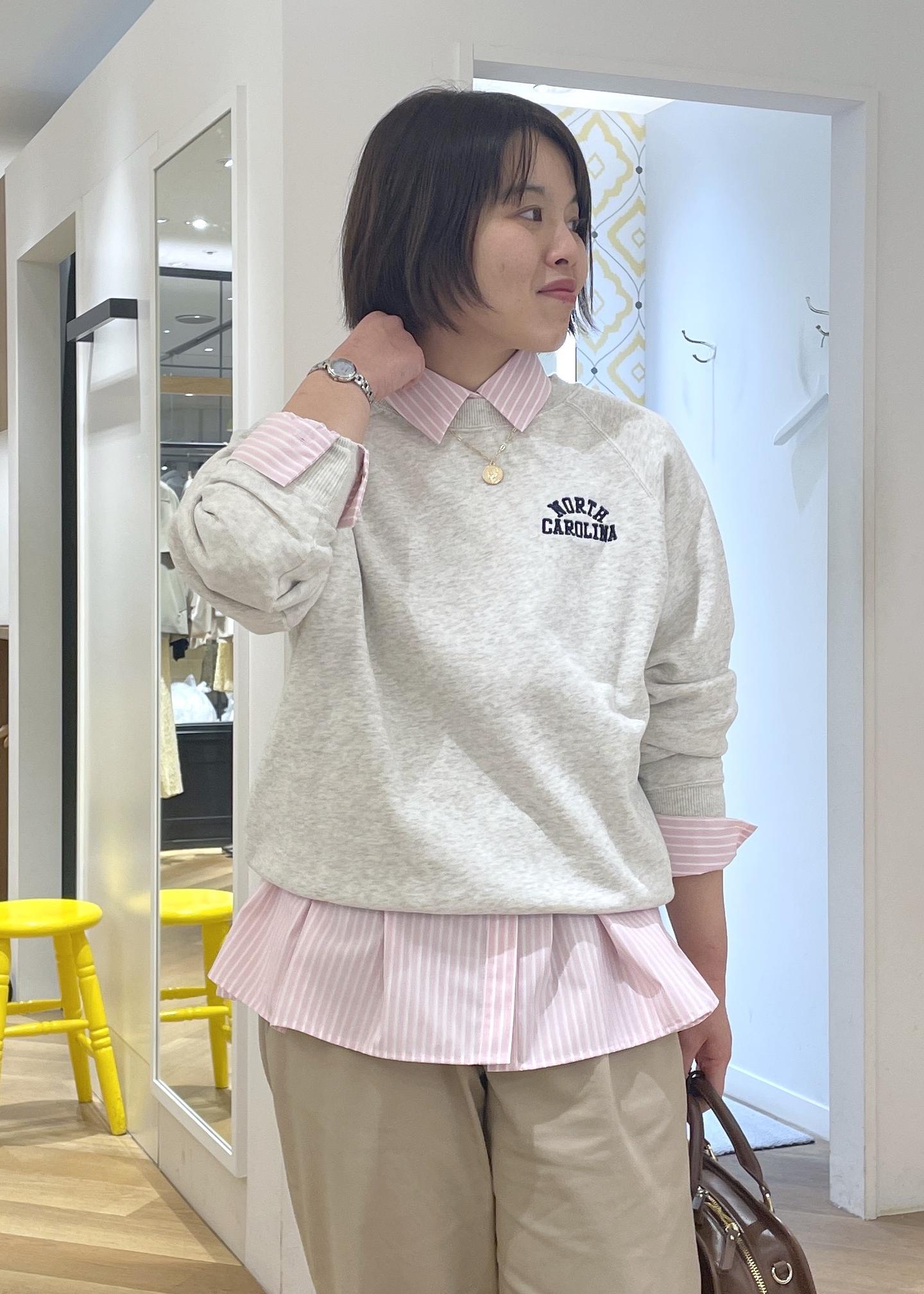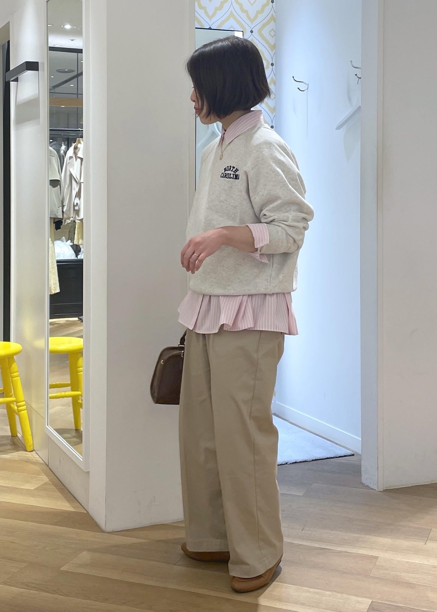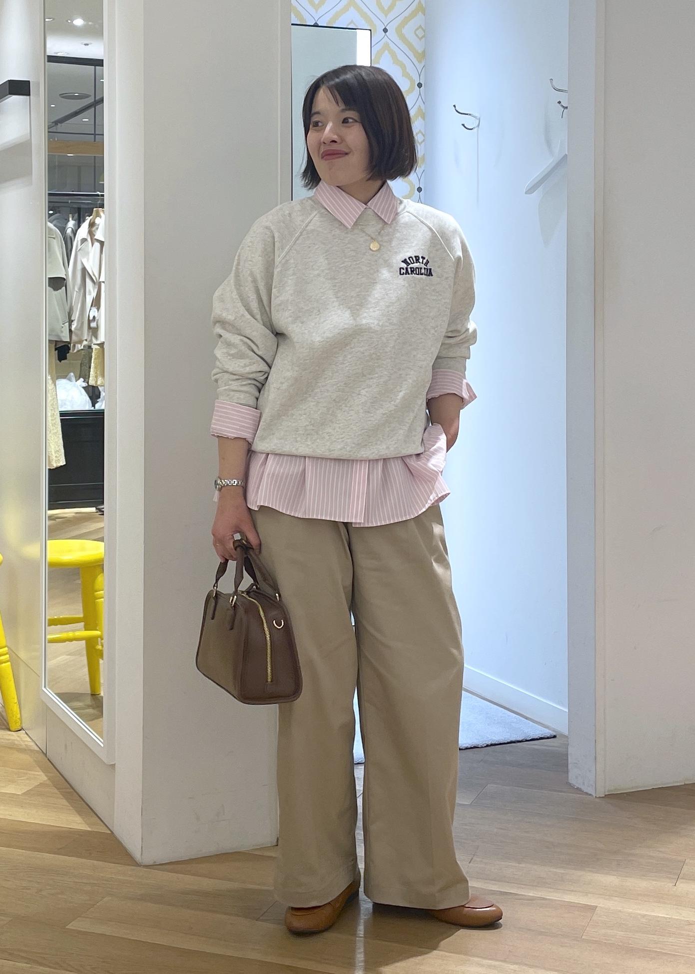 スウェットとチノワイドパンツのカジュアルなアイテム合わせなので、ピンクのシャツを重ねることでほんの少し可愛らしさをプラスしました◎