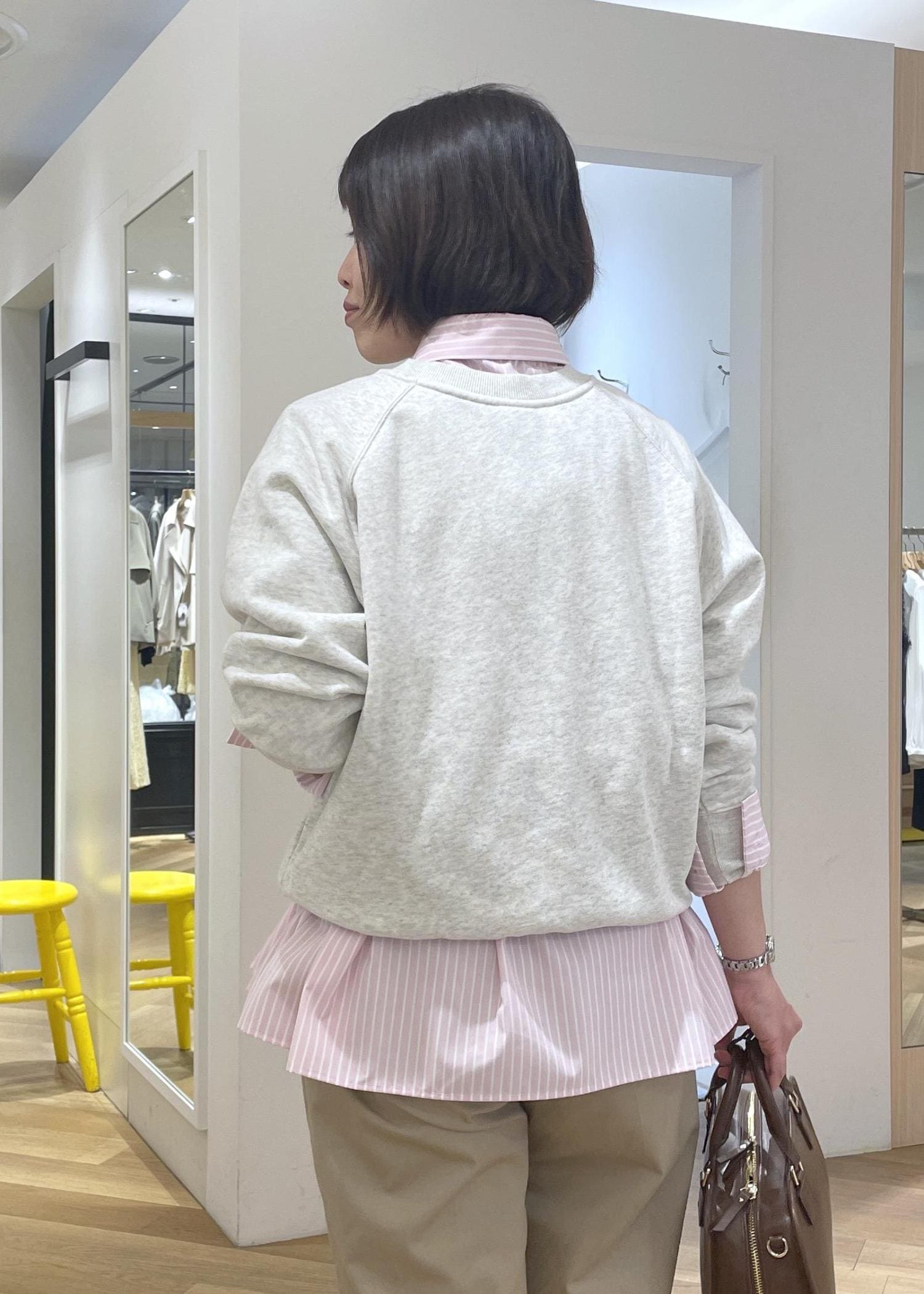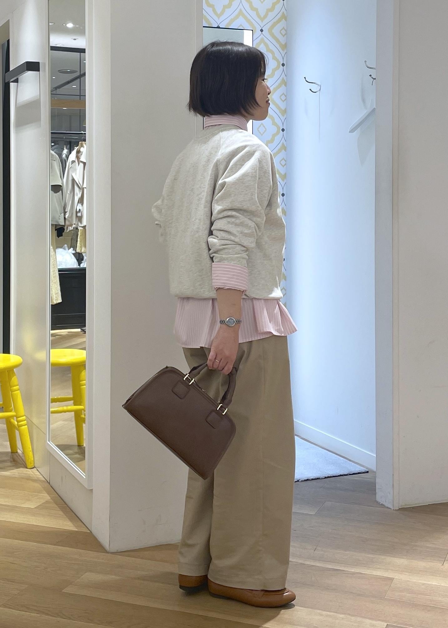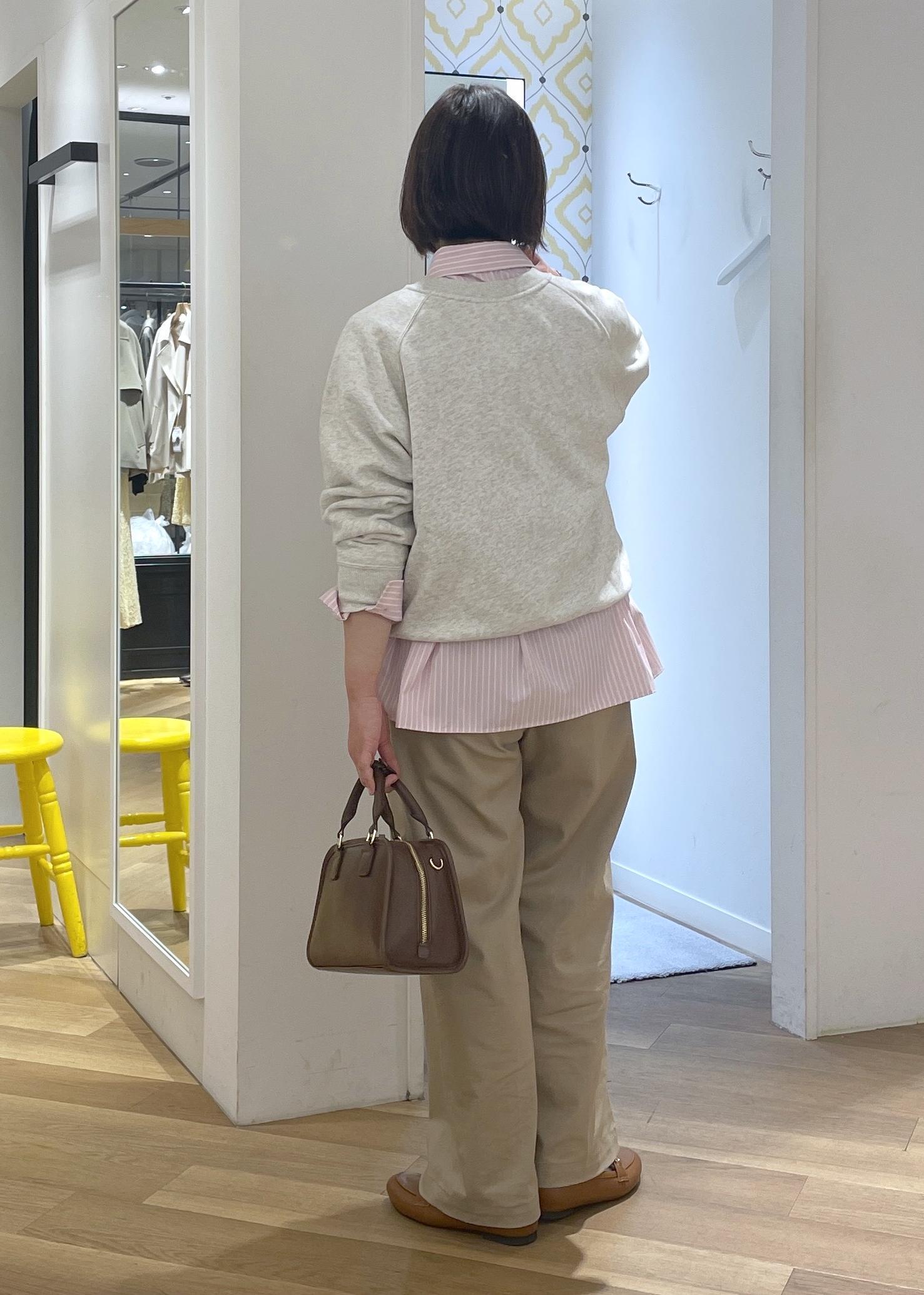 スウェットとチノワイドパンツのカジュアルなアイテム合わせなので、ピンクのシャツを重ねることでほんの少し可愛らしさをプラスしました◎