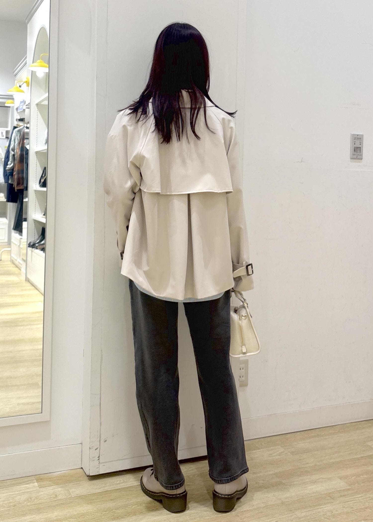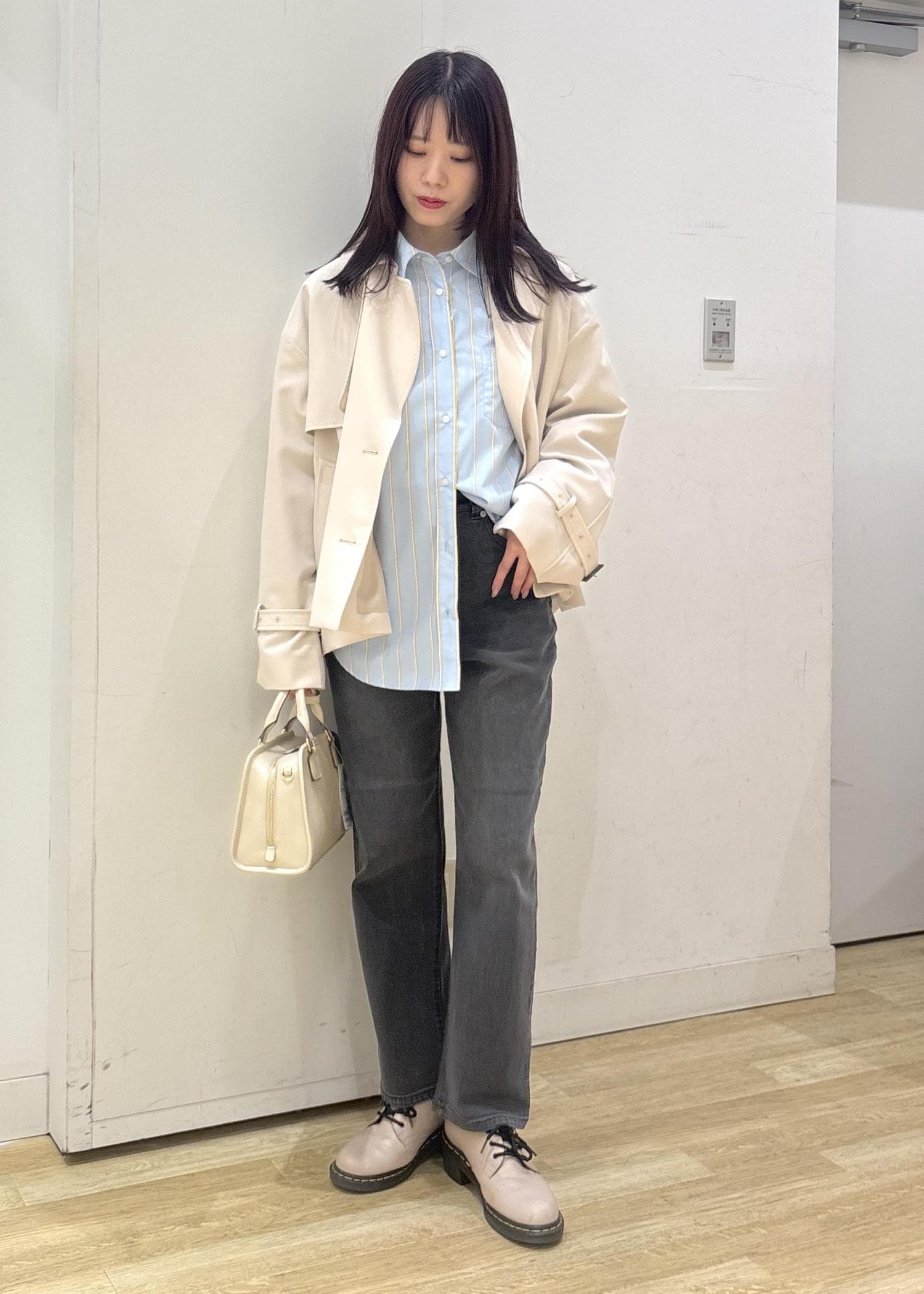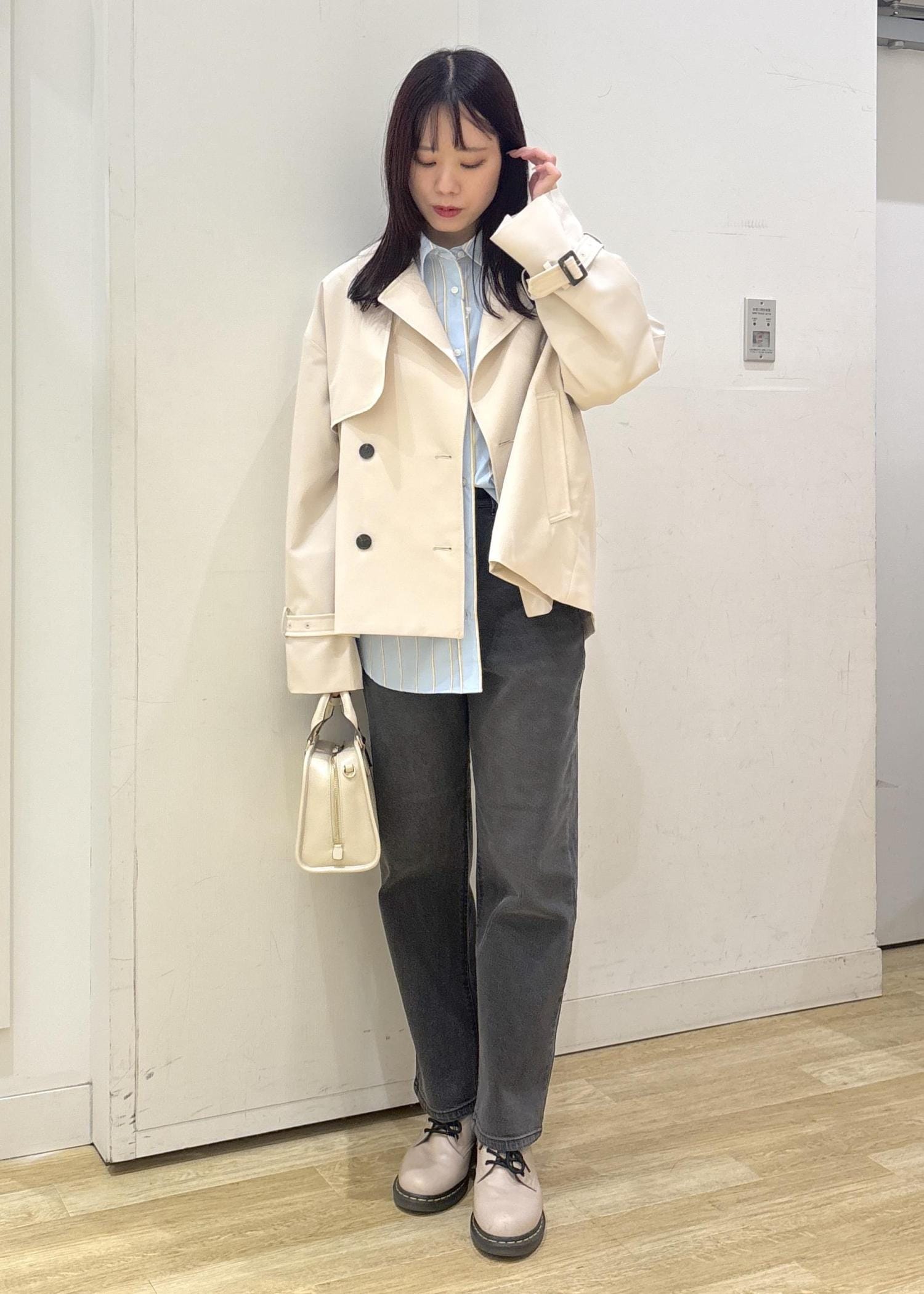 ブルーのシャツとデニムで春らしく、ショートトレンチを合わせて春のお出かけコーデに仕上げました◎