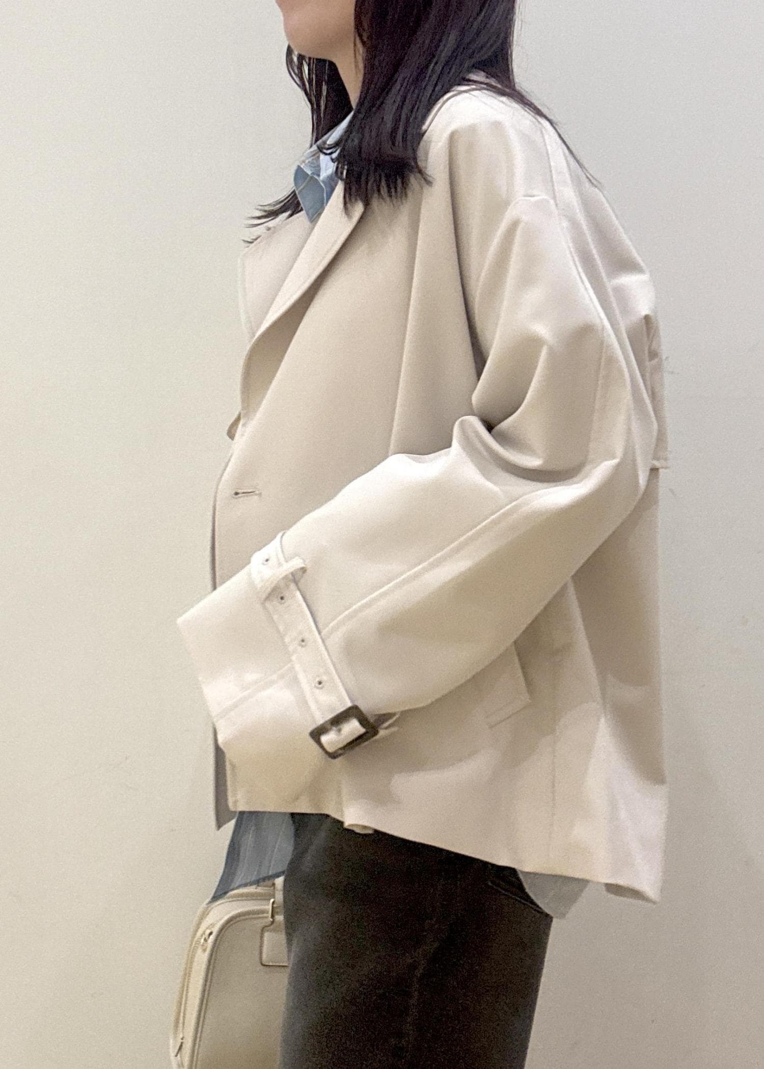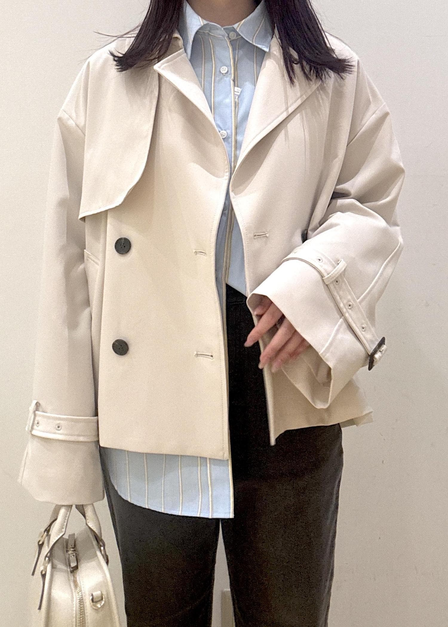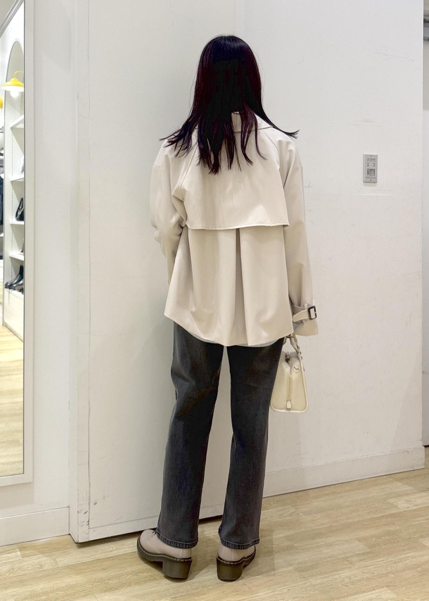 ブルーのシャツとデニムで春らしく、ショートトレンチを合わせて春のお出かけコーデに仕上げました◎