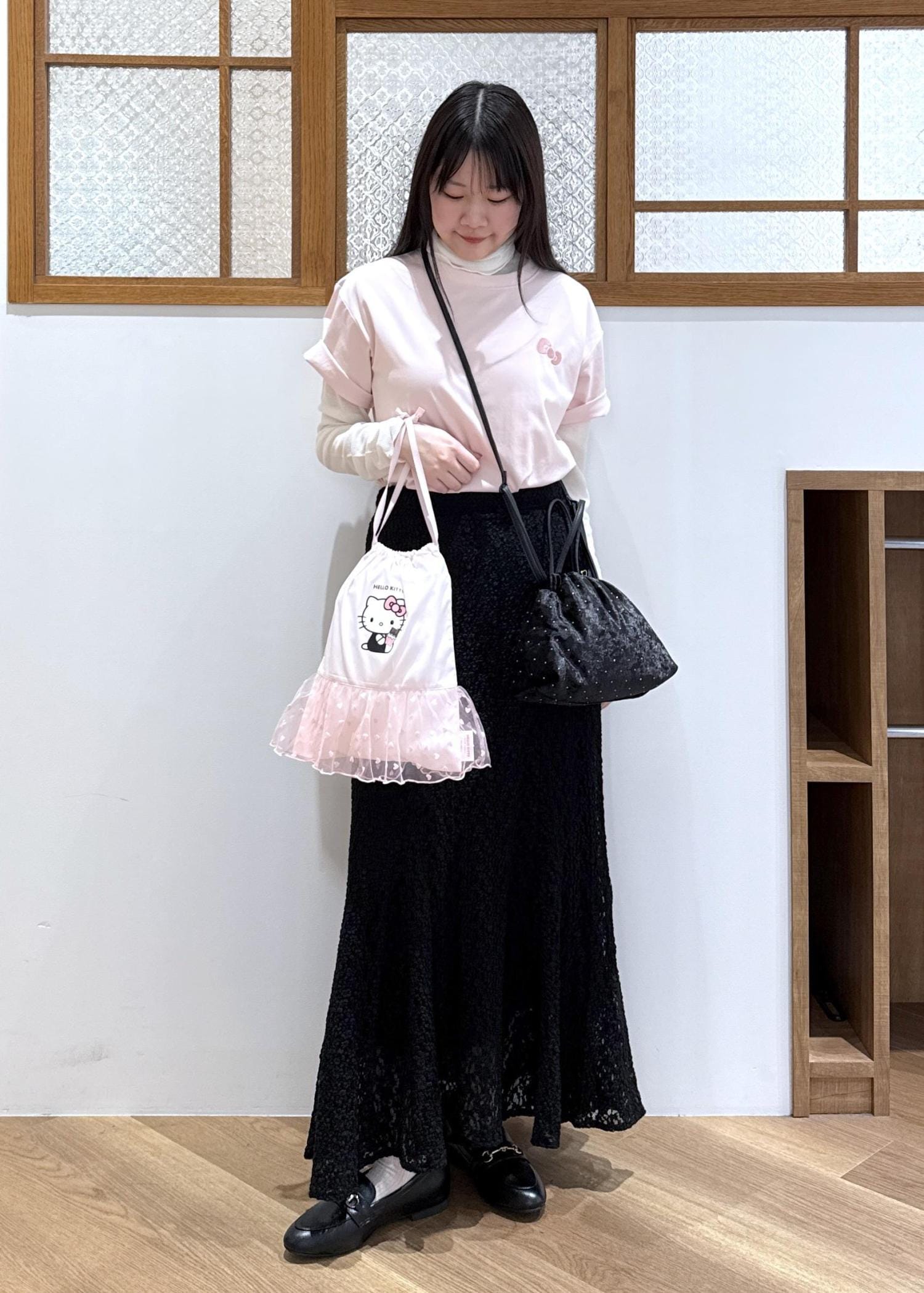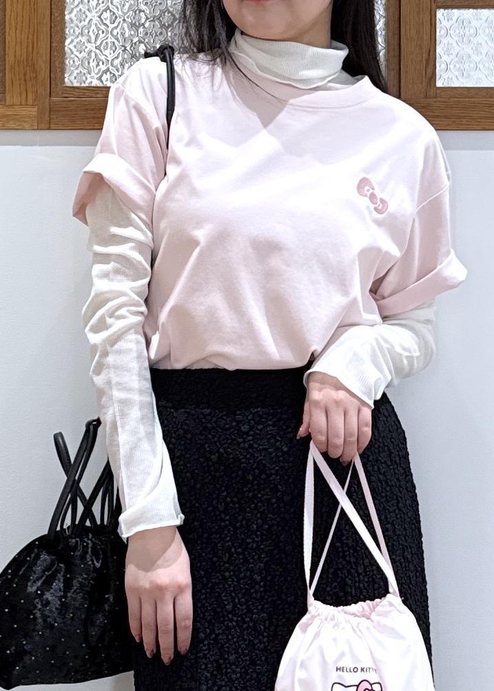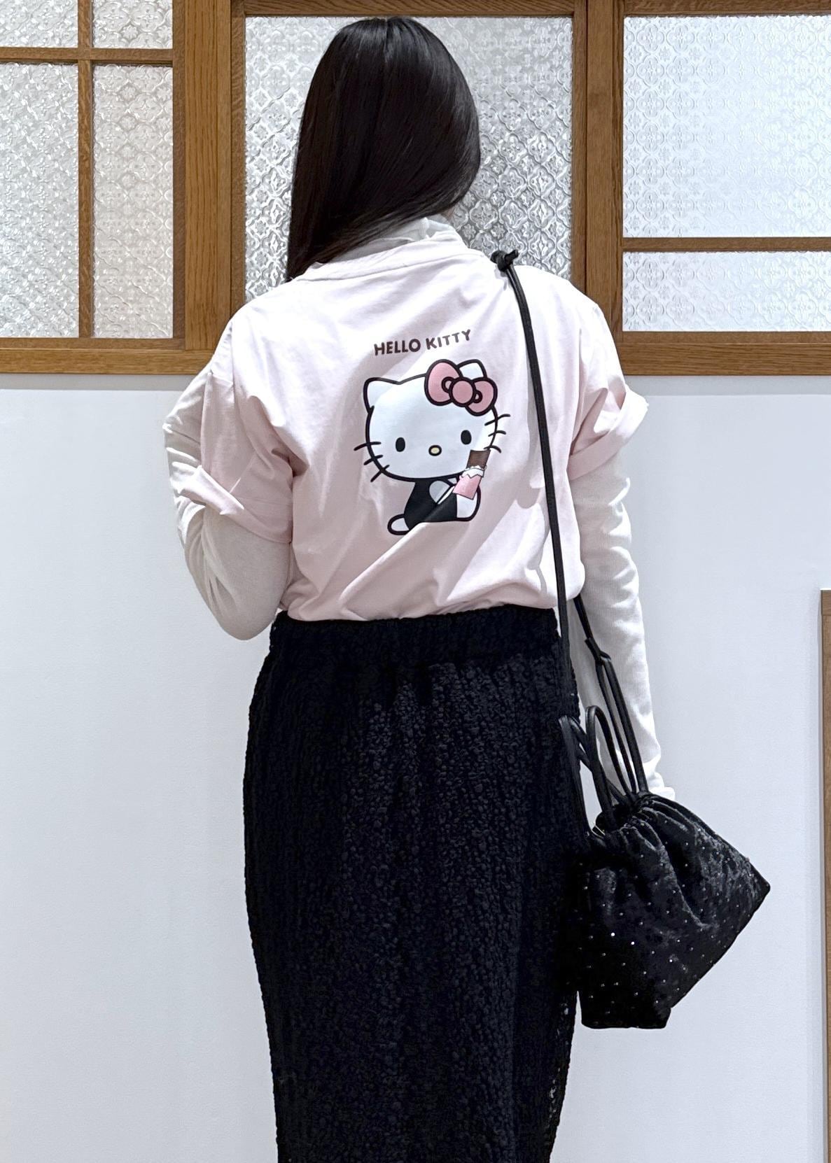 ハローキティコラボのTシャツにシアーインナーをレイヤードした、今から着られるTシャツコーデです。