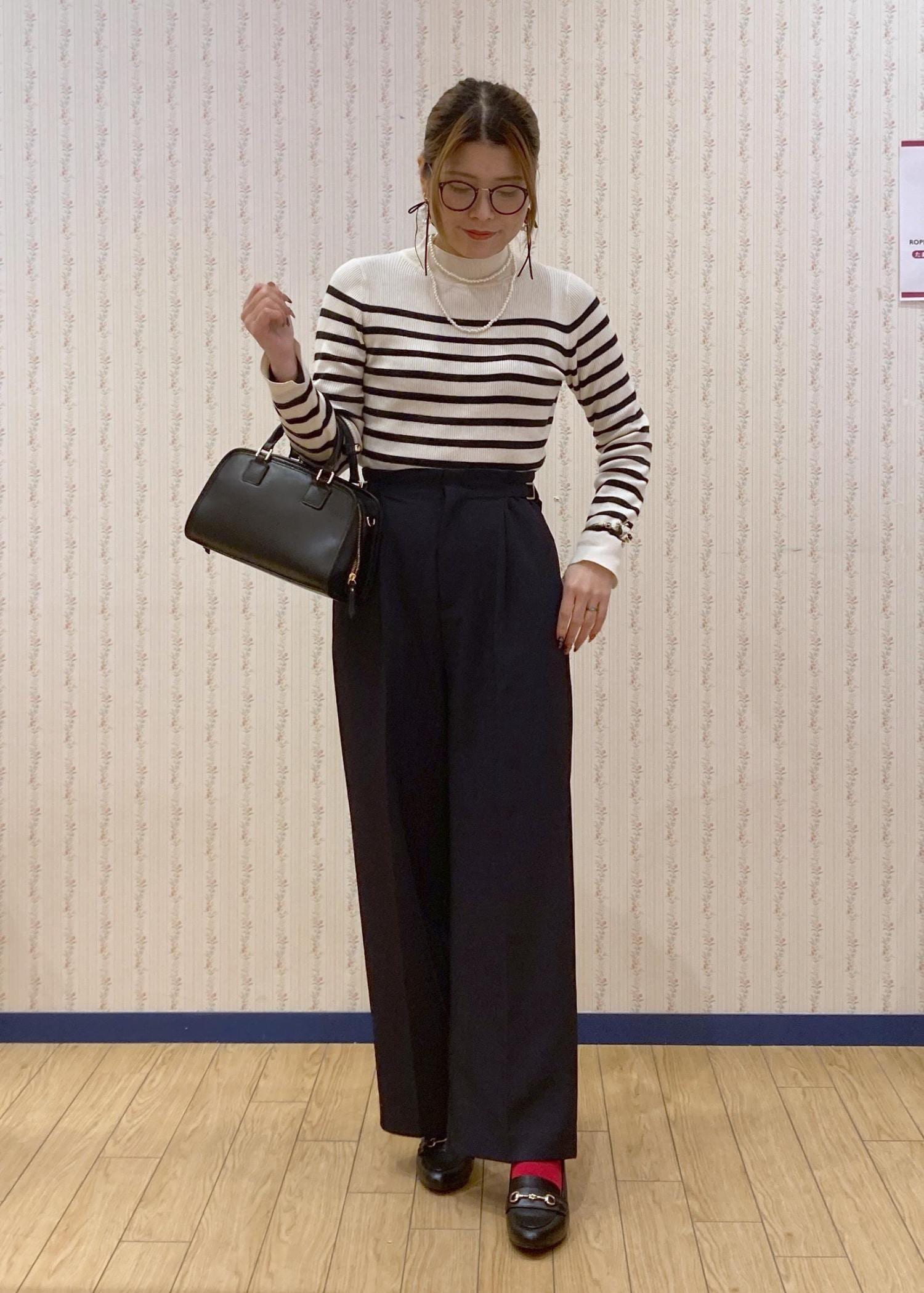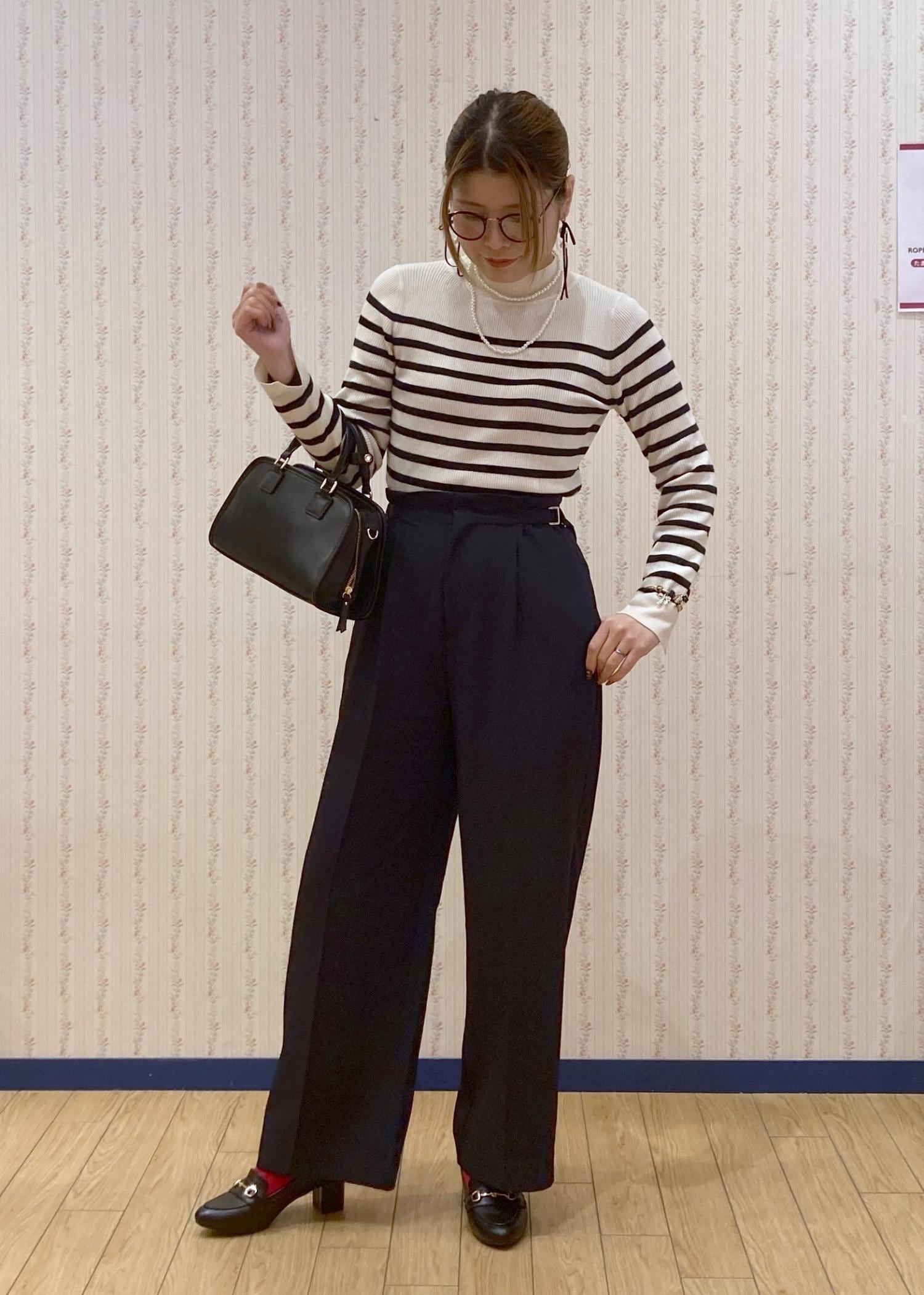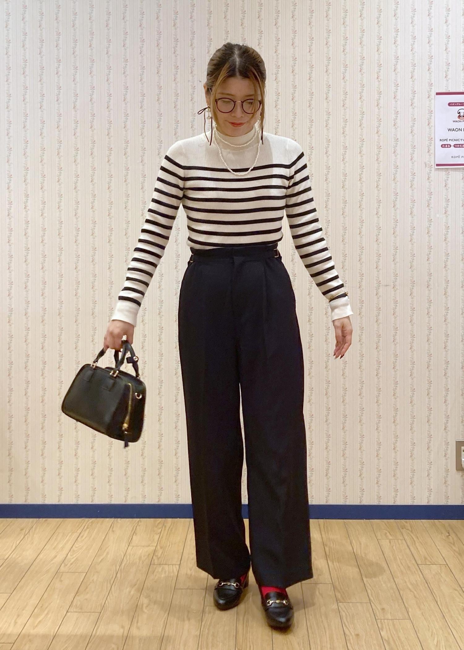 タイトなボーダーリブニットにハイウエストのネイビーワイドパンツをあわせたシンプルなオフィスカジュアルコーディネートです!