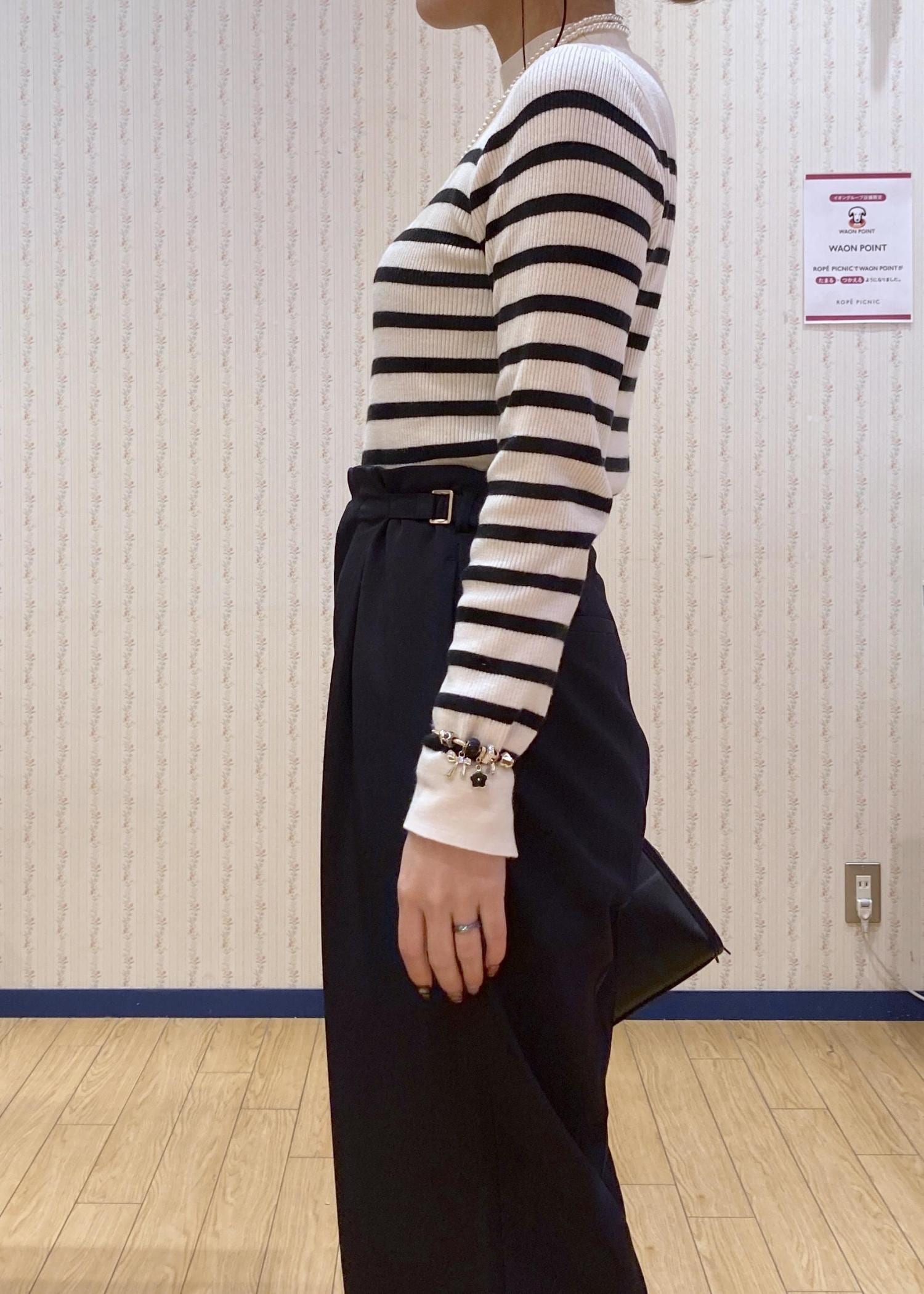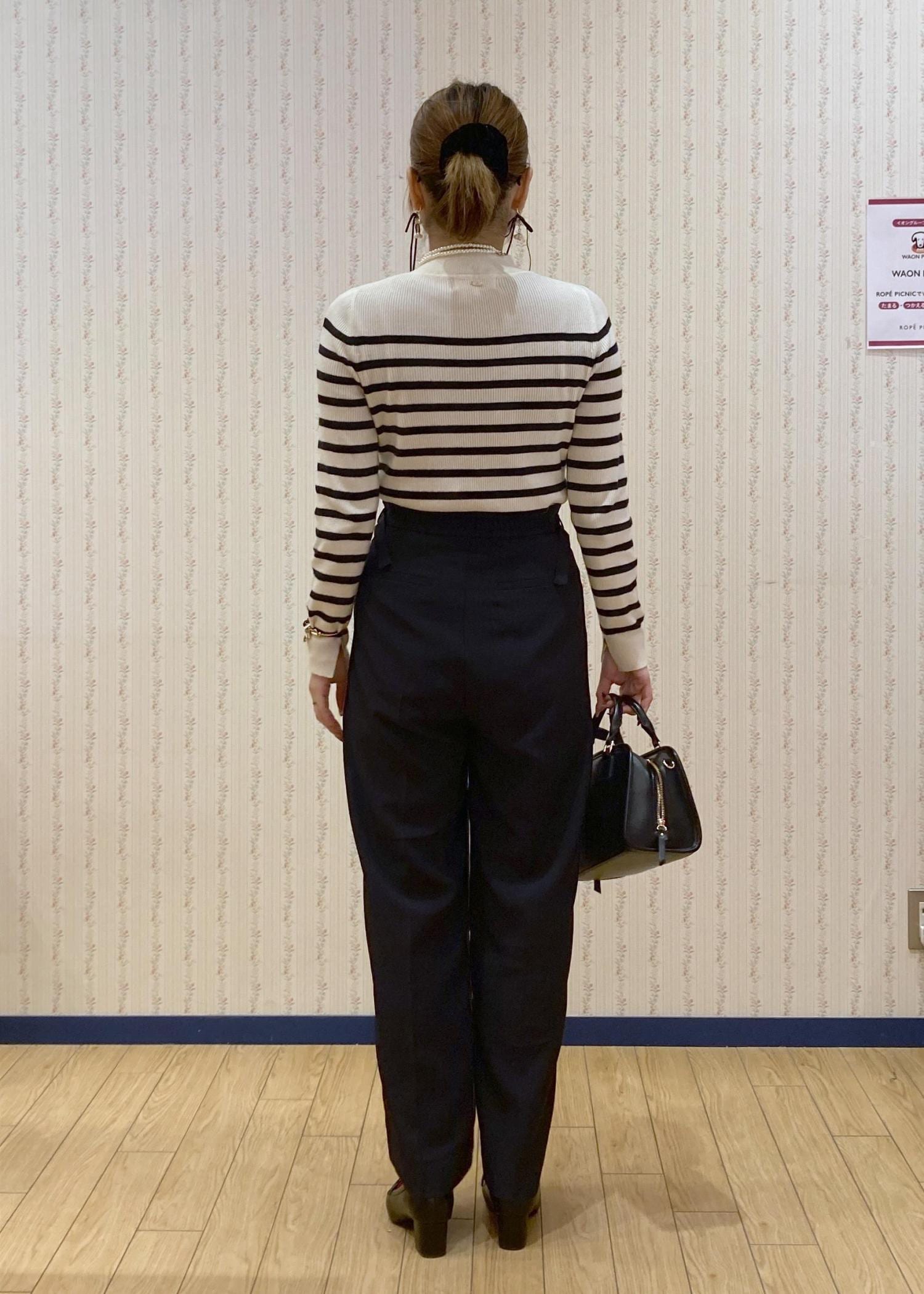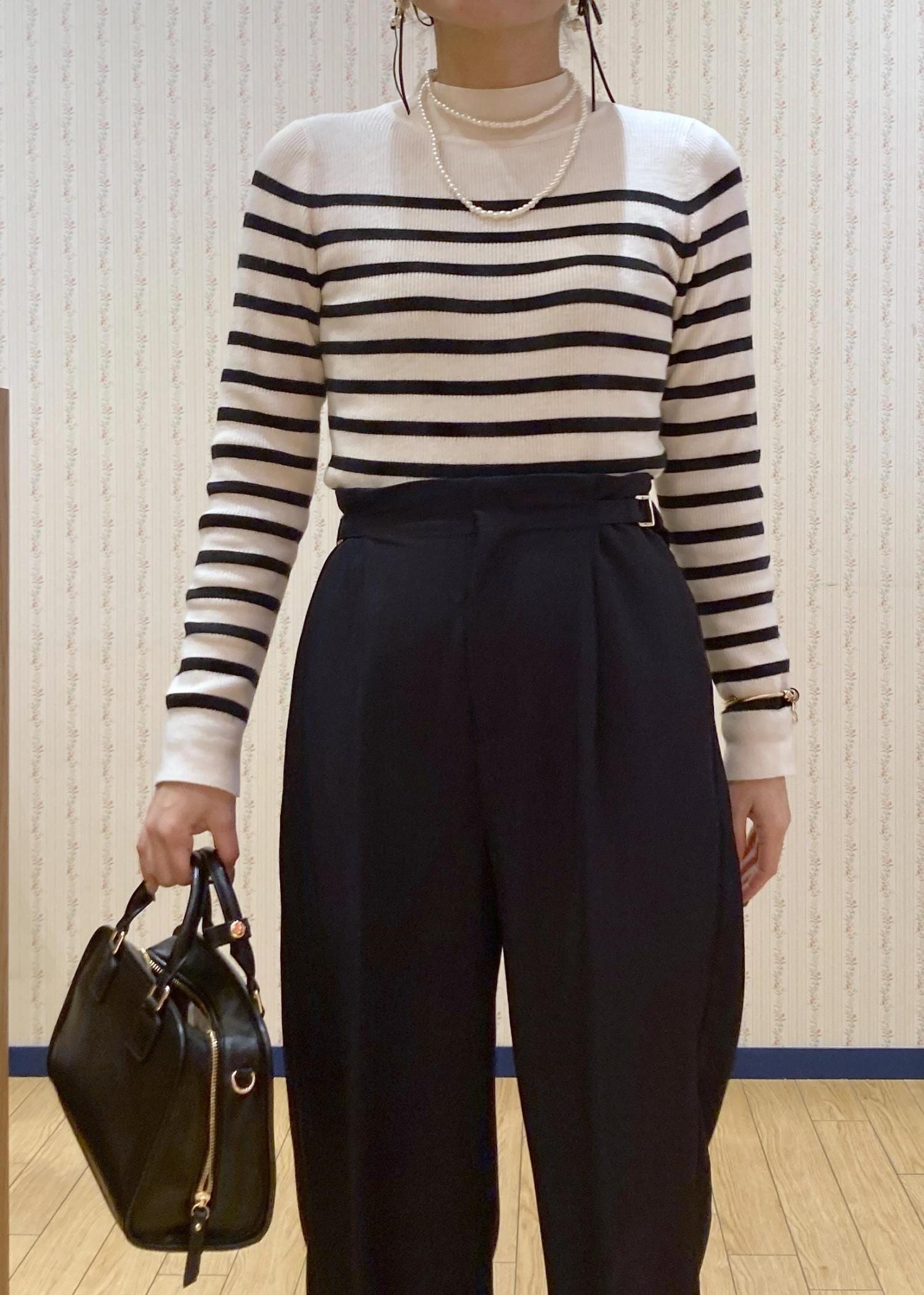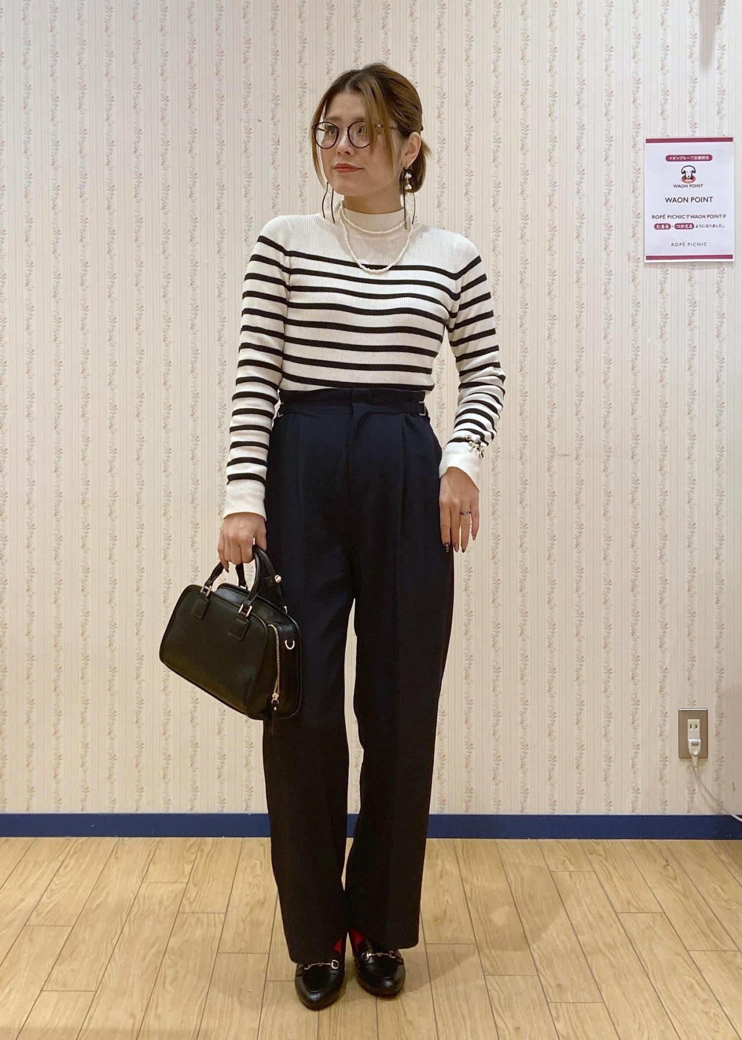 タイトなボーダーリブニットにハイウエストのネイビーワイドパンツをあわせたシンプルなオフィスカジュアルコーディネートです!
